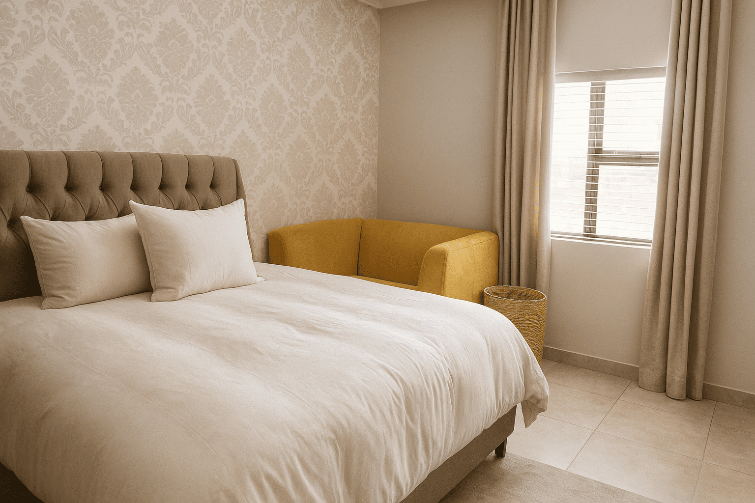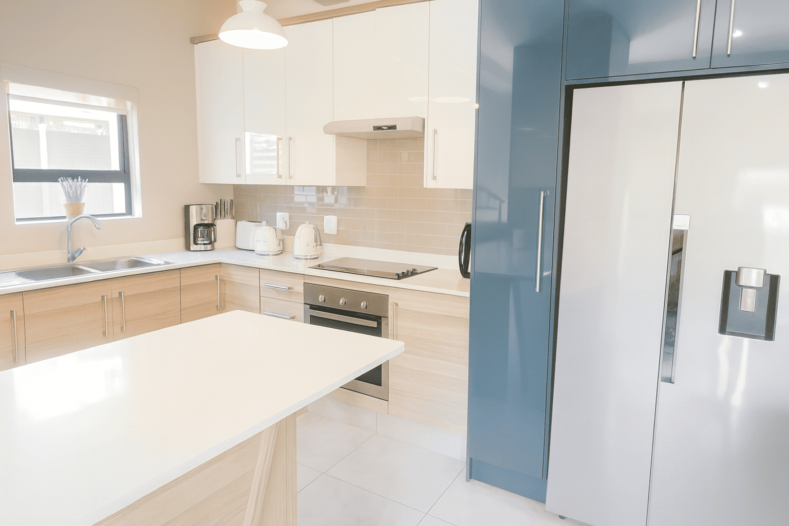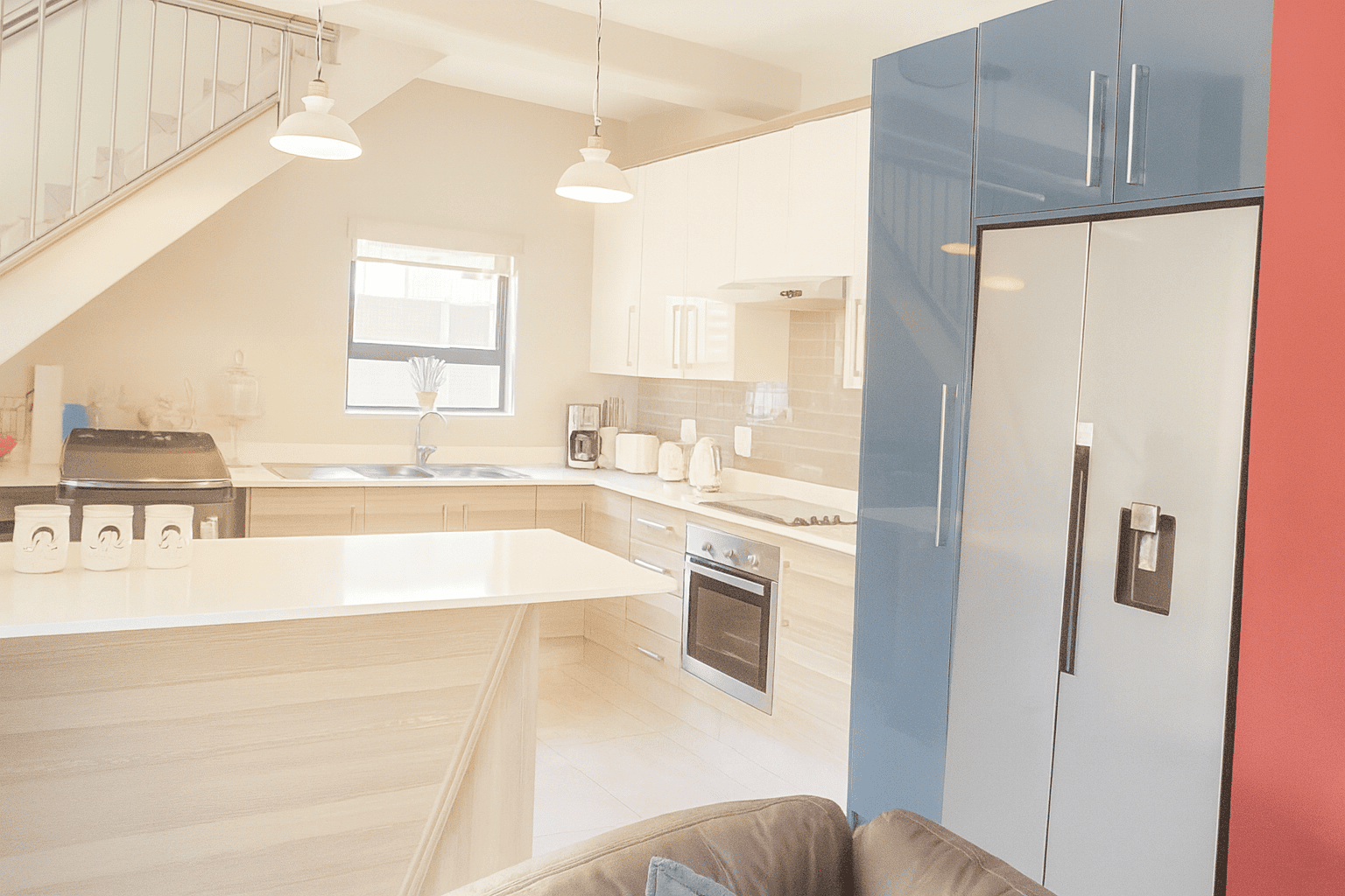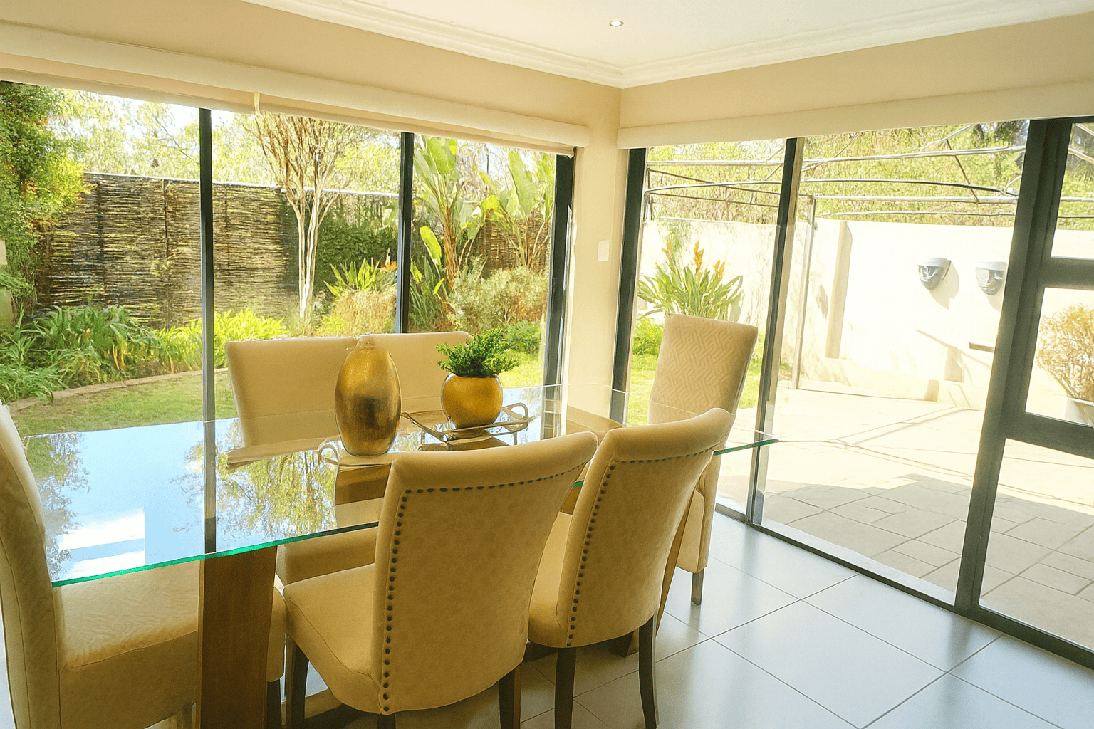 Discover this modern 4-bedroom residence nestled within a secure complex in Equestria, Pretoria. The property impresses with its contemporary architectural design, featuring a light-colored facade and a paved driveway leading to a spacious double garage. Inside, an inviting open-plan layout seamlessly connects the living, dining, and kitchen areas, fostering spaciousness. Abundant natural light floods these areas through large windows and sliding doors, complementing sleek tiled flooring. The contemporary kitchen boasts white cabinetry, perfectly integrated into the home's stylish aesthetic, with distinct accent walls adding character.
