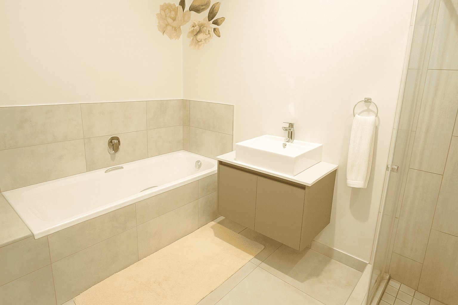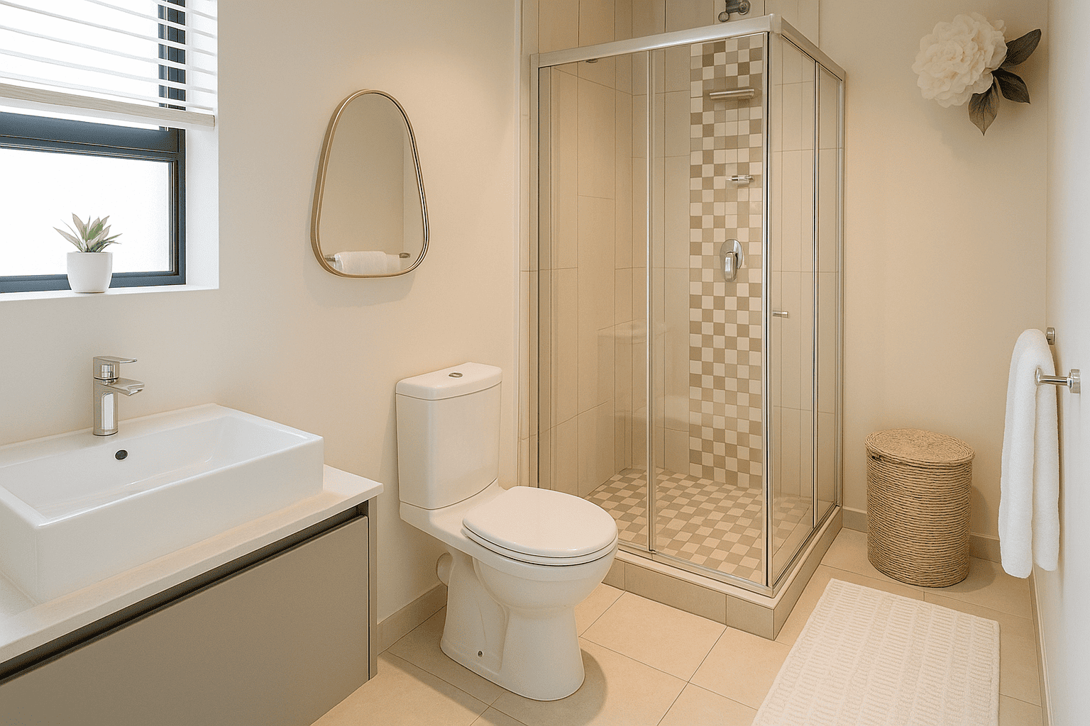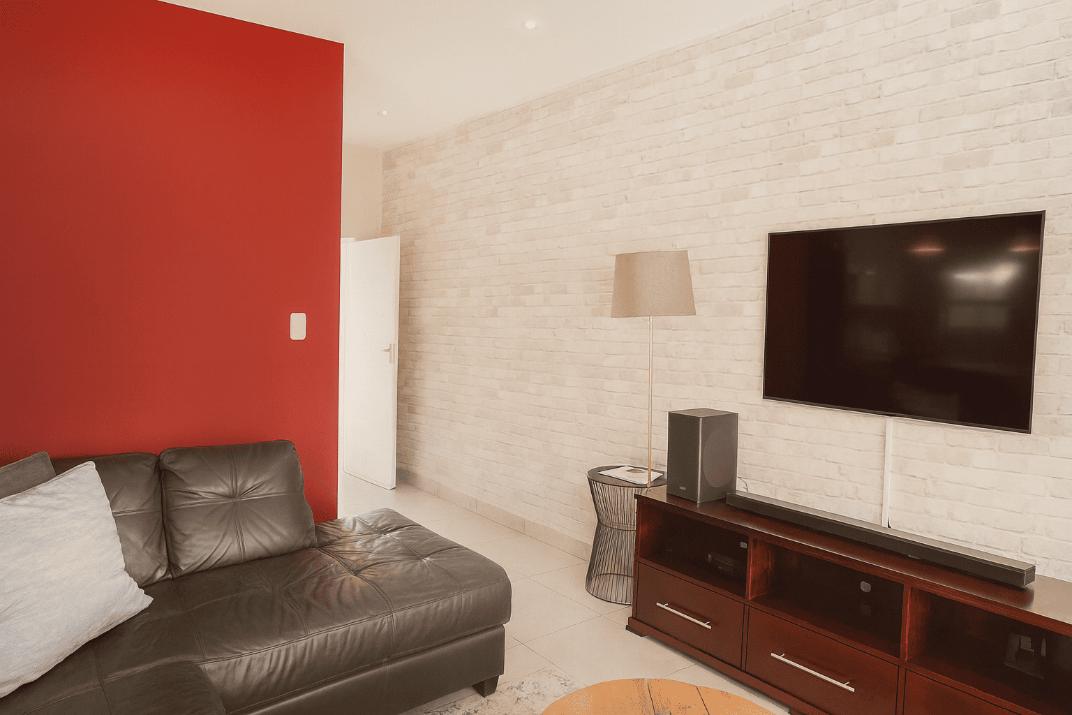This home offers versatile living with a comfortable lounge and a dedicated family TV room. The four well-proportioned bedrooms are designed for comfort, each benefiting from natural light and modern finishes. The property includes 2.5 bathrooms; the main bathroom features a floating vanity with a vessel sink, a built-in bathtub, and a glass-enclosed shower, all in a clean, neutral palette. A convenient guest toilet, complete with a stylish brick accent wall, serves the ground floor.