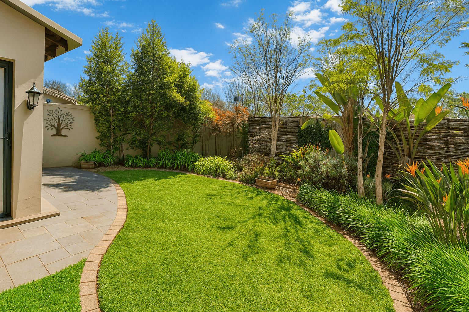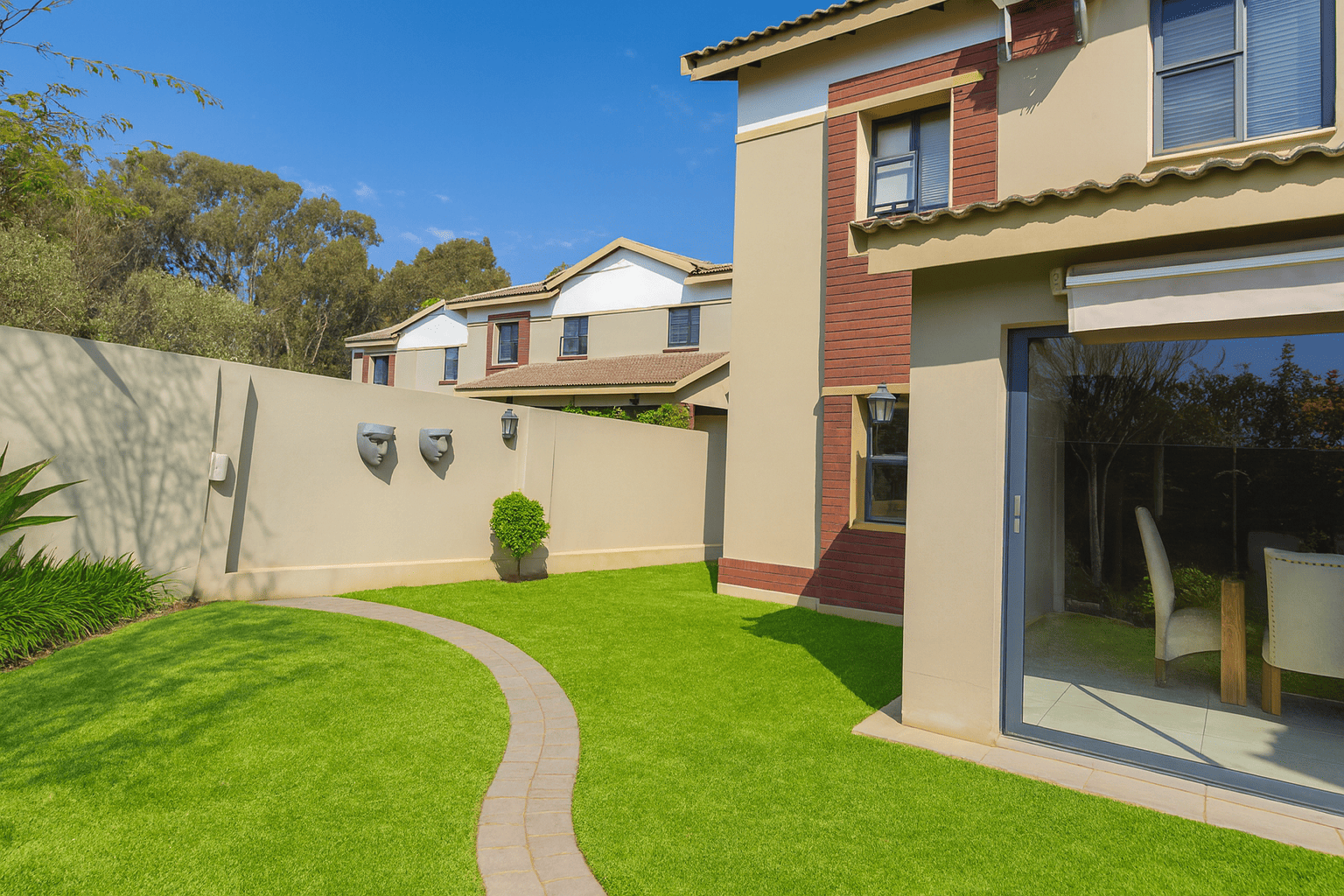 Embrace outdoor living with a private garden and a paved patio, directly accessible from the main living areas via sliding doors. This outdoor space provides a tranquil retreat for relaxation or entertaining, set against a lush green backdrop. The property is also pet-friendly, allowing furry companions to enjoy the garden.