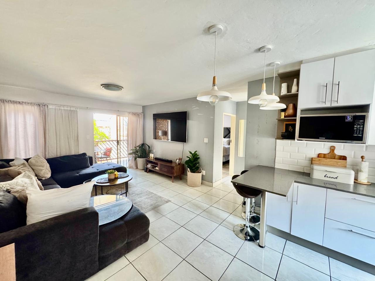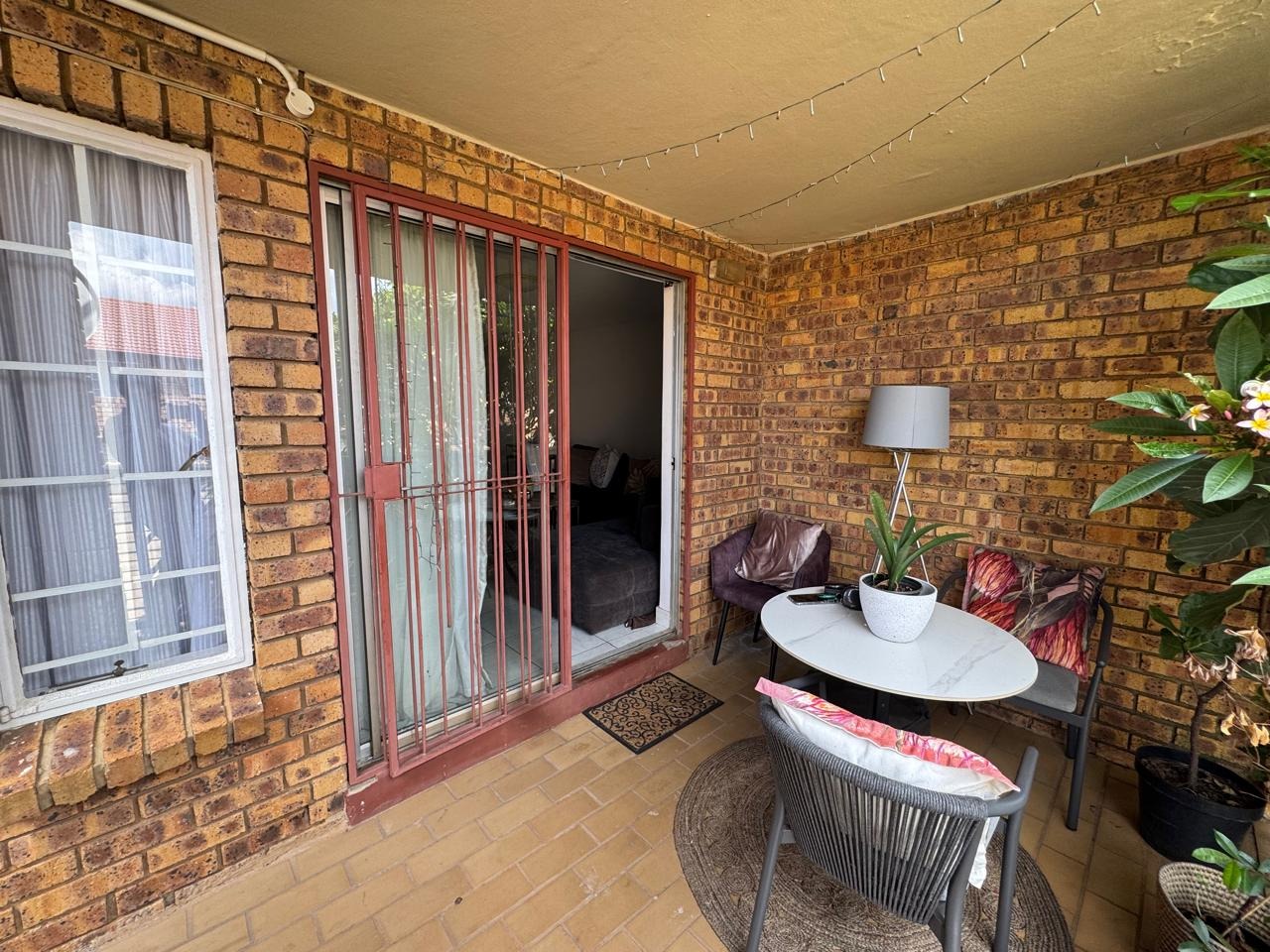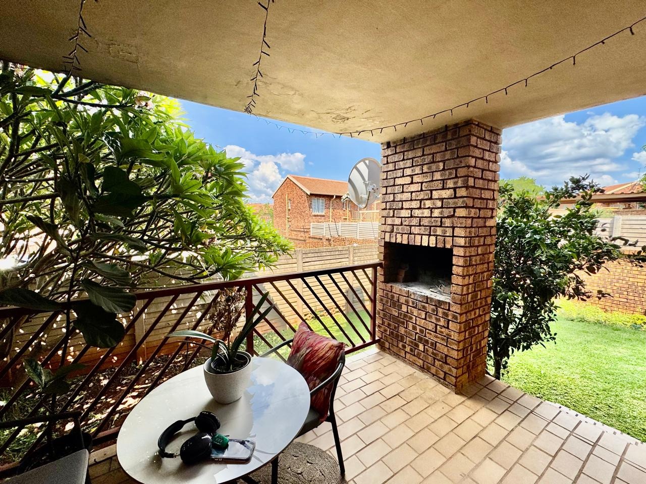 The living room opens through a sliding door onto a private patio featuring a built-in braai, overlooking a neatly walled garden.