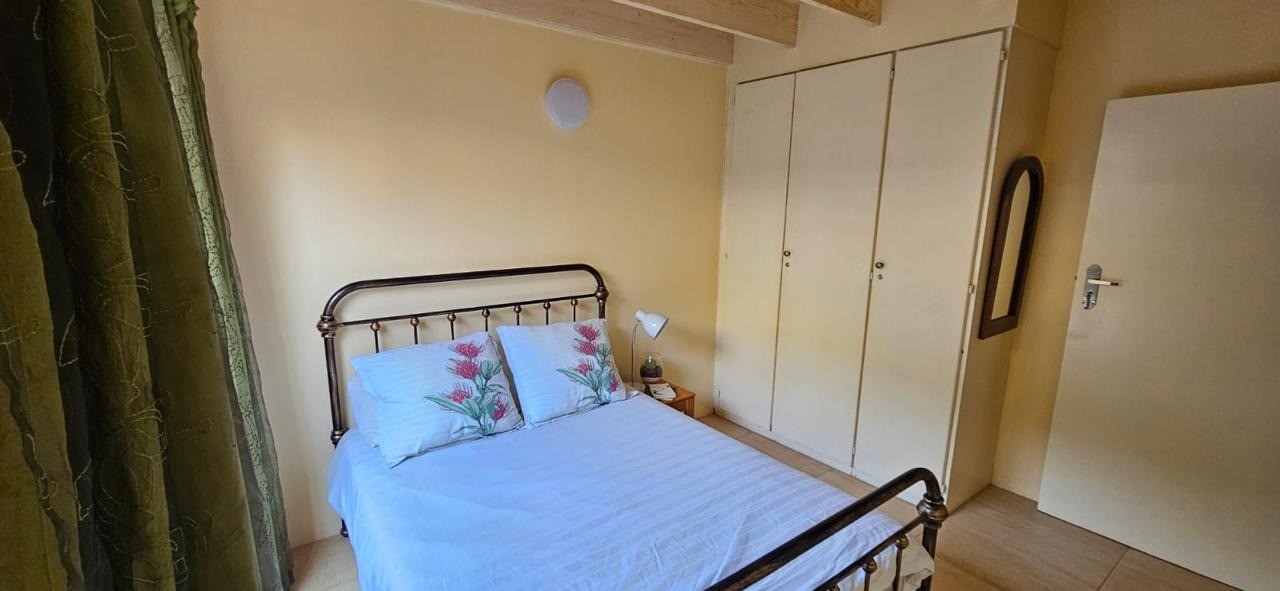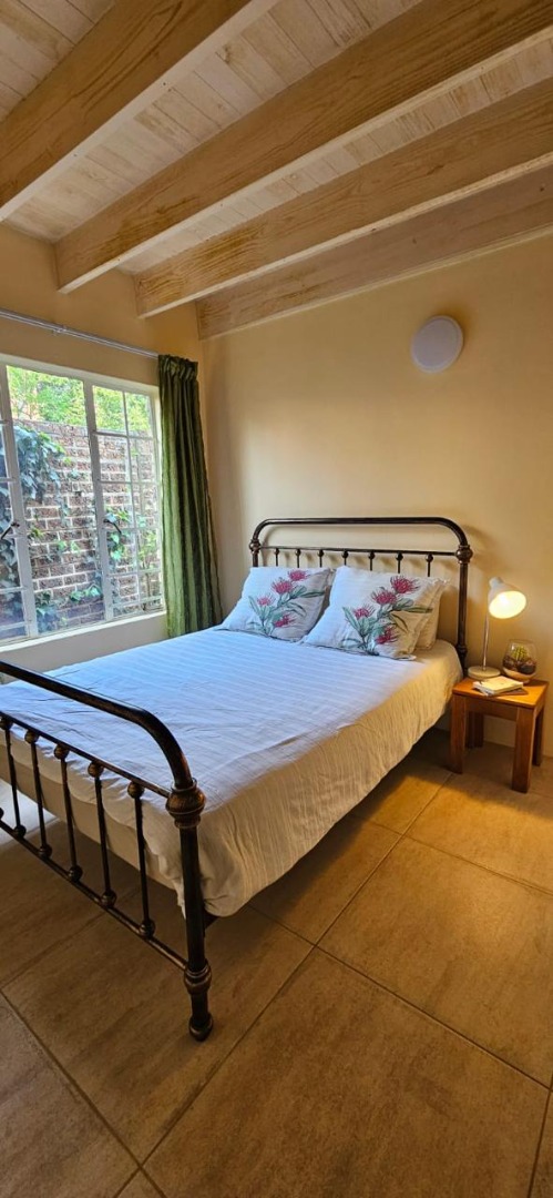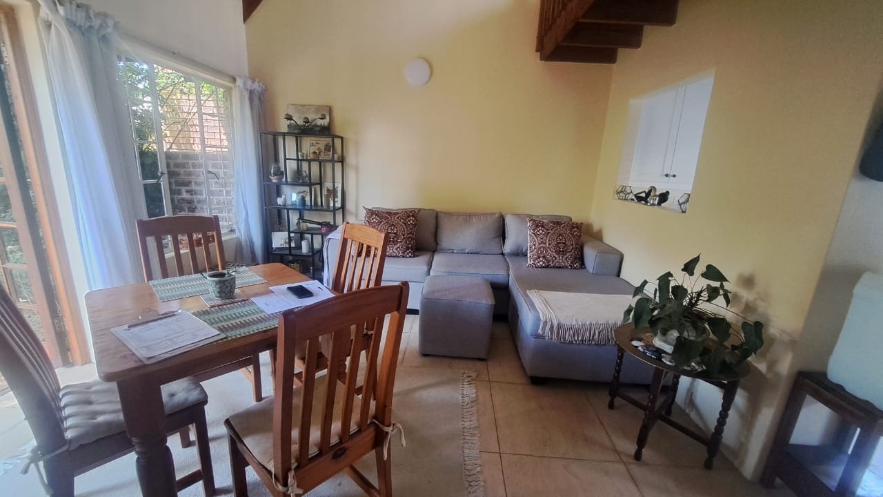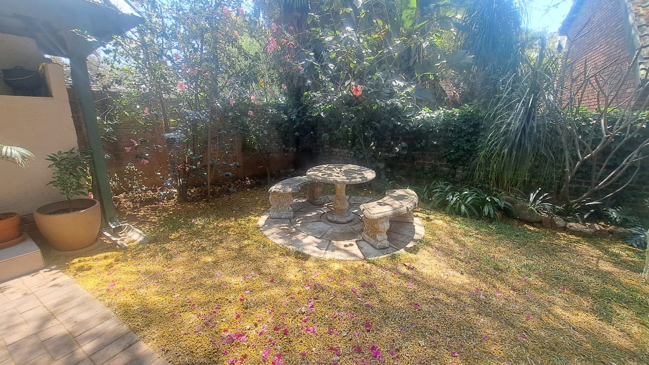 Discover this charming 3-bedroom, 2-bathroom residence nestled within a secure complex in the sought-after Faerie Glen suburb of Pretoria. The property immediately impresses with its inviting brick exterior, adorned with climbing flowering plants, and a distinctive covered porch featuring a green tiled roof. Mature trees provide natural shade around the house.