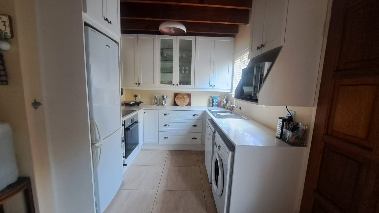 Inside, the functional layout includes a comfortable lounge, a dedicated dining room, and a family TV room, offering living spaces. The modern kitchen is a highlight, boasting white shaker-style cabinetry, light countertops, and tiled flooring. It comes equipped with an integrated oven, induction hob, microwave, dishwasher, and washing machine, complemented by exposed wooden ceiling beams and a convenient pantry.