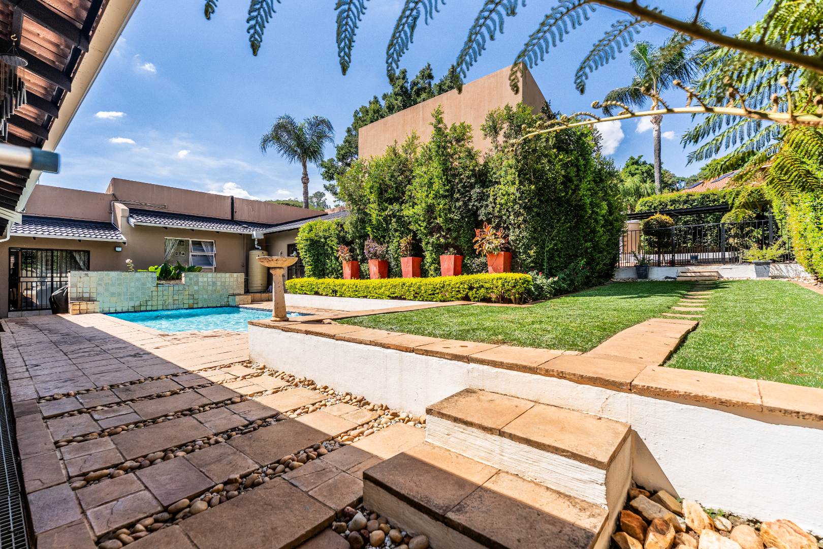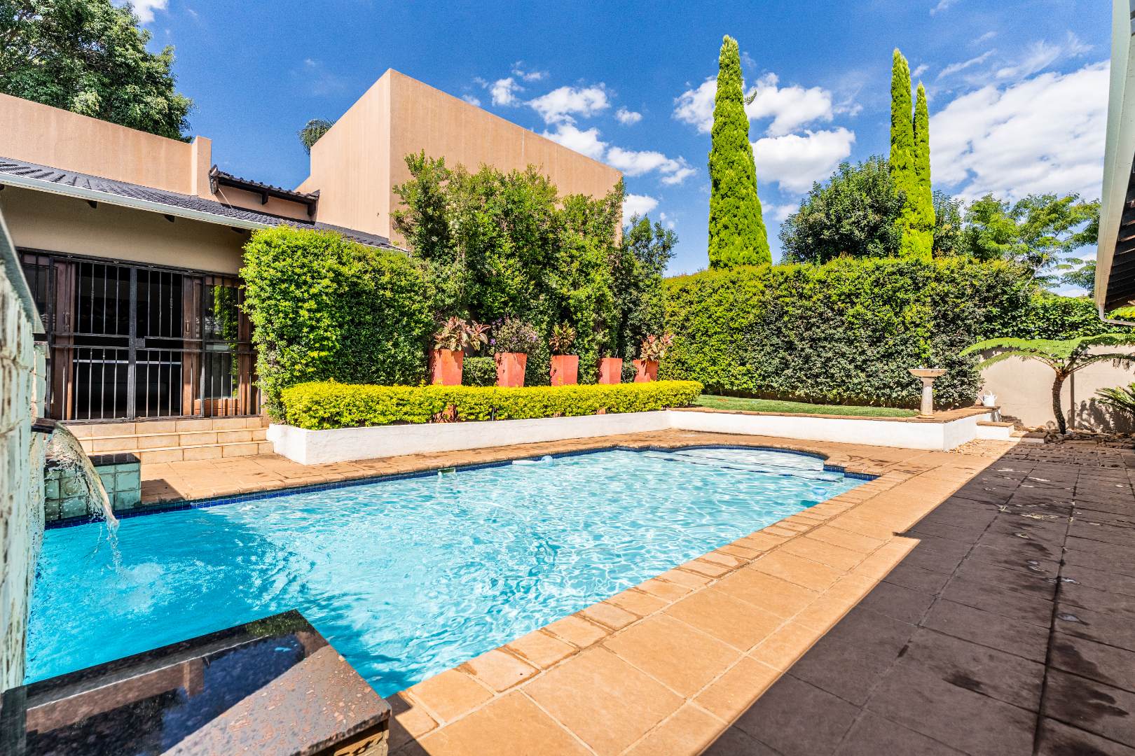 Step into this lovely home in Faerie Glen, Pretoria, where comfort meets convenience. This home was designed with sliding doors all opening onto the pool area giving you a holiday feeling no matter where you move in the house. The home is very private and offers a beautiful garden with irrigation.