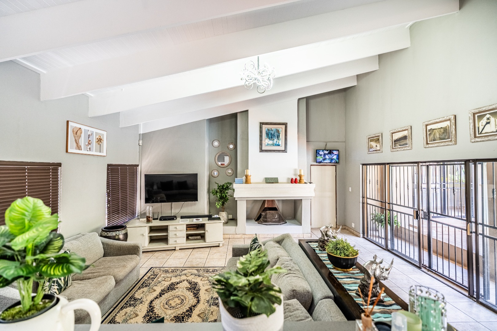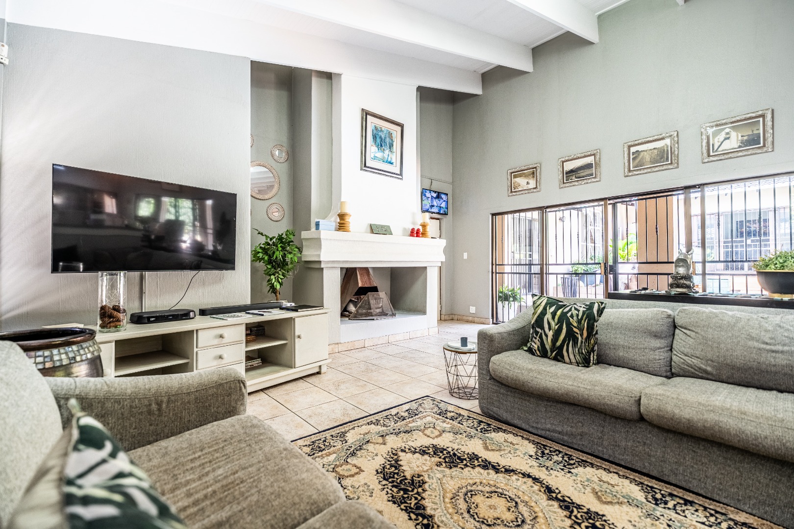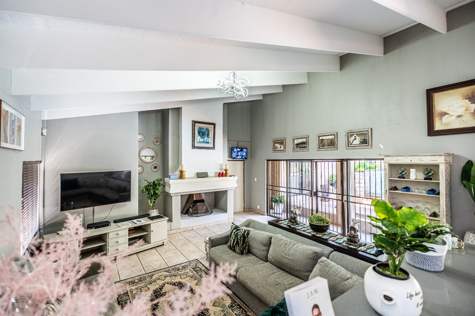 Inside, a charming entrance hall with tiled flooring and double wooden doors sets the tone. You'll find two comfy lounges and a dining room, perfect for family gatherings. The open-plan layout creates a spacious feel, and there's a cozy fireplace for those cooler evenings.