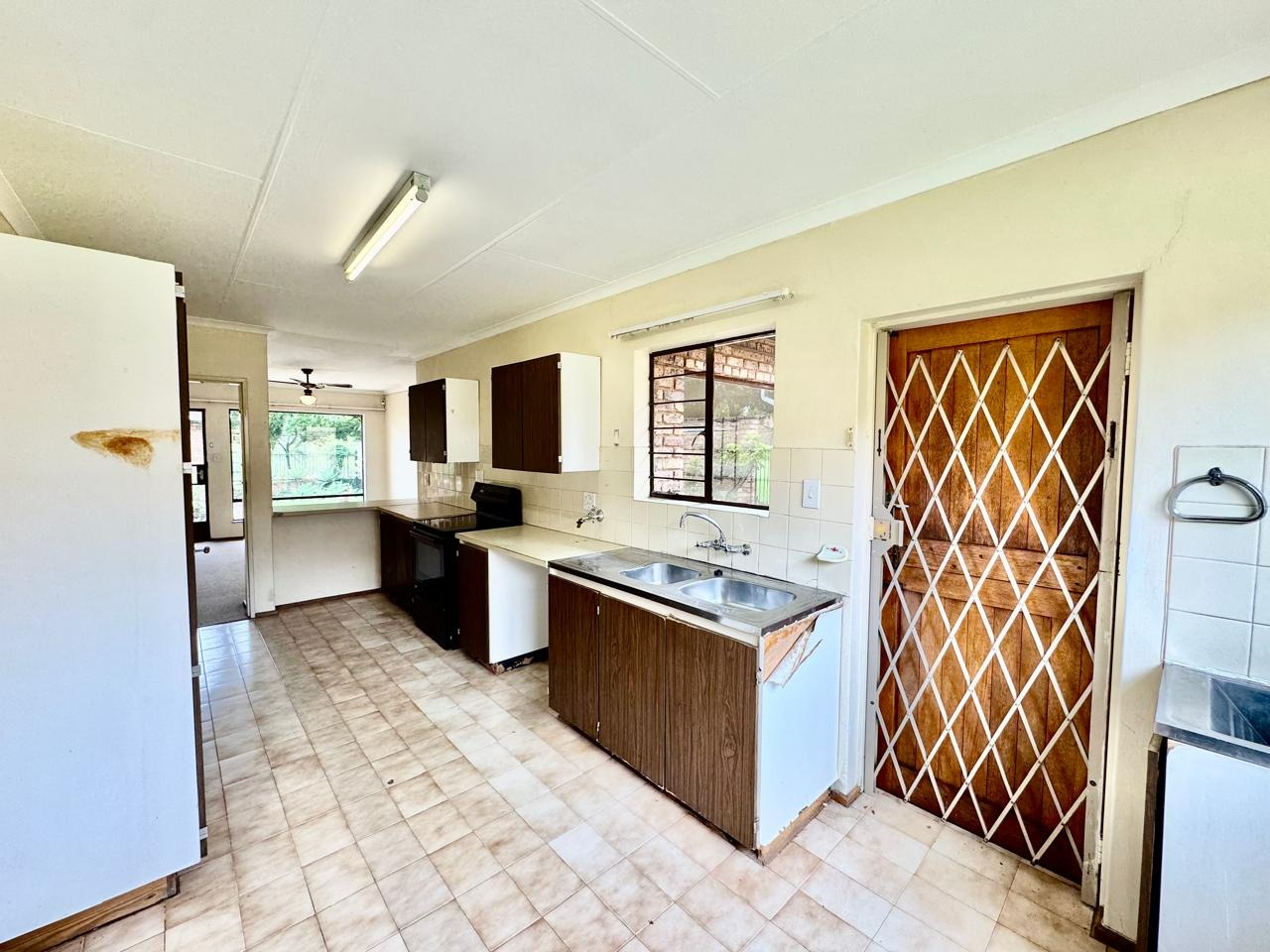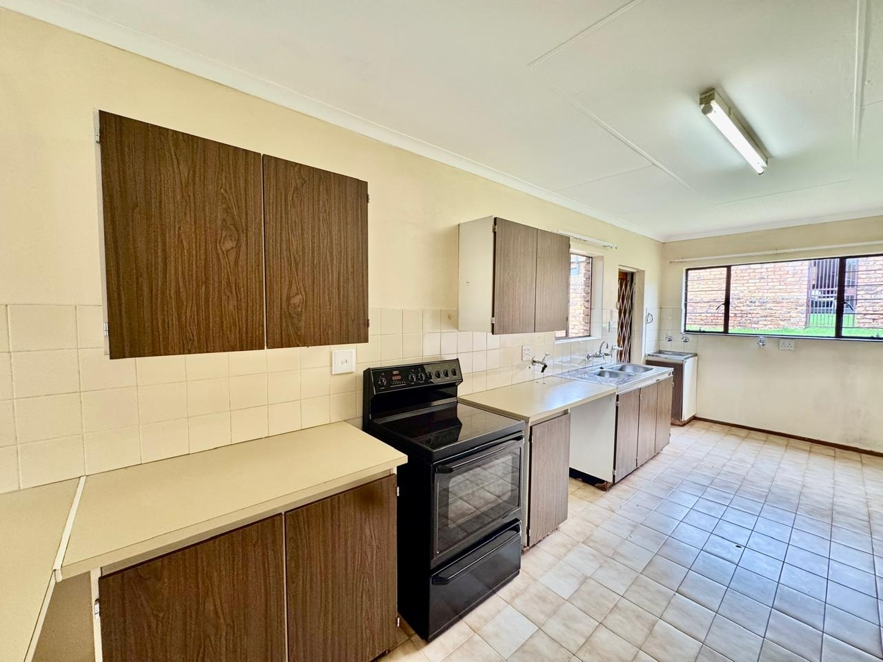 The spacious kitchen is equipped with wooden cupboards, a pantry, and an upright stove, providing ample storage and functionality.