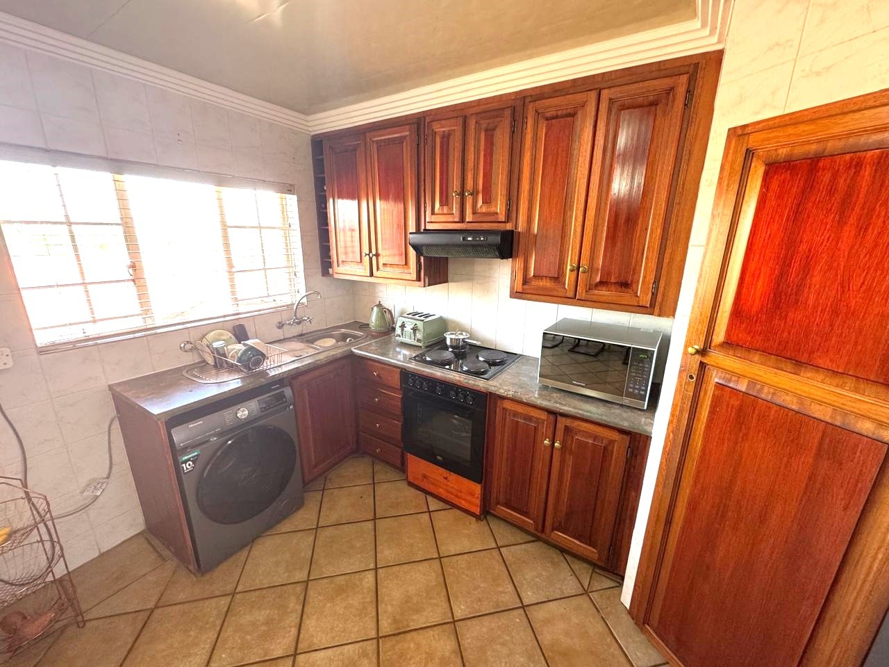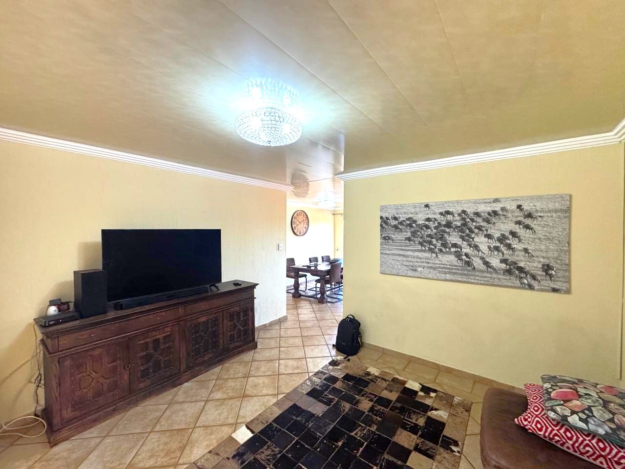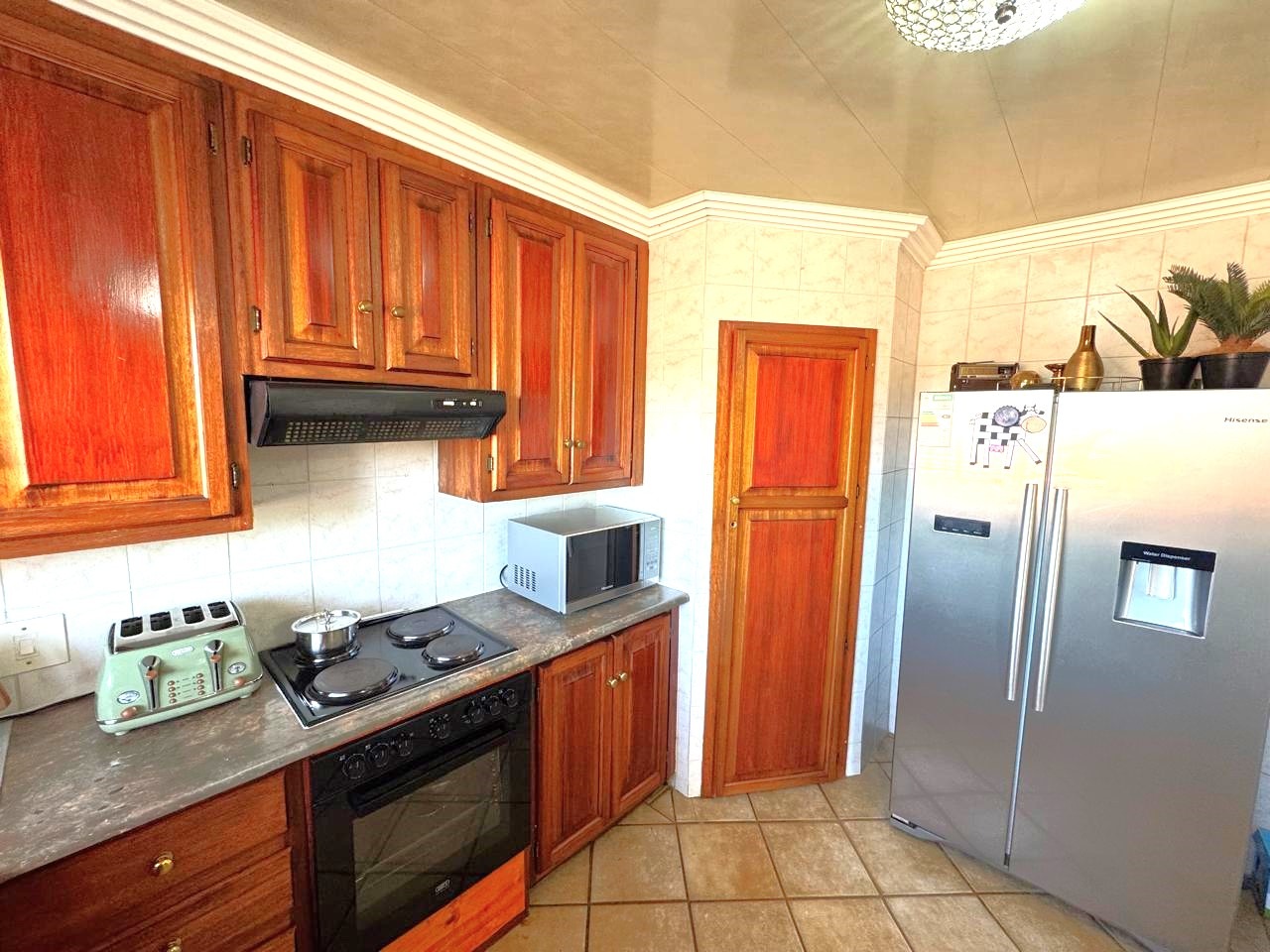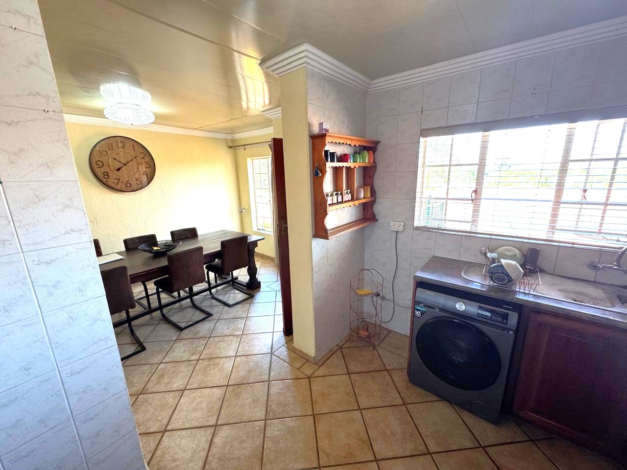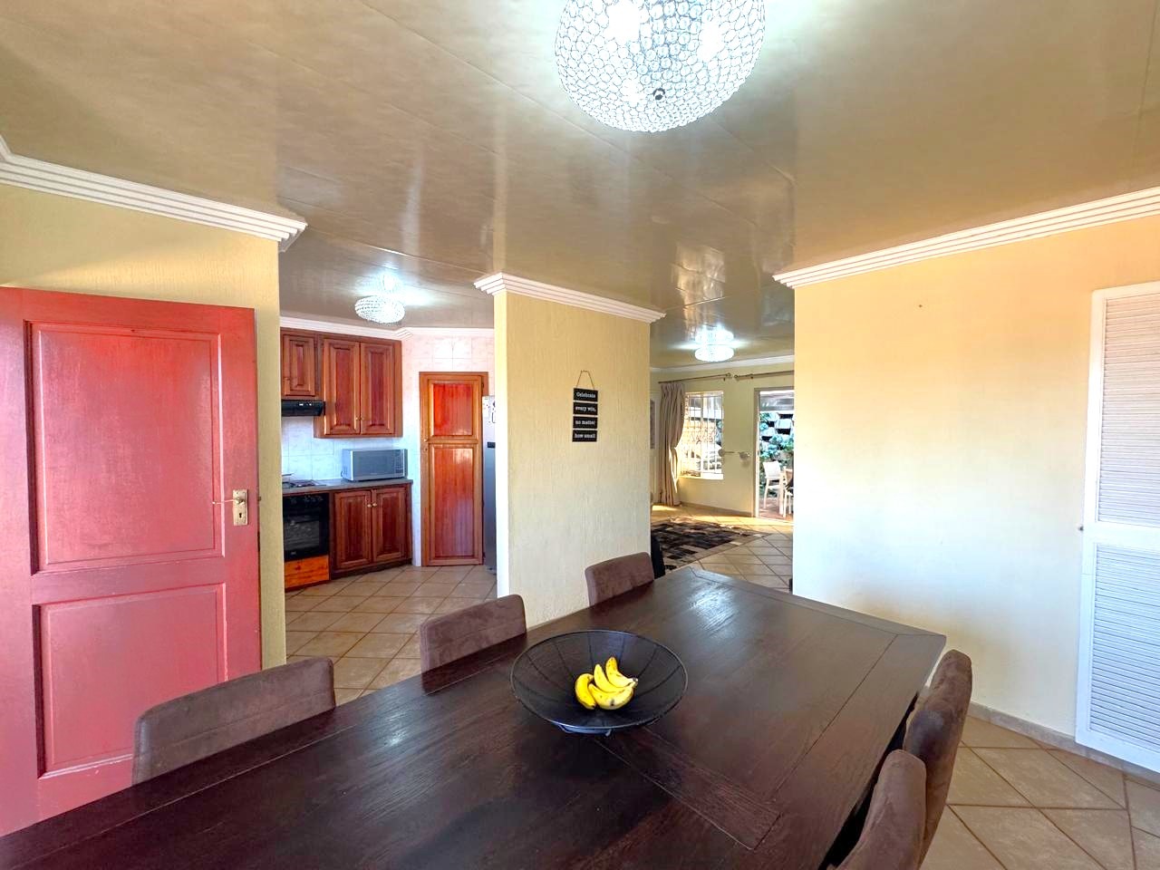 The open-plan kitchen is fitted with wooden cupboards and a pantry, flowing into spacious living areas.
