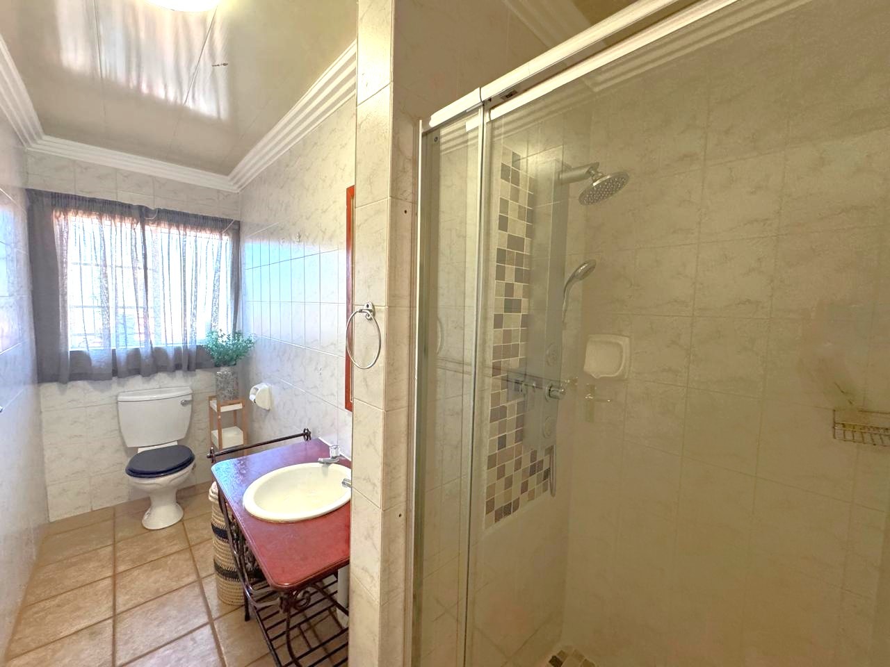 Two bathrooms (main en suite with a walk-in shower, toilet, and basin).