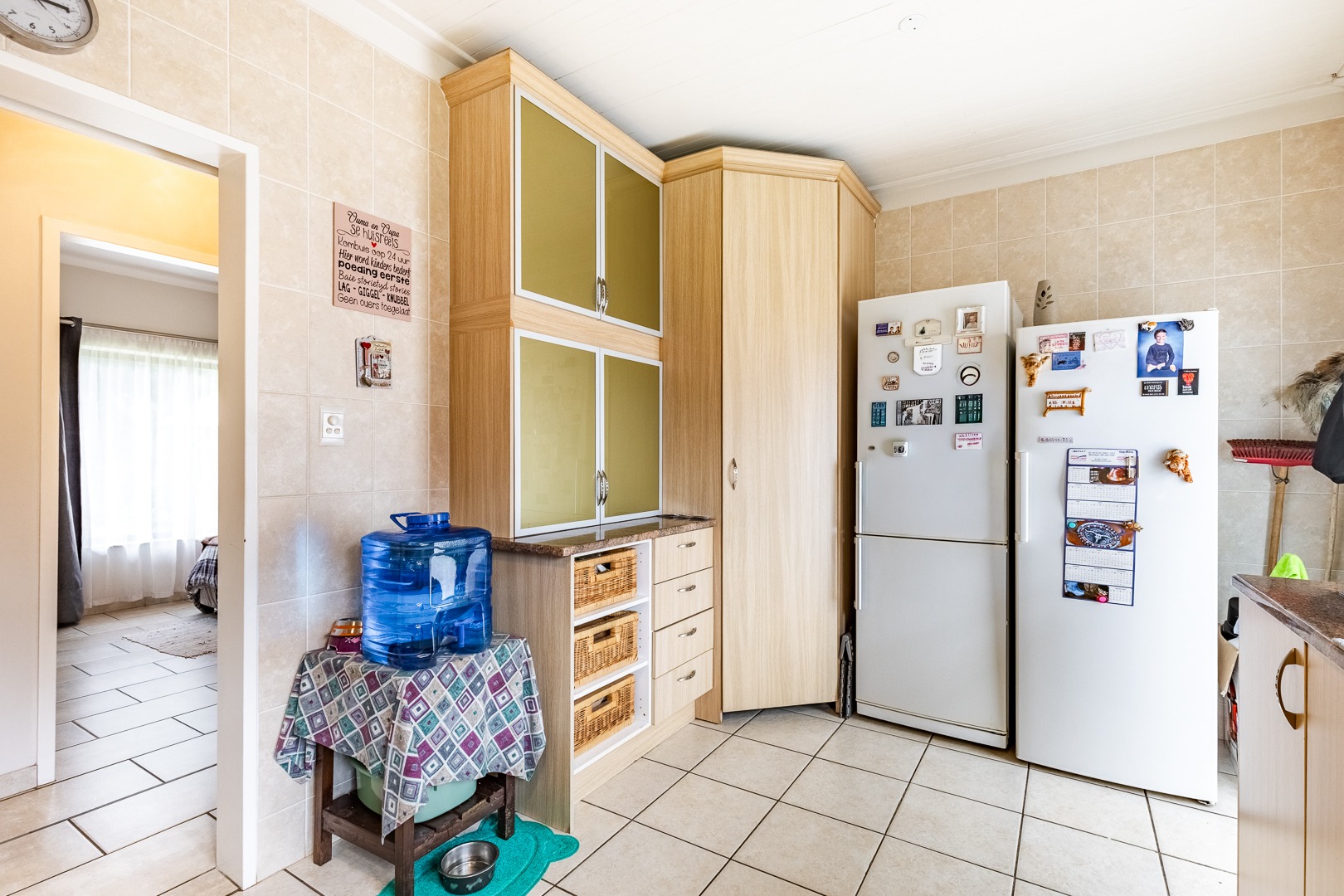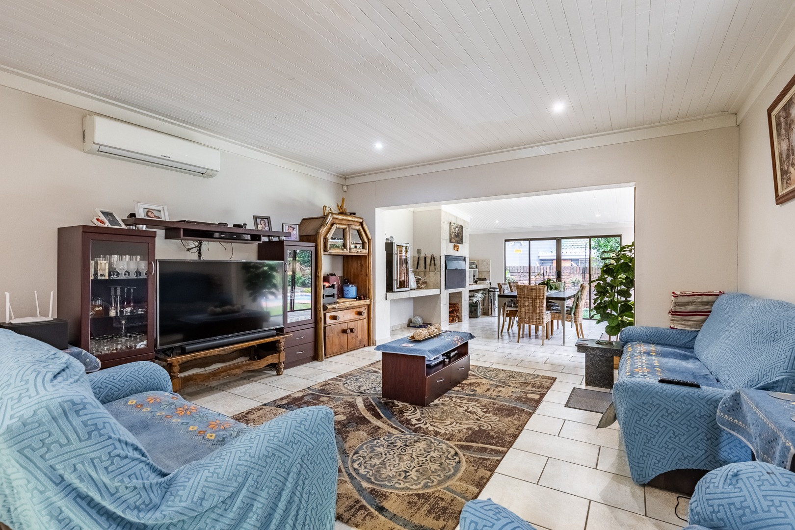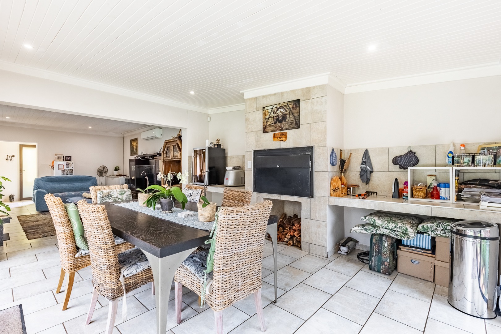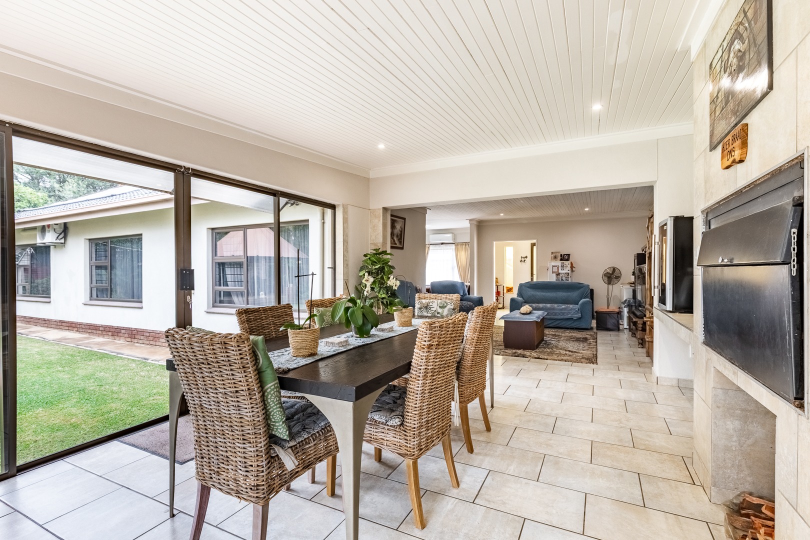 The home offers a spacious living area, and the owner has enclosed the patio and converted it into a dining room with a built-in braai, creating a versatile entertainment space that can be enjoyed all year round. The kitchen is well-designed with granite countertops, a separate pantry, a gas stove, and ample space for all your appliances, making it both practical and stylish.