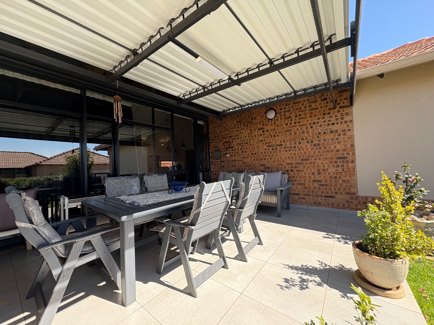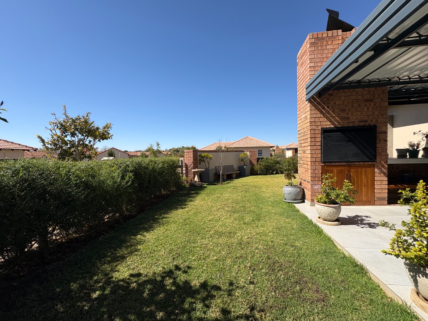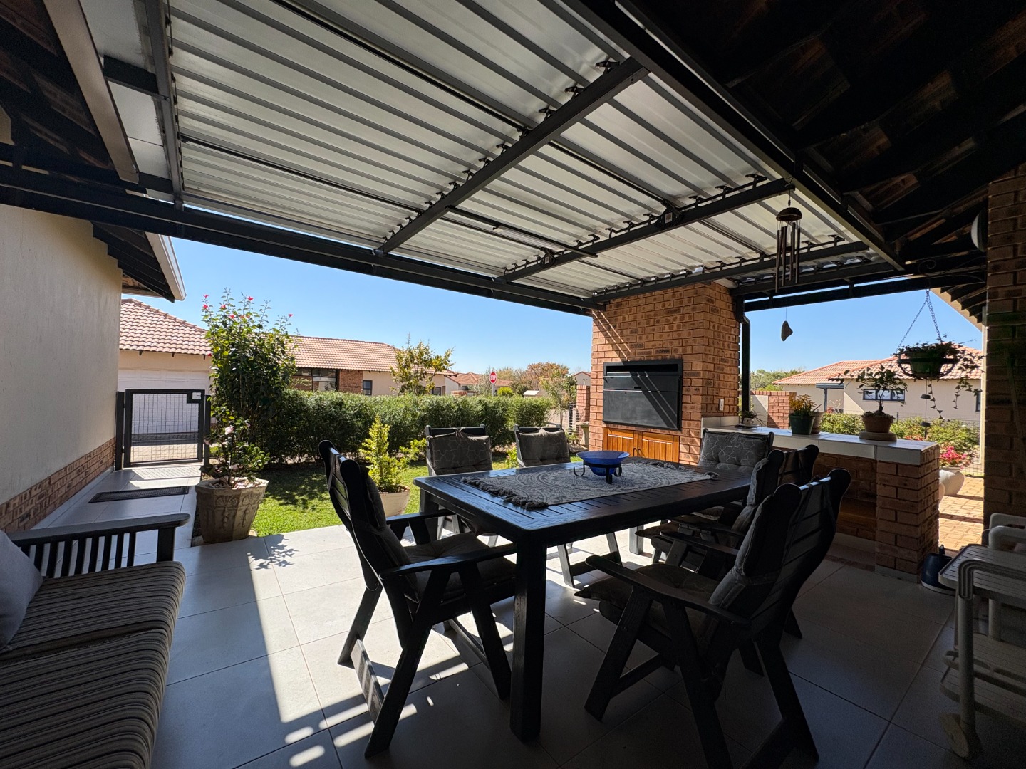 The home also boasts a double garage with an additional covered carport, ensuring ample parking space. Outdoor living is a highlight, with a covered patio and built-in braai overlooking a well-maintained garden.