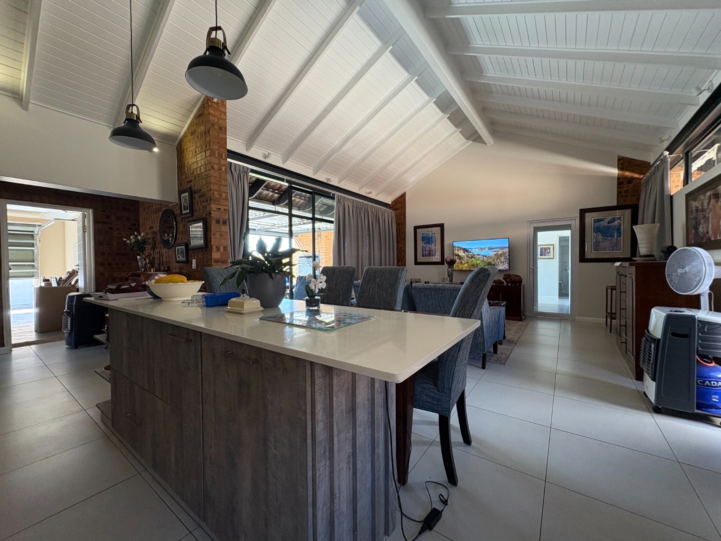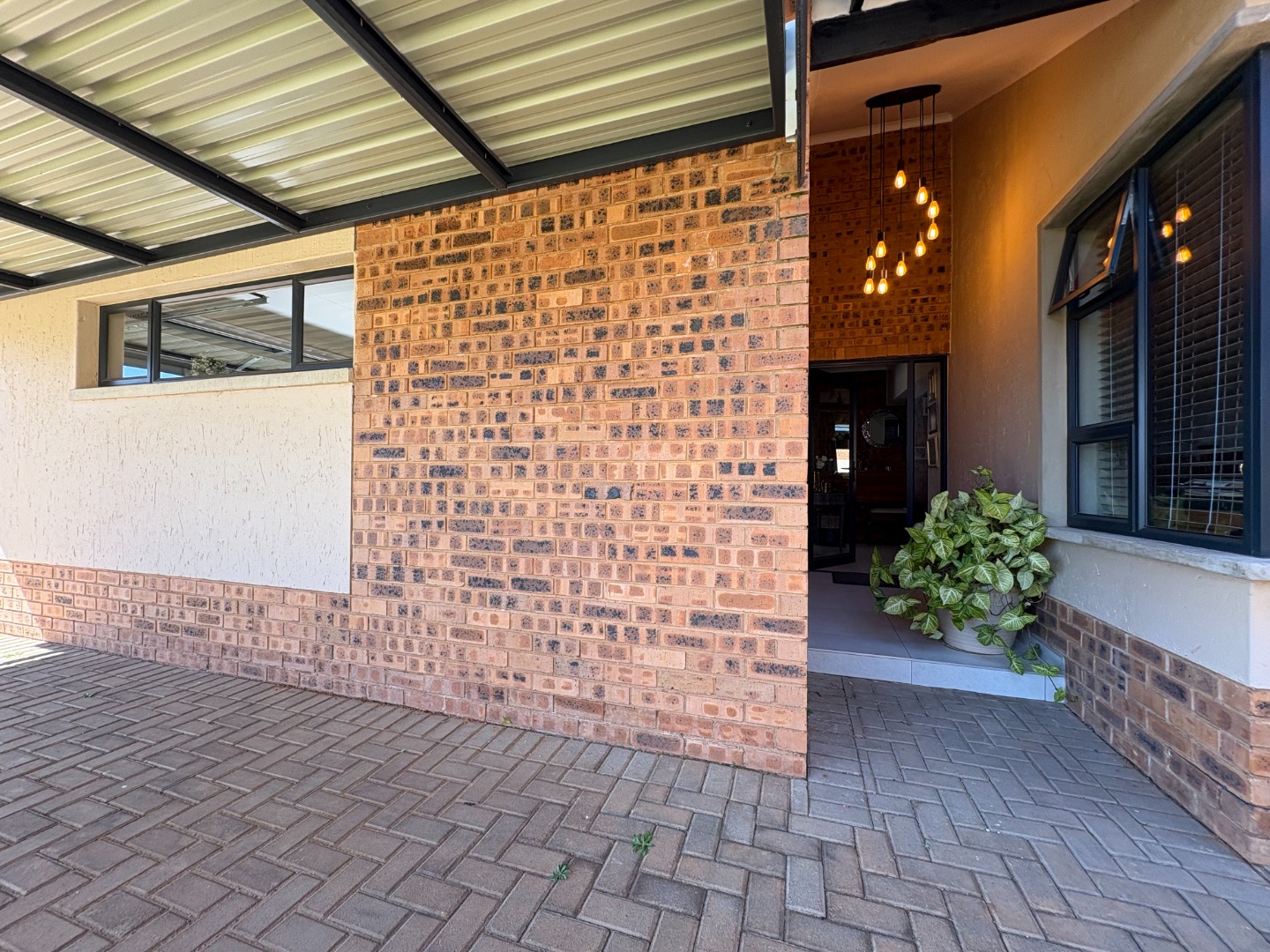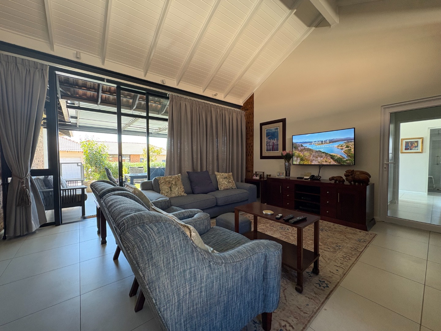 The home also boasts a double garage with an additional covered carport, ensuring ample parking space. Outdoor living is a highlight, with a covered patio and built-in braai overlooking a well-maintained garden.