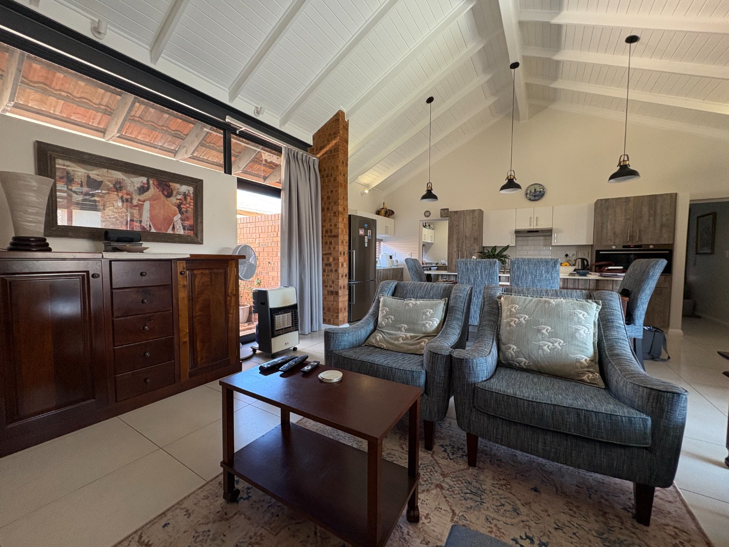 The lounge and dining area create a warm, welcoming atmosphere, seamlessly flowing into a modern kitchen fitted with a gas stove and ample cupboard space. A separate scullery and laundry provide practicality and ease of use.