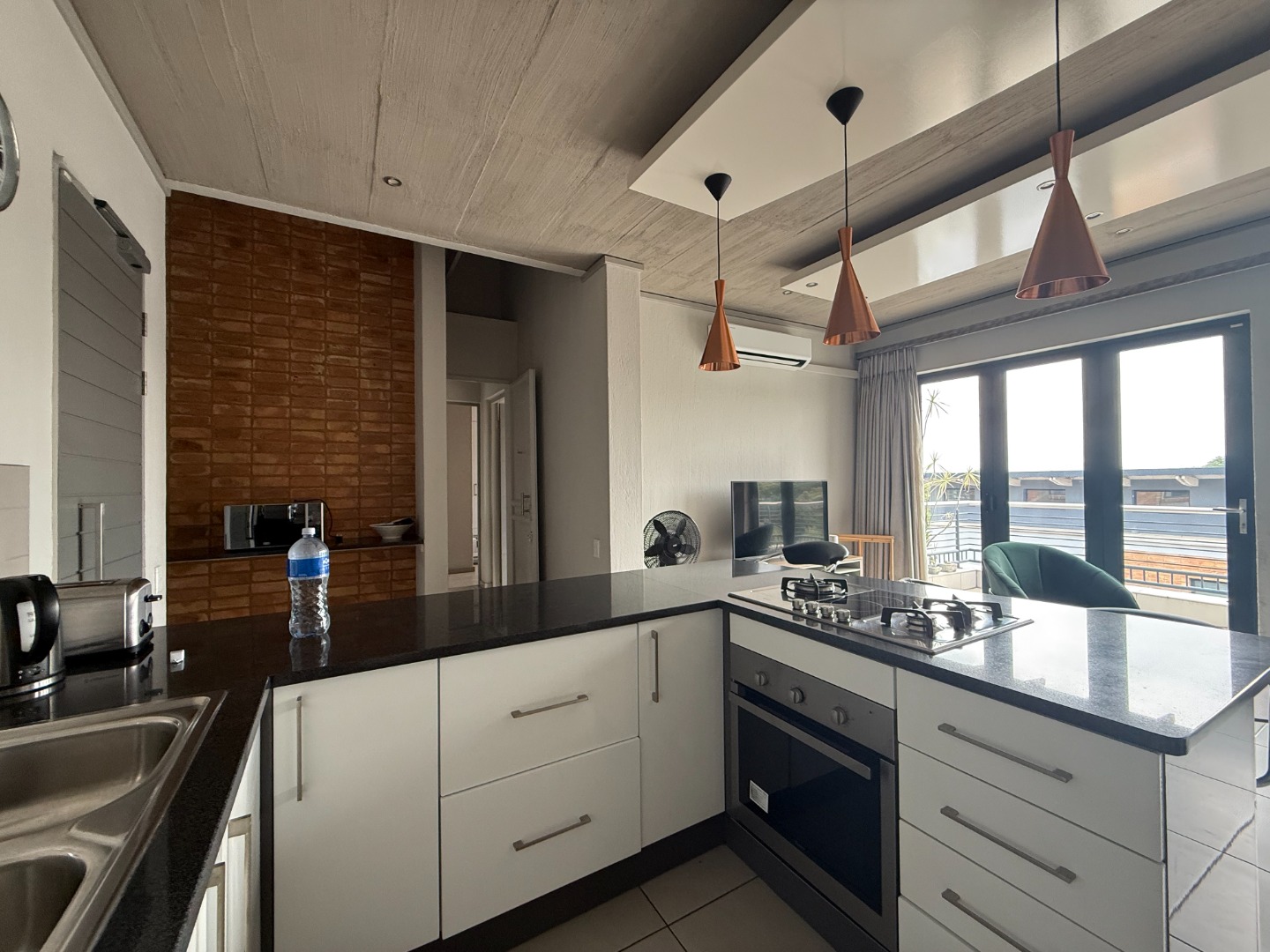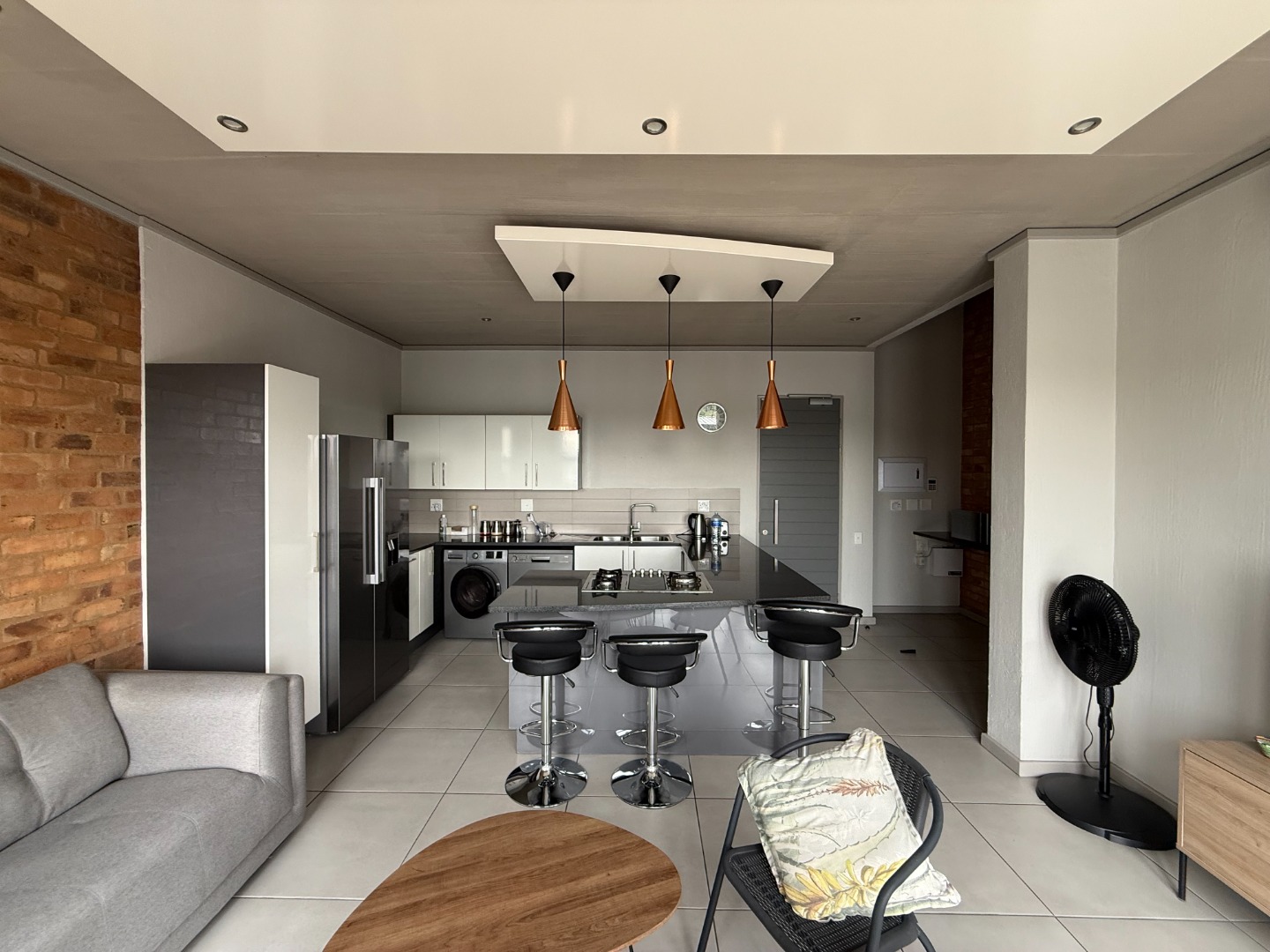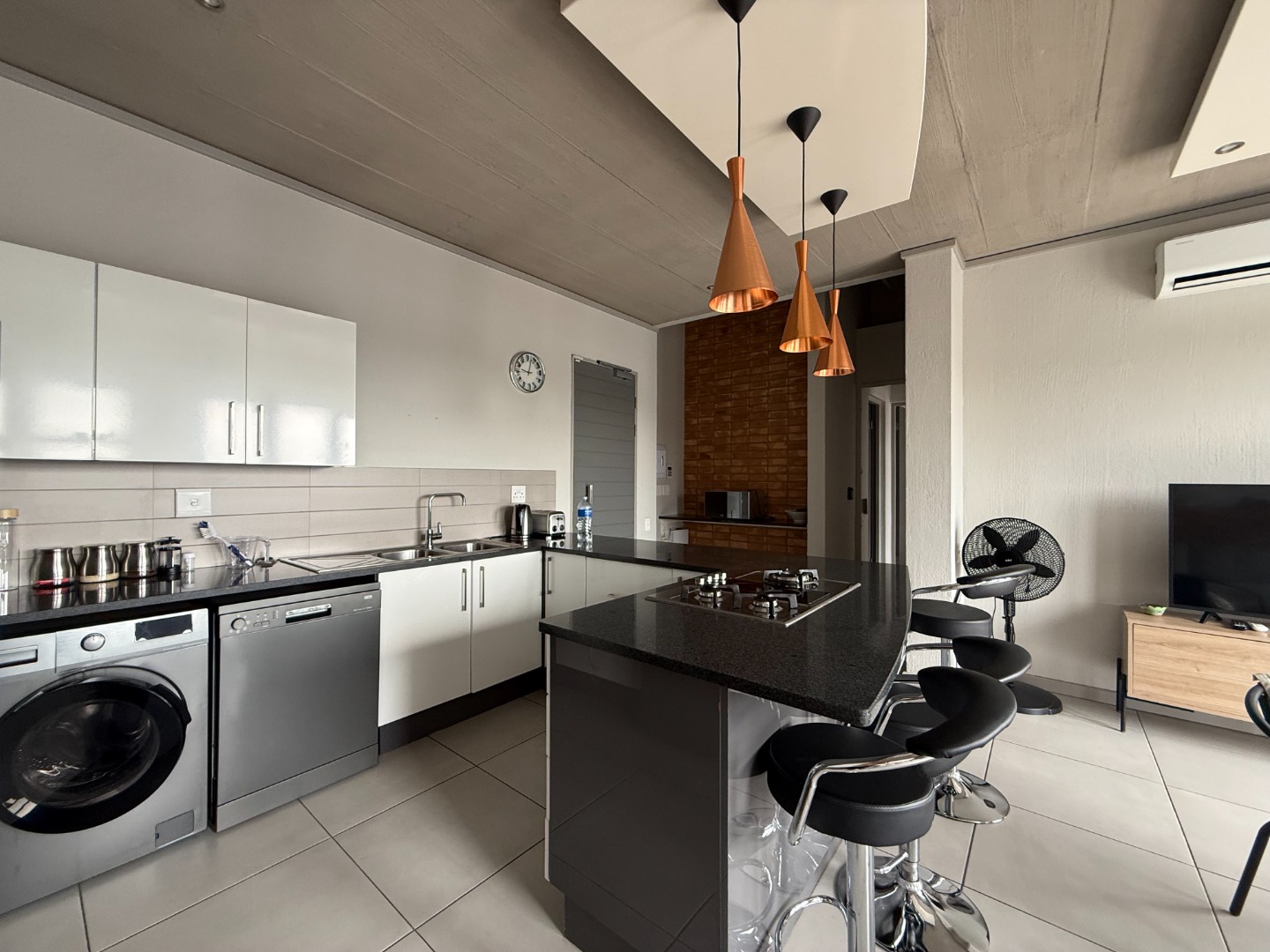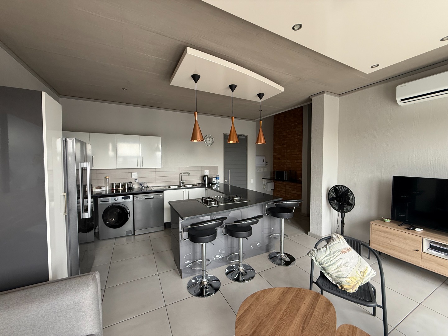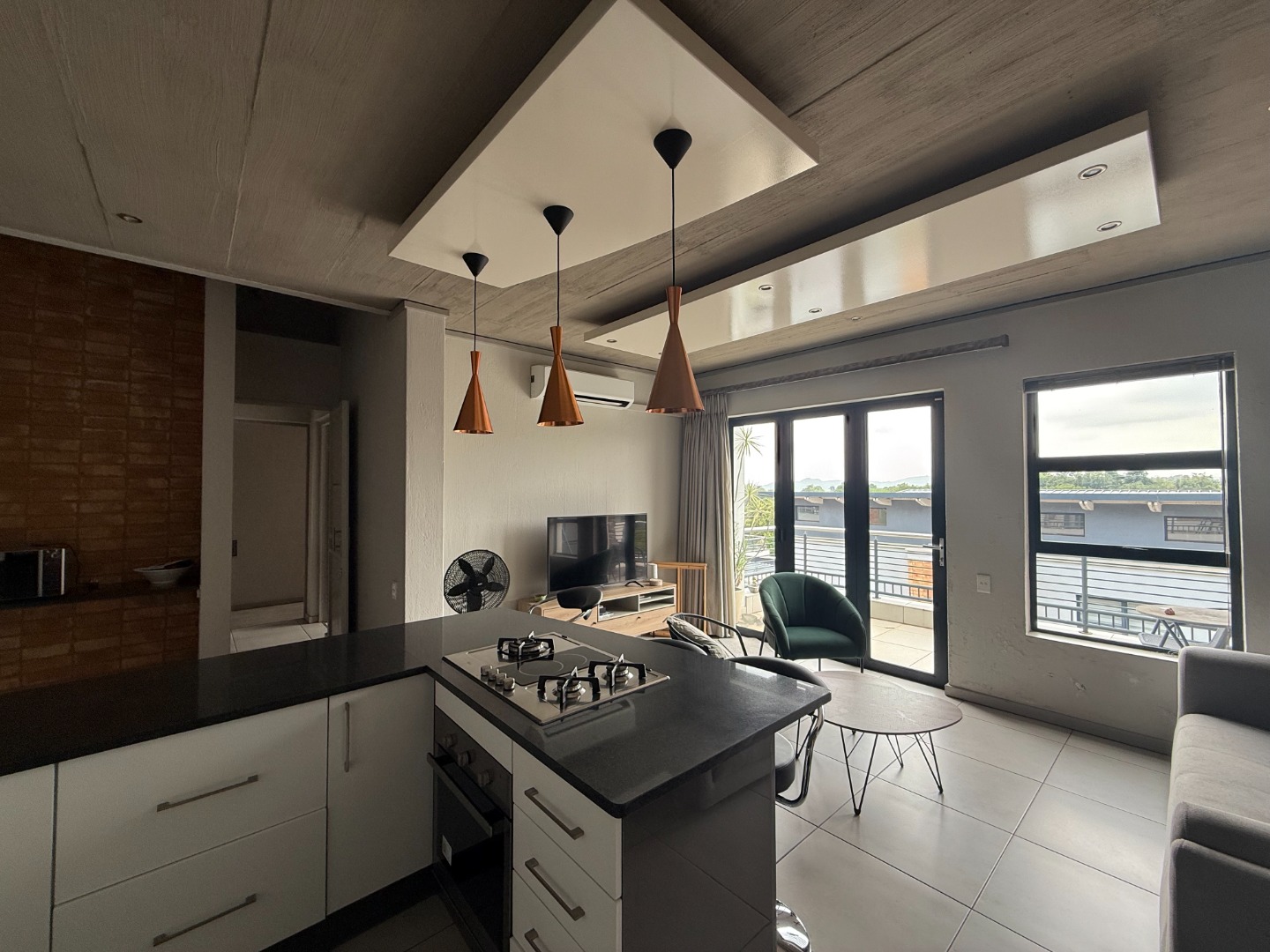 The apartment features a spacious open-plan kitchen and lounge, designed for both comfort and functionality. The modern kitchen includes ample cupboard space and a breakfast counter, flowing seamlessly into the living area and onto a private balcony with a built-in braai, ideal for entertaining or relaxing.