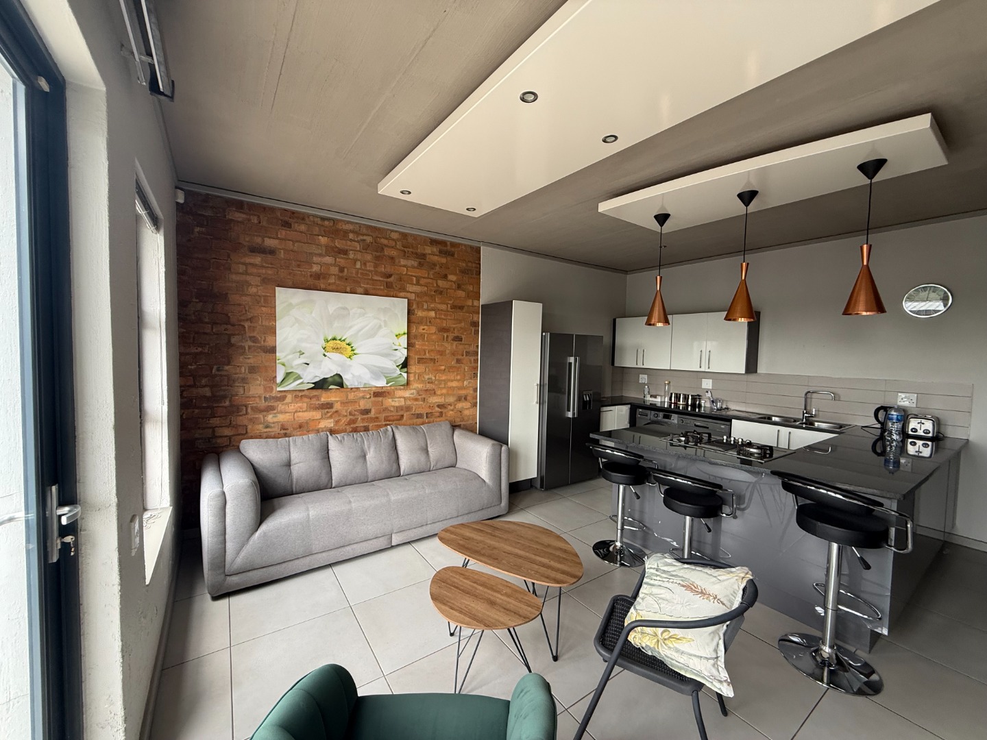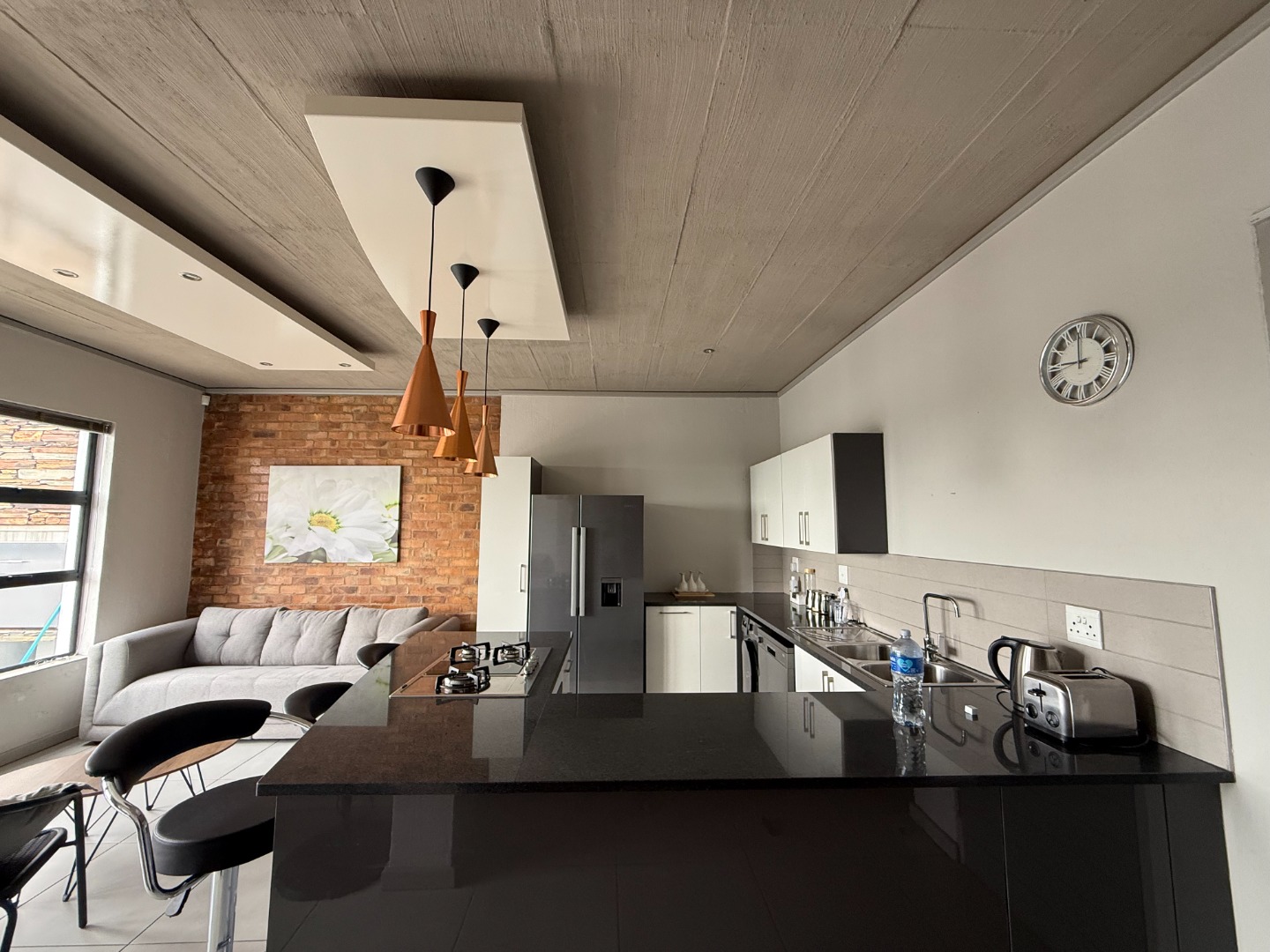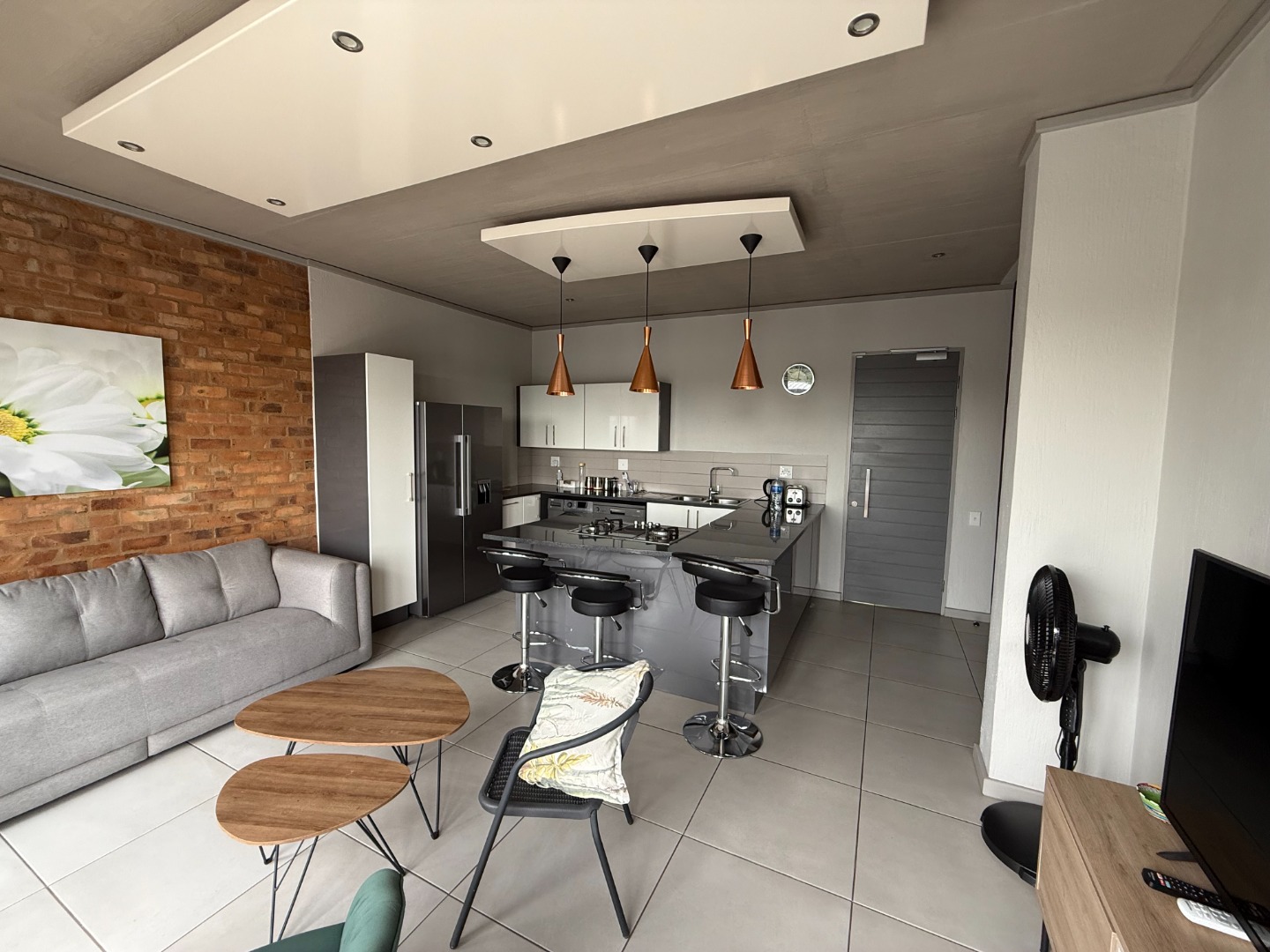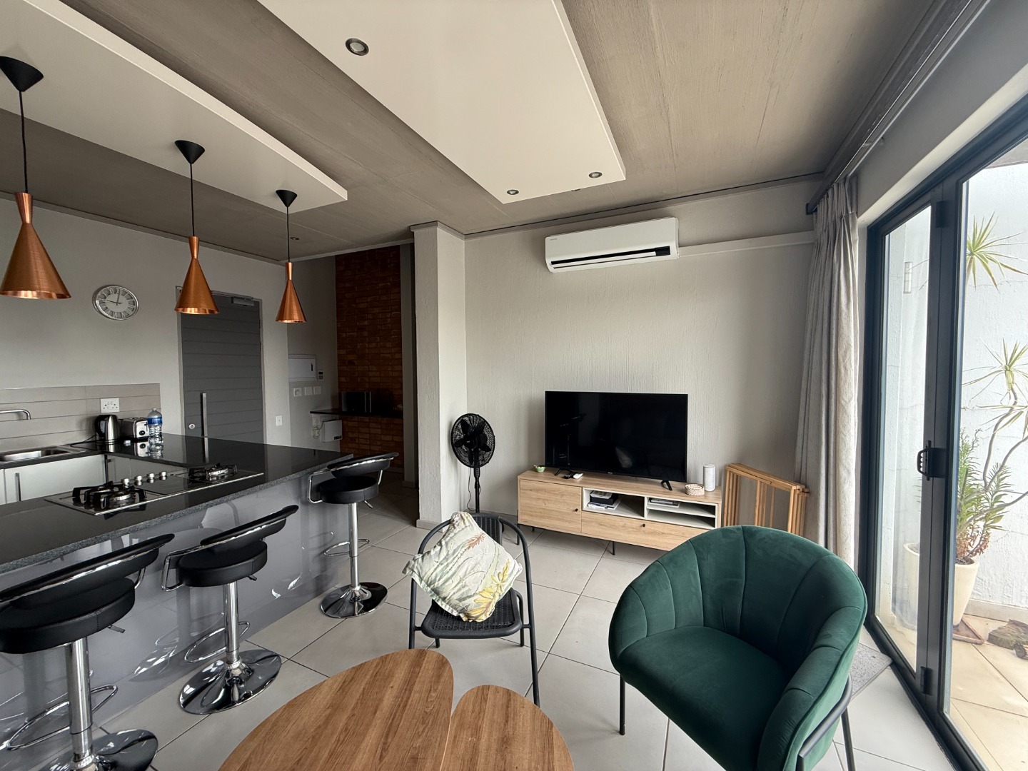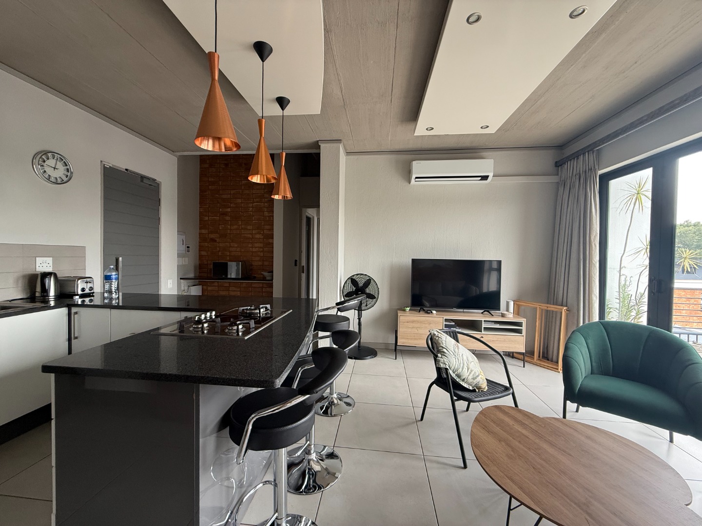 The apartment features a spacious open-plan kitchen and lounge, designed for both comfort and functionality. The modern kitchen includes ample cupboard space and a breakfast counter, flowing seamlessly into the living area and onto a private balcony with a built-in braai, ideal for entertaining or relaxing.
