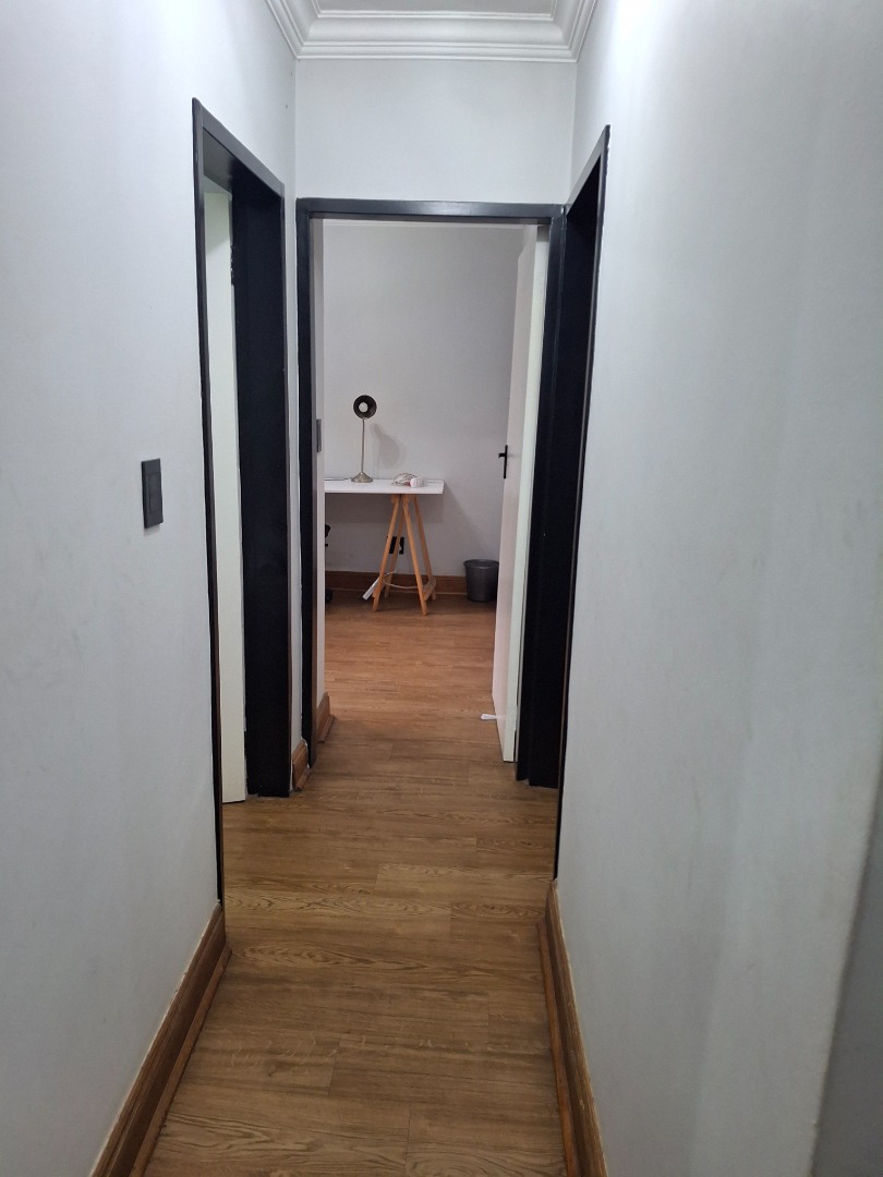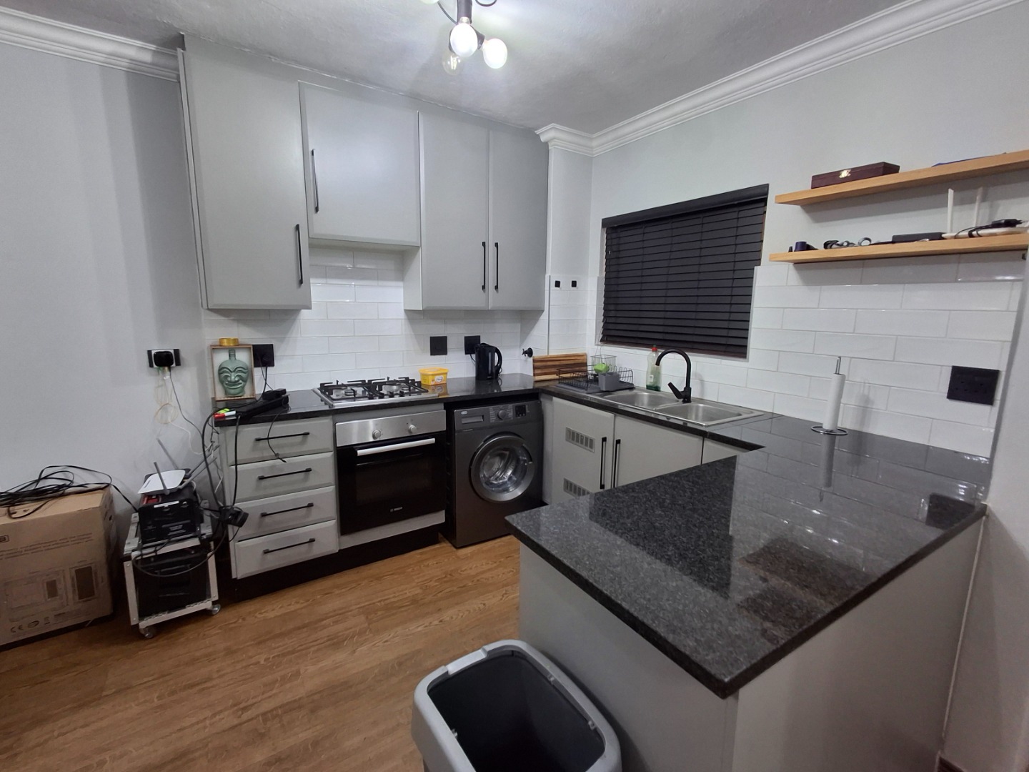 Inside this 79 sqm home, an inviting open-plan living and dining area features contemporary refurbished decor, laminate flooring, and light grey walls, with sliding doors opening to an outdoor patio. The modern kitchen is equipped with sleek grey cabinetry, black countertops, a white subway tile backsplash, and integrated appliances including a gas stovetop and oven. Two comfortable bedrooms, one with an en-suite, offer attractive wooden flooring, neutral walls, and modern built-in wardrobes. Crown molding and large windows with blinds add refined touches throughout.