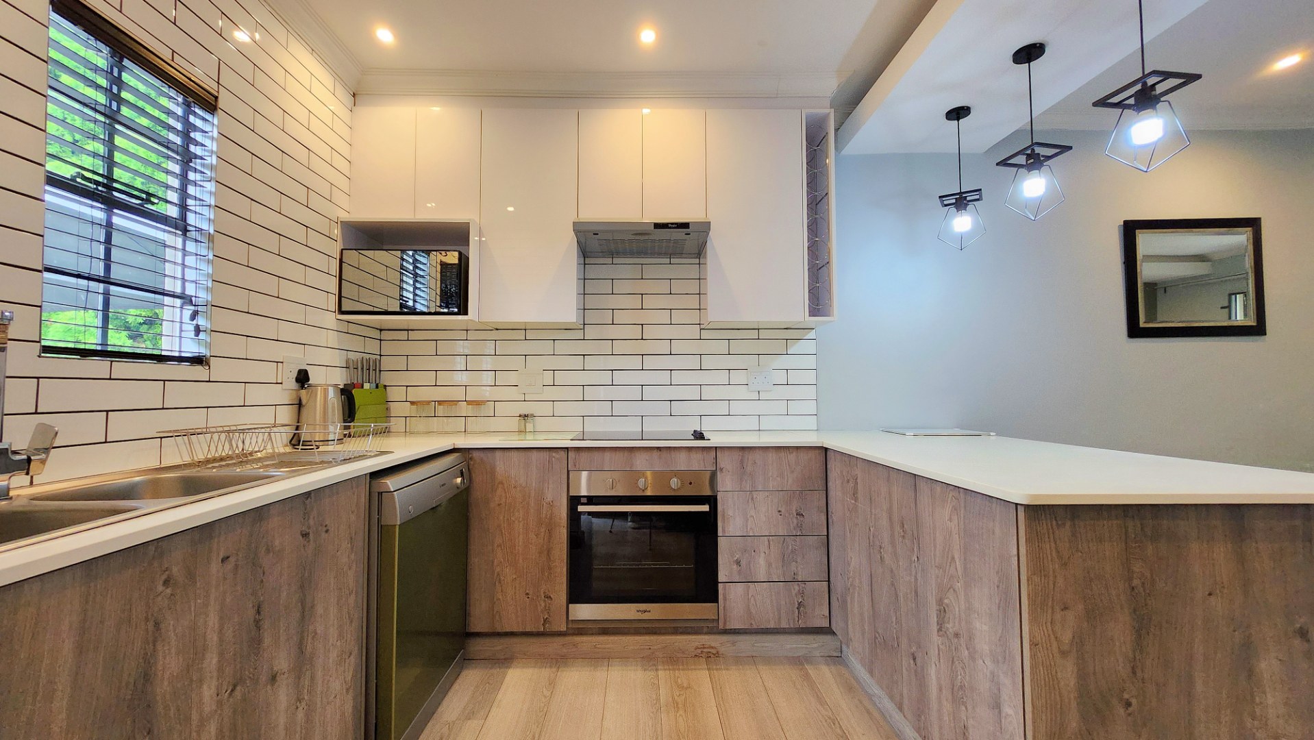 Step inside to discover an open-plan living area, bathed in natural light and adorned with modern finishes. The gourmet kitchen is a culinary delight, boasting sleek wood-look and glossy white cabinetry, pristine subway tile backsplash, and integrated appliances including a dishwasher, microwave, hob, and extractor. A stylish breakfast bar invites casual dining, seamlessly connecting to the lounge, which features a wall-mounted TV and recessed lighting.