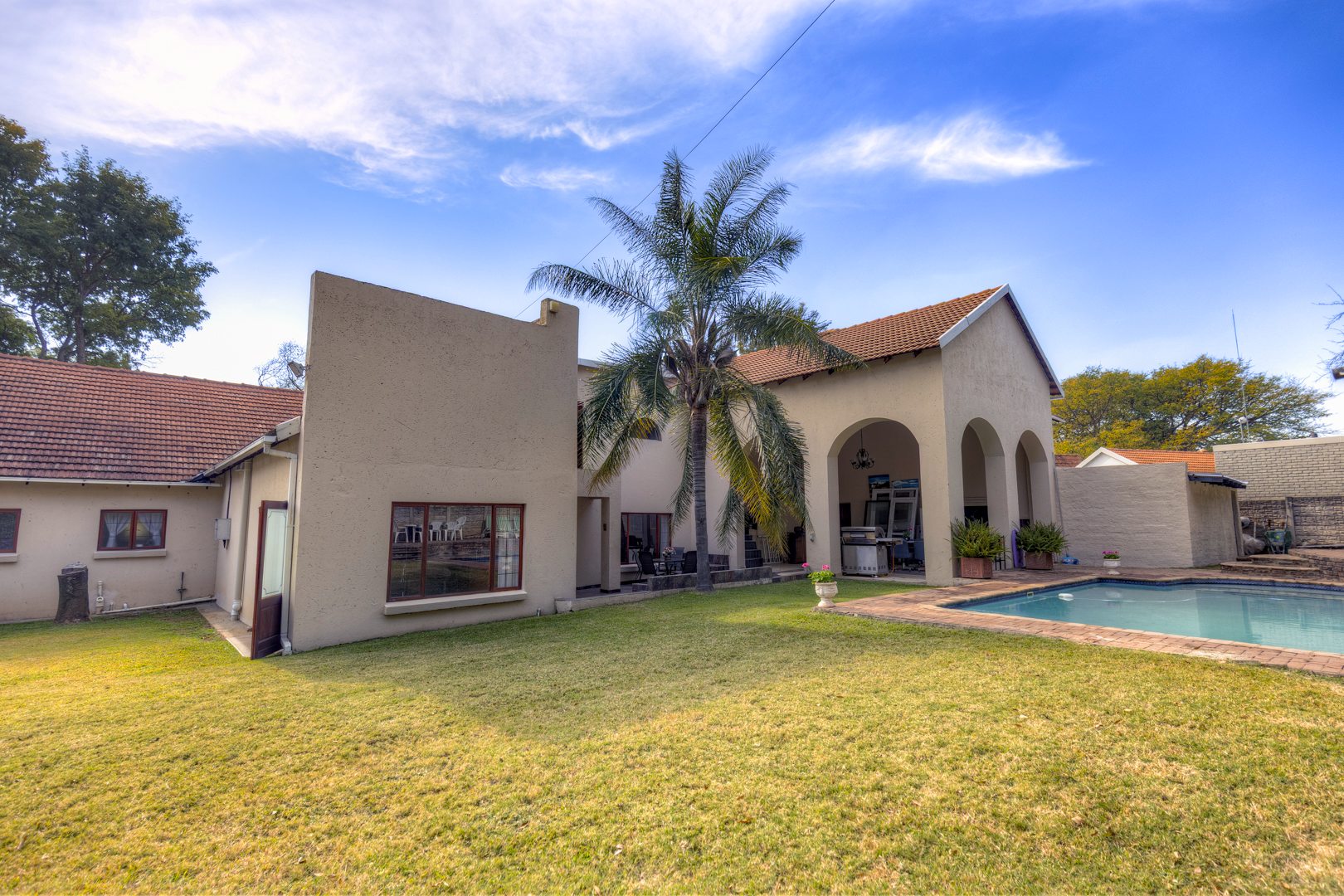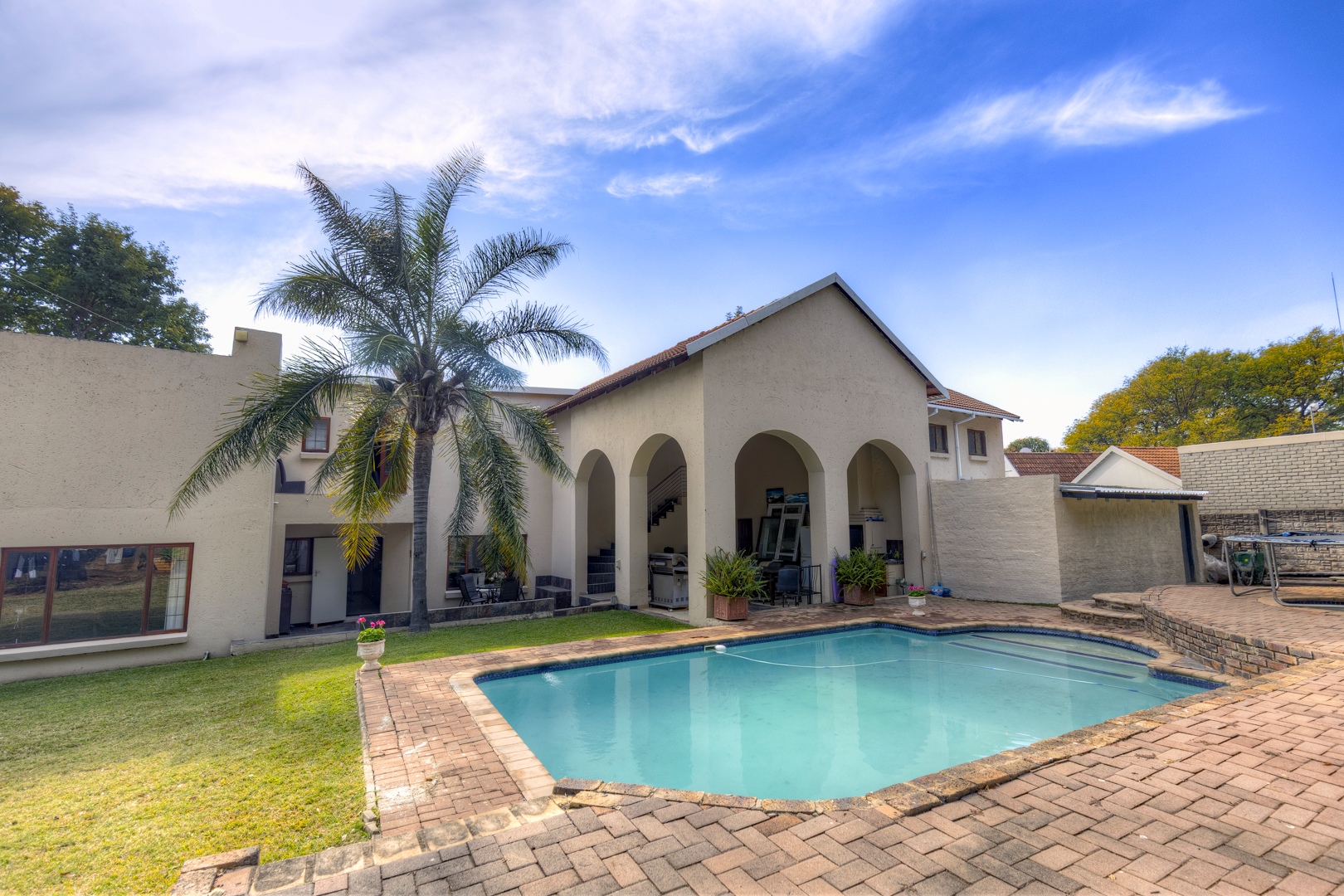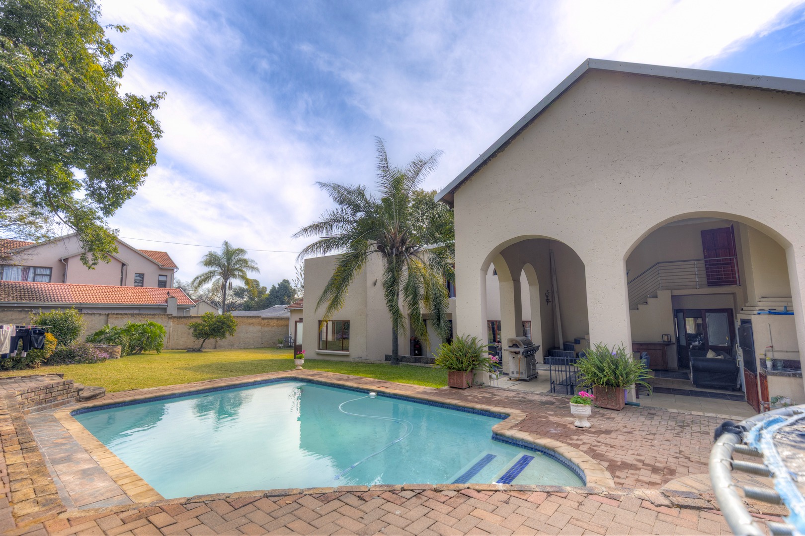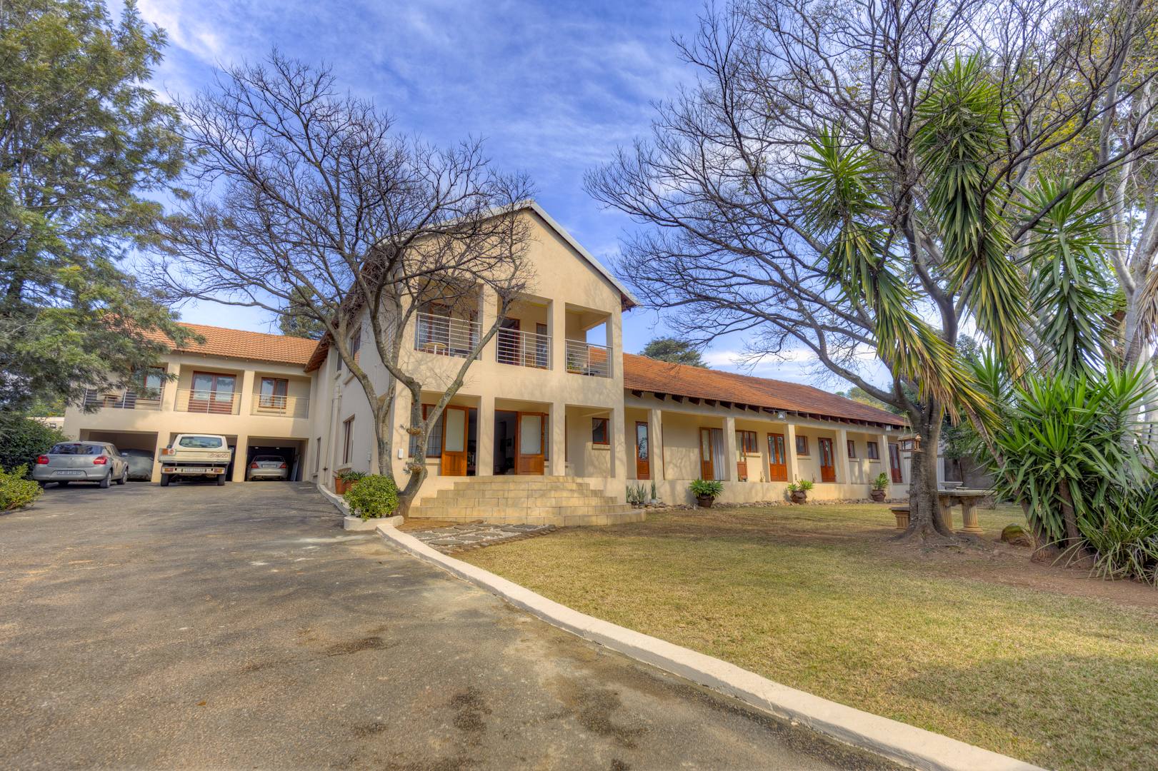 This beautiful spacious property has so much potential and can work for so many requirements without changes to the existing buildings. This is not a renovated property but re-constructed from the ground up to offer the following layout. Eight double bedrooms, each with their own en-suite bathroom and solid wood double door private access to the garden. An impressively spacious reception room that can be used as a high-class reception space or used as a lounge or entertainment hall. A separate TV/ Lounge area spacious enough to cater for all the family or guests. An open plan kitchen catering to two dining areas all looking out onto the garden. Upstairs, you have two other private and very spacious bedrooms with en-suite bathroom and walk in closet. On the one side is the main suit and in between the main and second en-suite room on the top area, a convenient coffee station area to serve the two top units. The entertainment rooms all lead onto an impressive double volume covered patio for glamorous entertainment and enough space to cater for the all the family or house guests as well as friends and family. This space features a double sized gas build in braai and caters for serious entertainment. The space then have access to the garden and lovely extra big pool with its own cute kiddies pool. Separate to the main house and built on top of the five garages are a full-sized separate flatlet with space for lounge, dining, kitchen, bedroom and bathroom. It features its own balcony and private entrance.