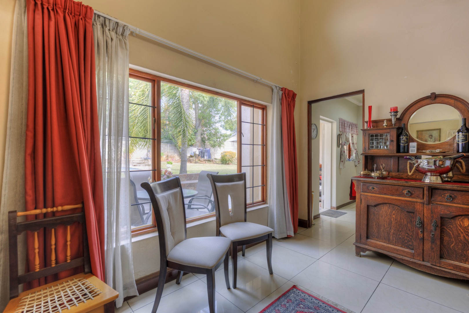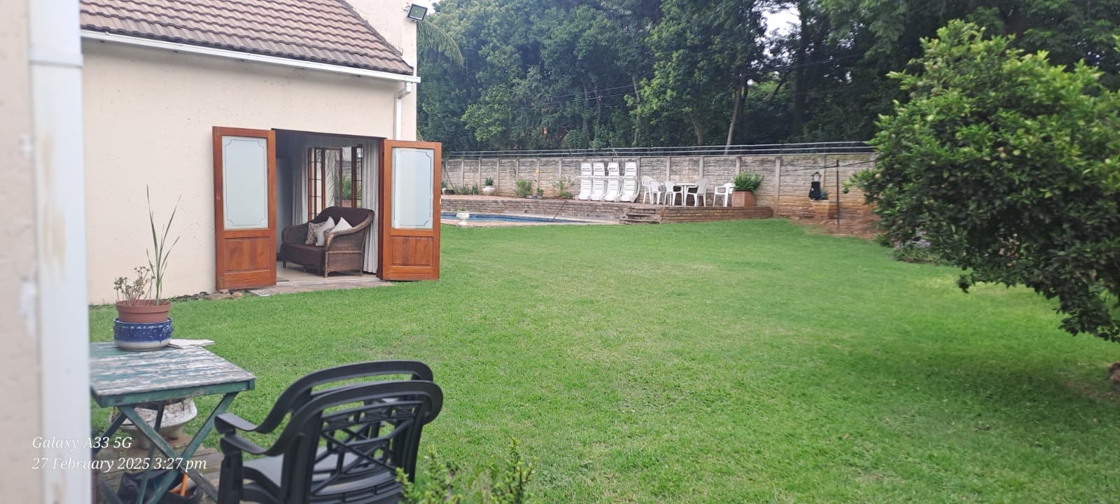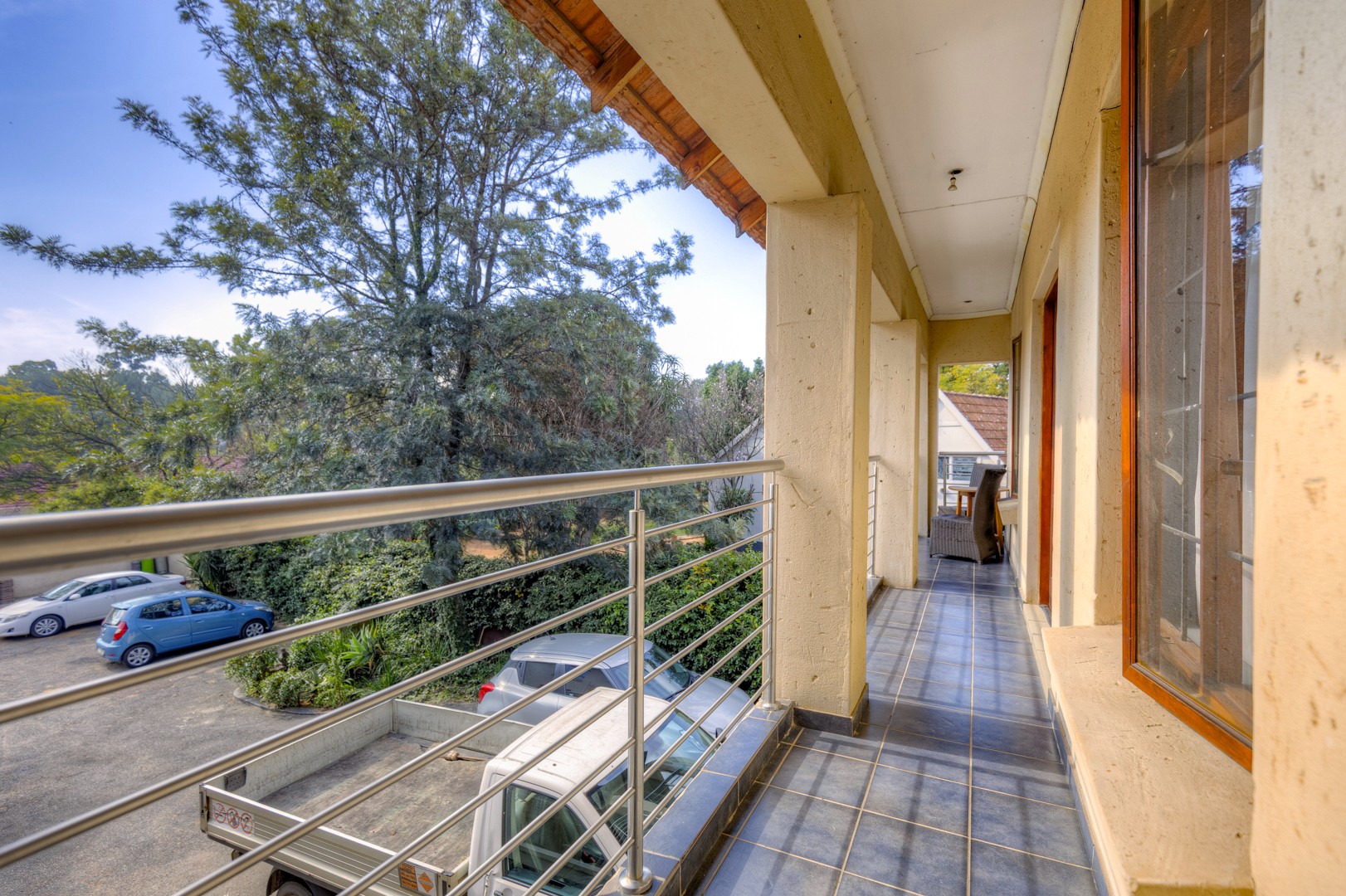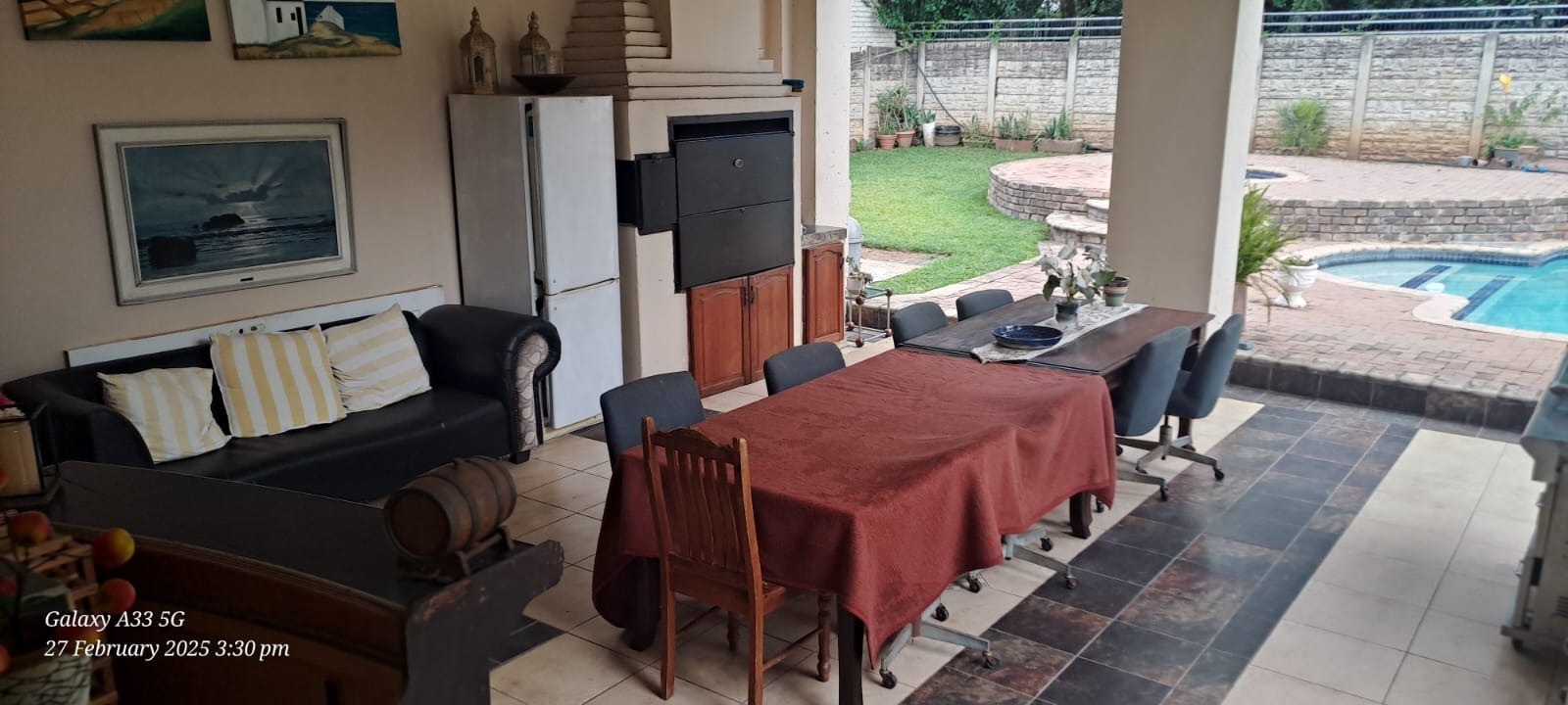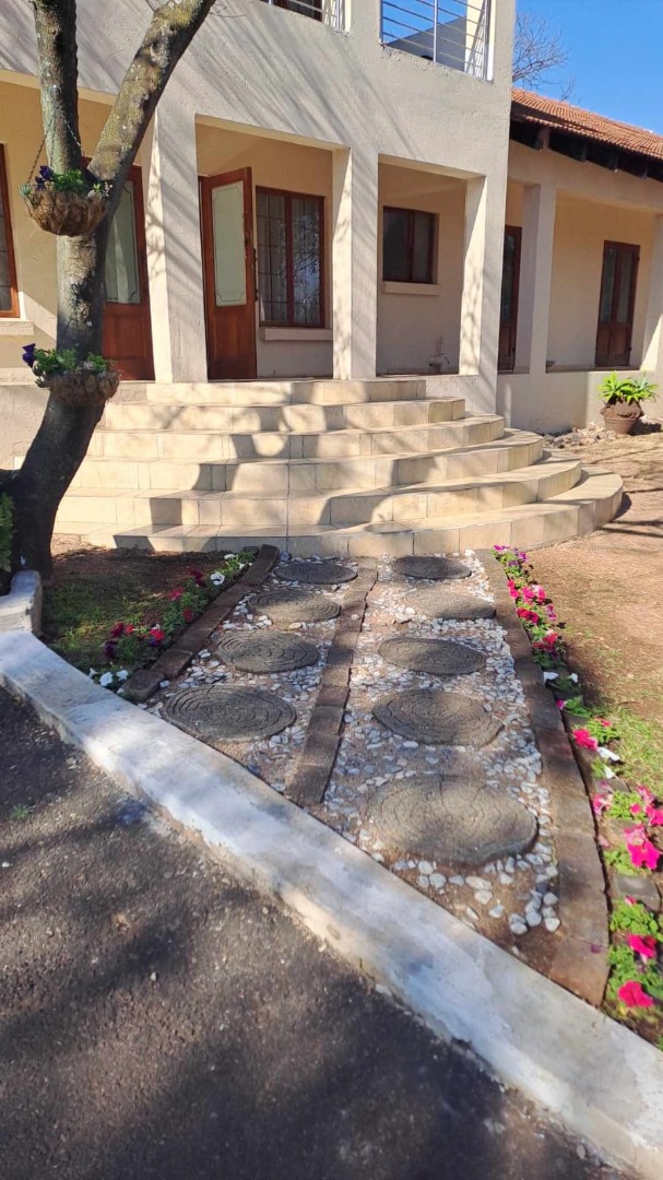 The property is fully fenced and in a secure and quiet location. The property is secured by beams around the house as well as electric fencing on the boundary walls. No traffic noise or noise pollution. The driveway is tarred and make provision for secure parking for 10 or more vehicles without affecting access to the garages.