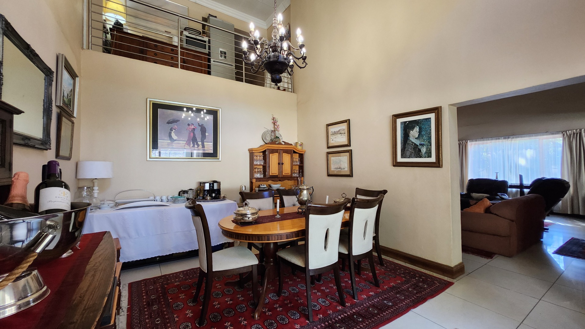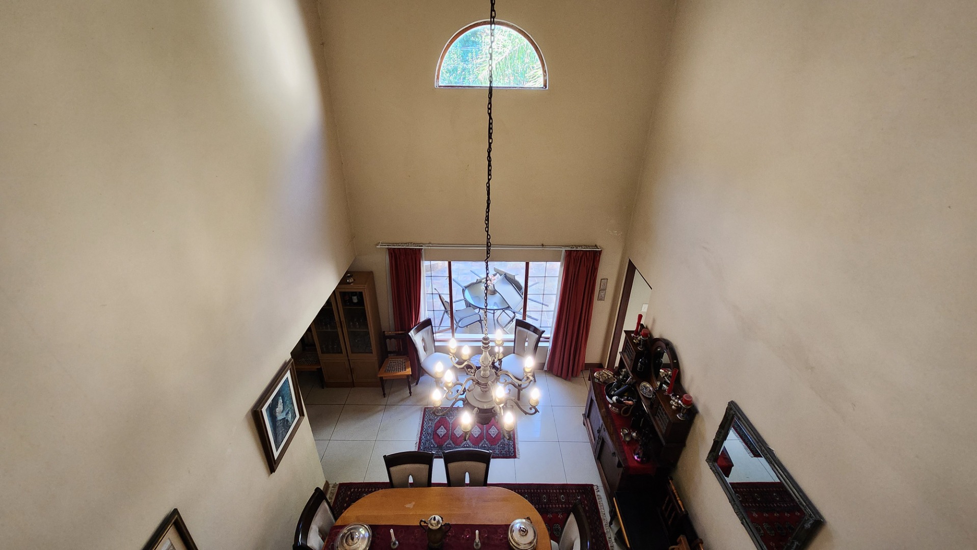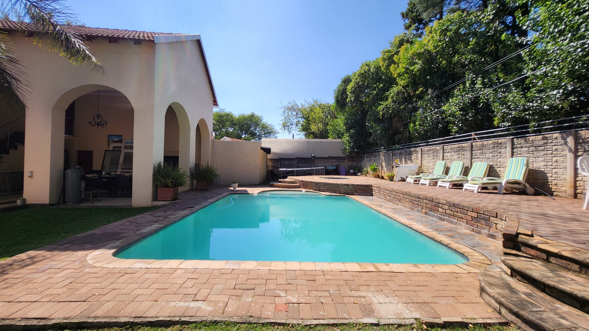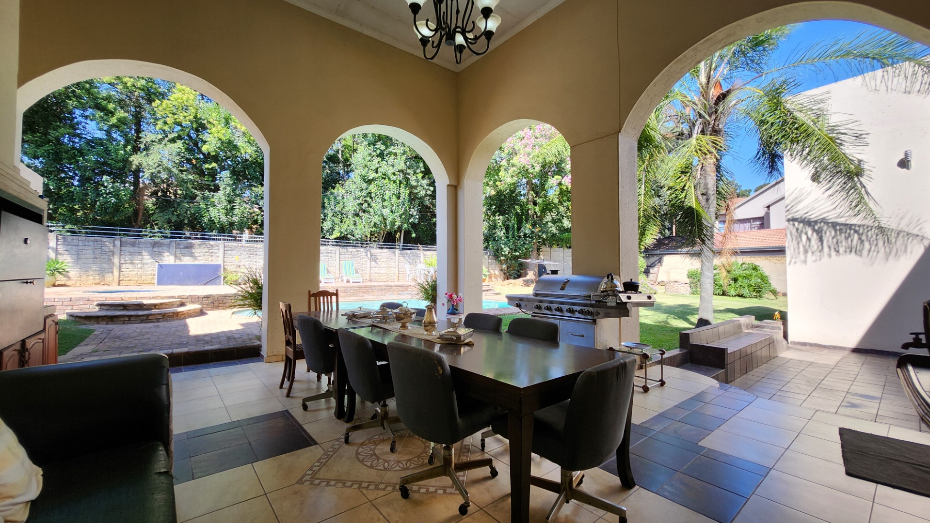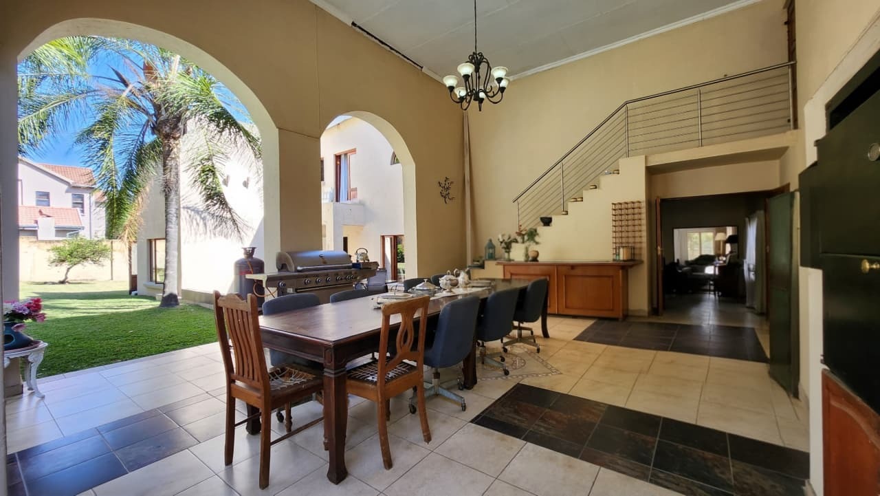 Beyond the interiors, a private oasis awaits. Immerse yourself in the sparkling swimming pool, complemented with a kiddies pool for the little ones. Unwind on the expansive patio, or enjoy the serene ambiance of the meticulously landscaped garden. Multiple balconies offer elevated vistas, perfect for enjoying the South African climate. Practical considerations are met with five spacious garages and six additional parking bays, alongside dedicated laundry and storage facilities.