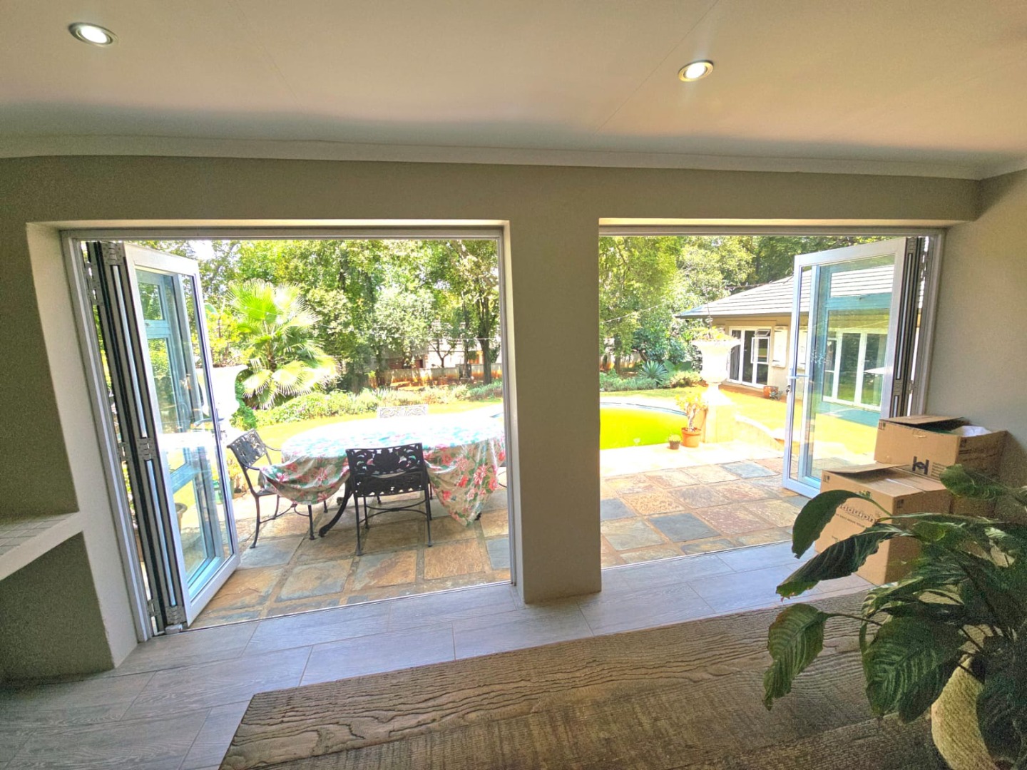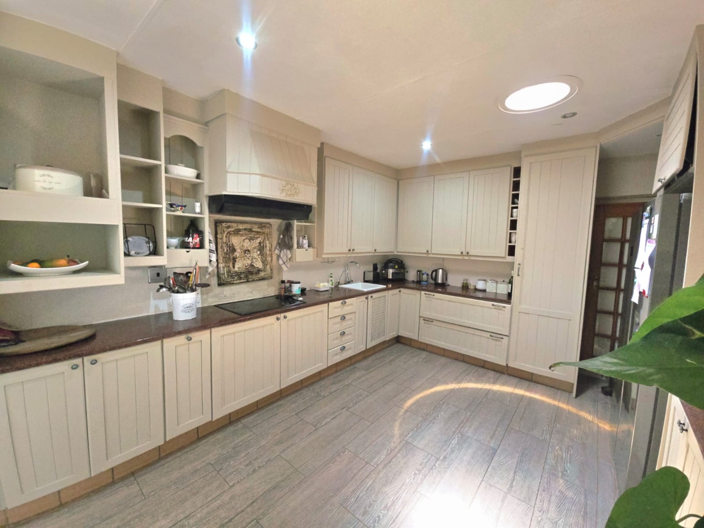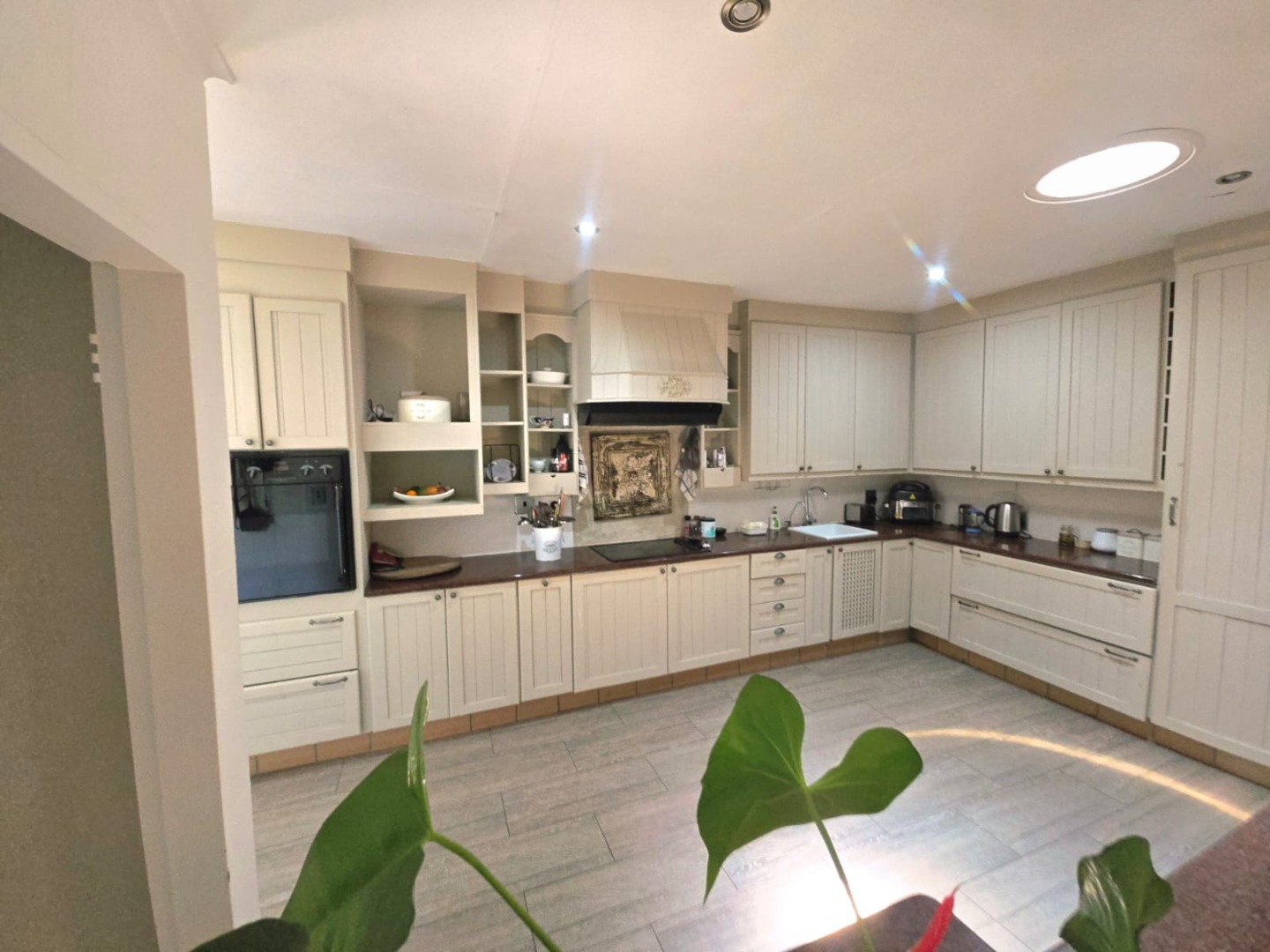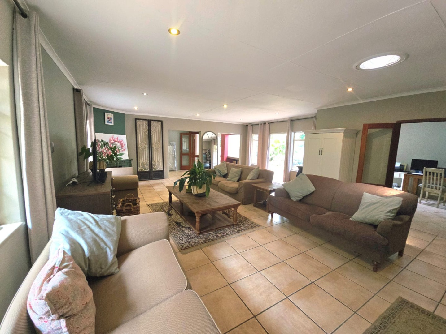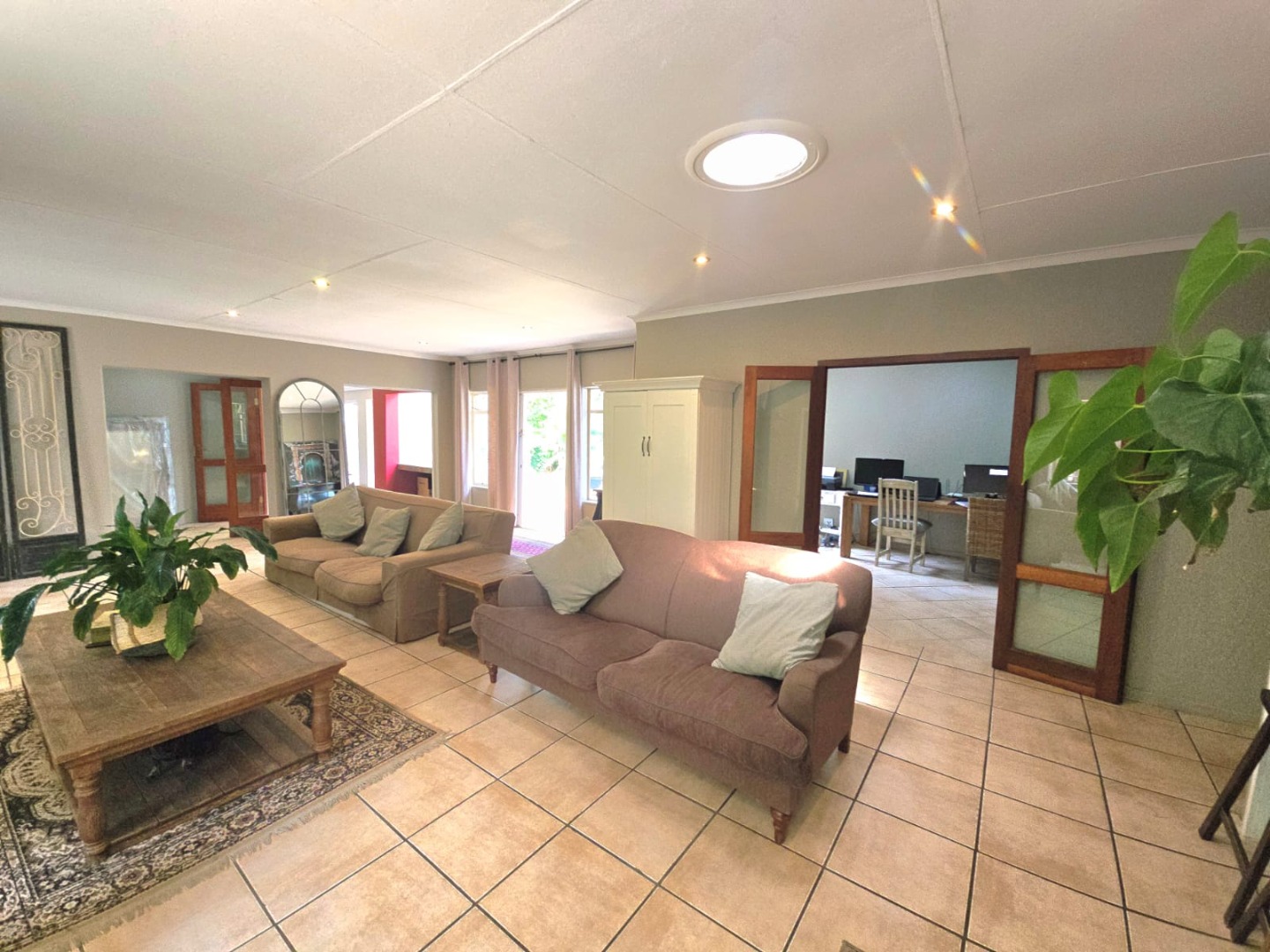 The kitchen is well-equipped with electric oven and hob, and a separate scullery accommodating up to three appliances. A spacious study, opening directly onto the patio and pool area, provides the perfect work-from-home setting.