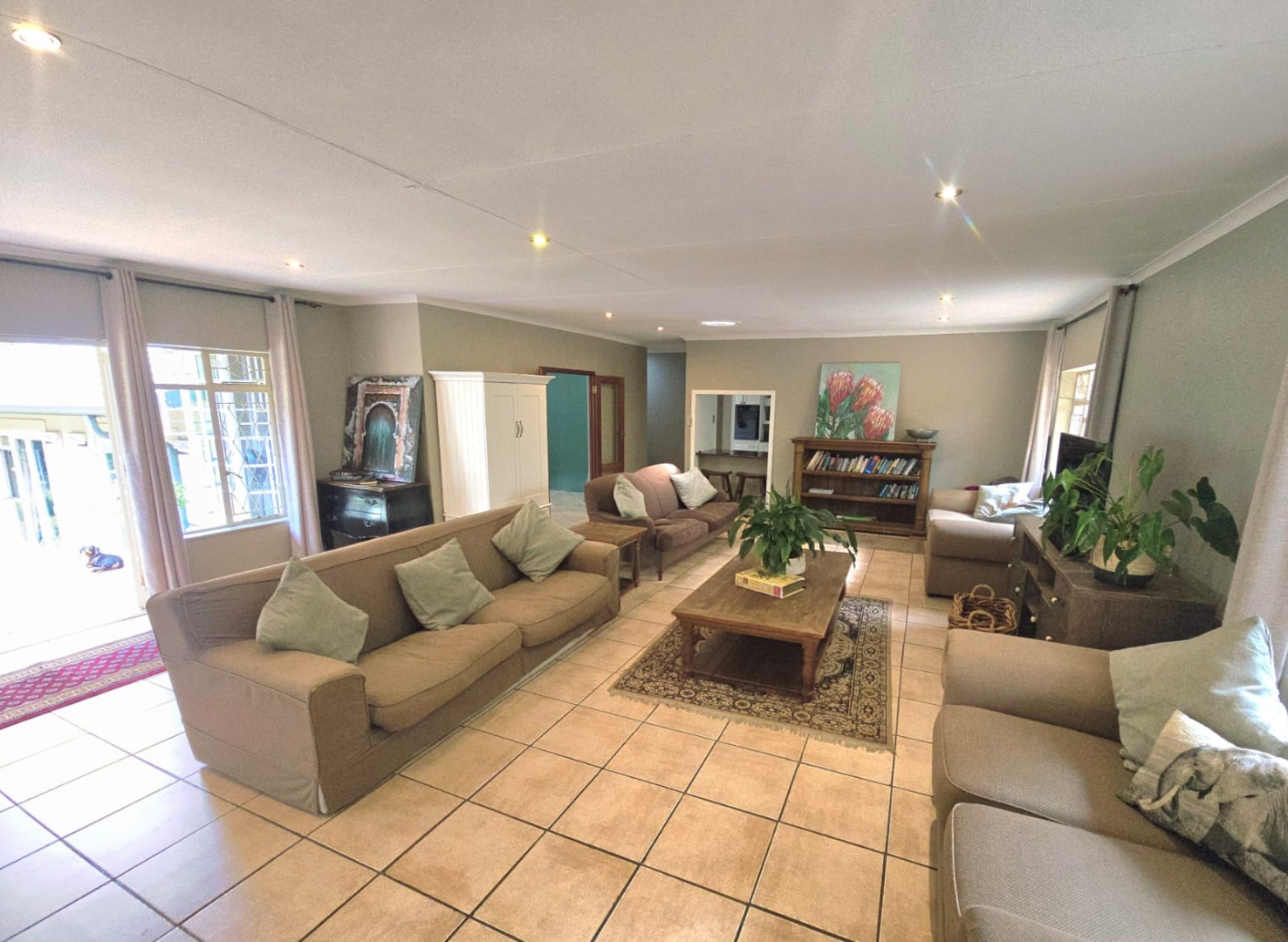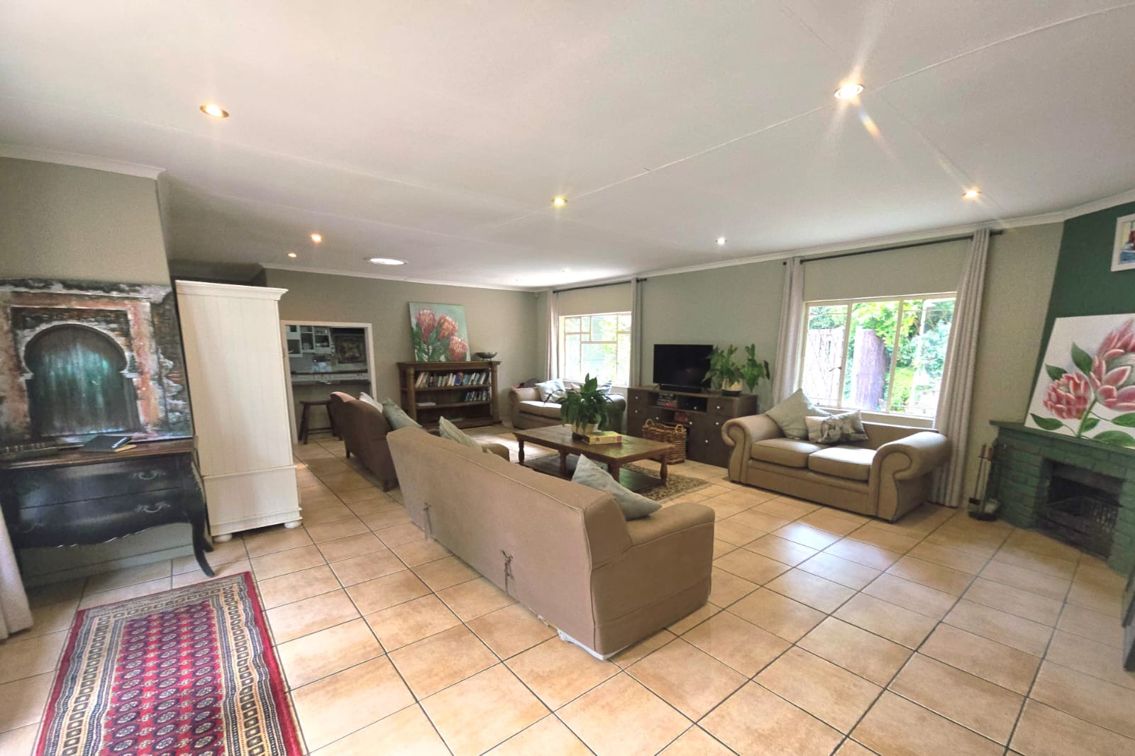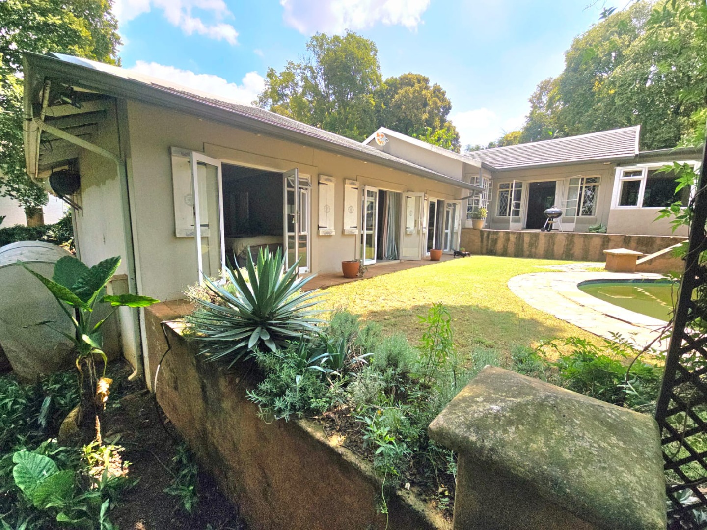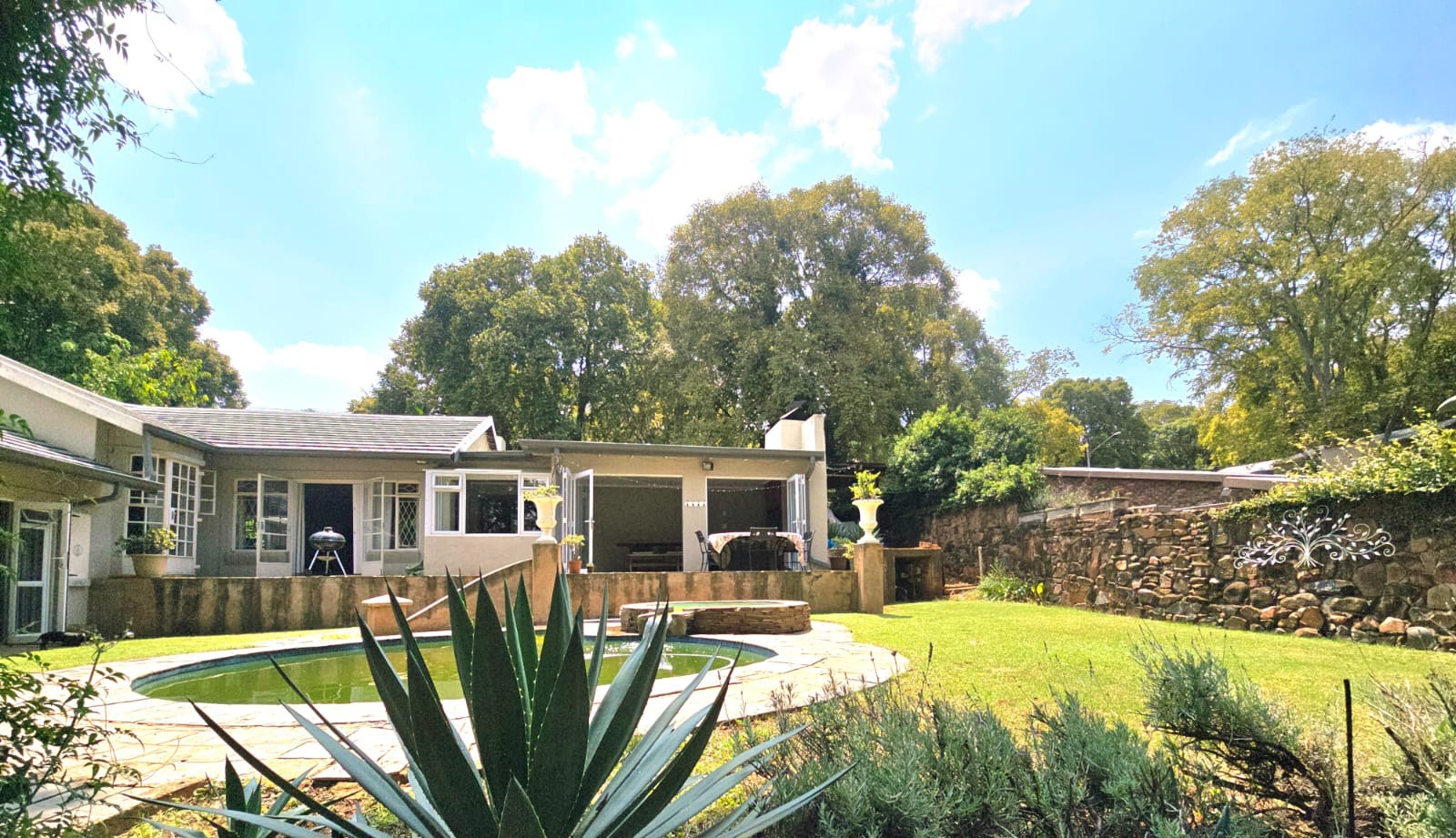 The main residence, while classic in character, is well maintained and thoughtfully designed for comfortable family living. A welcoming entrance hall leads into expansive living areas, including a generous lounge complete with a cozy fireplace and a large dining room —ideal for relaxed evenings and entertaining. The heart of the home is a delightful braai room that opens onto a patio and overlooks the sparkling swimming pool, creating a seamless indoor-outdoor flow.