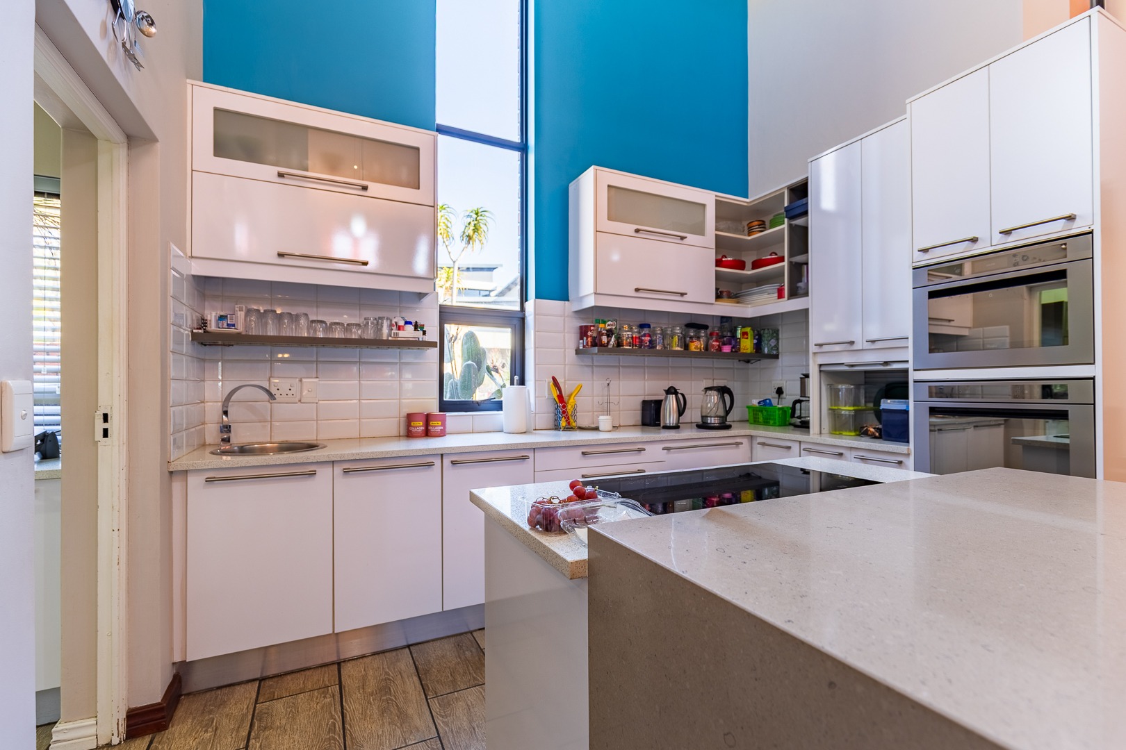 Gourmet Culinary Hub: A modern open-plan kitchen equipped with sleek white cabinetry, a central island with an integrated hob, and premium built-in ovens.