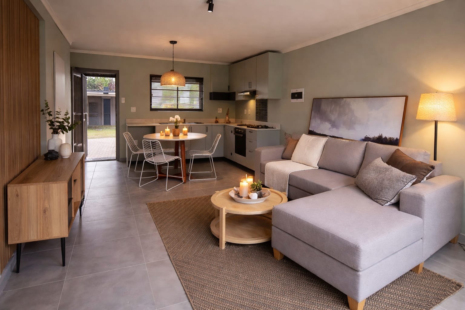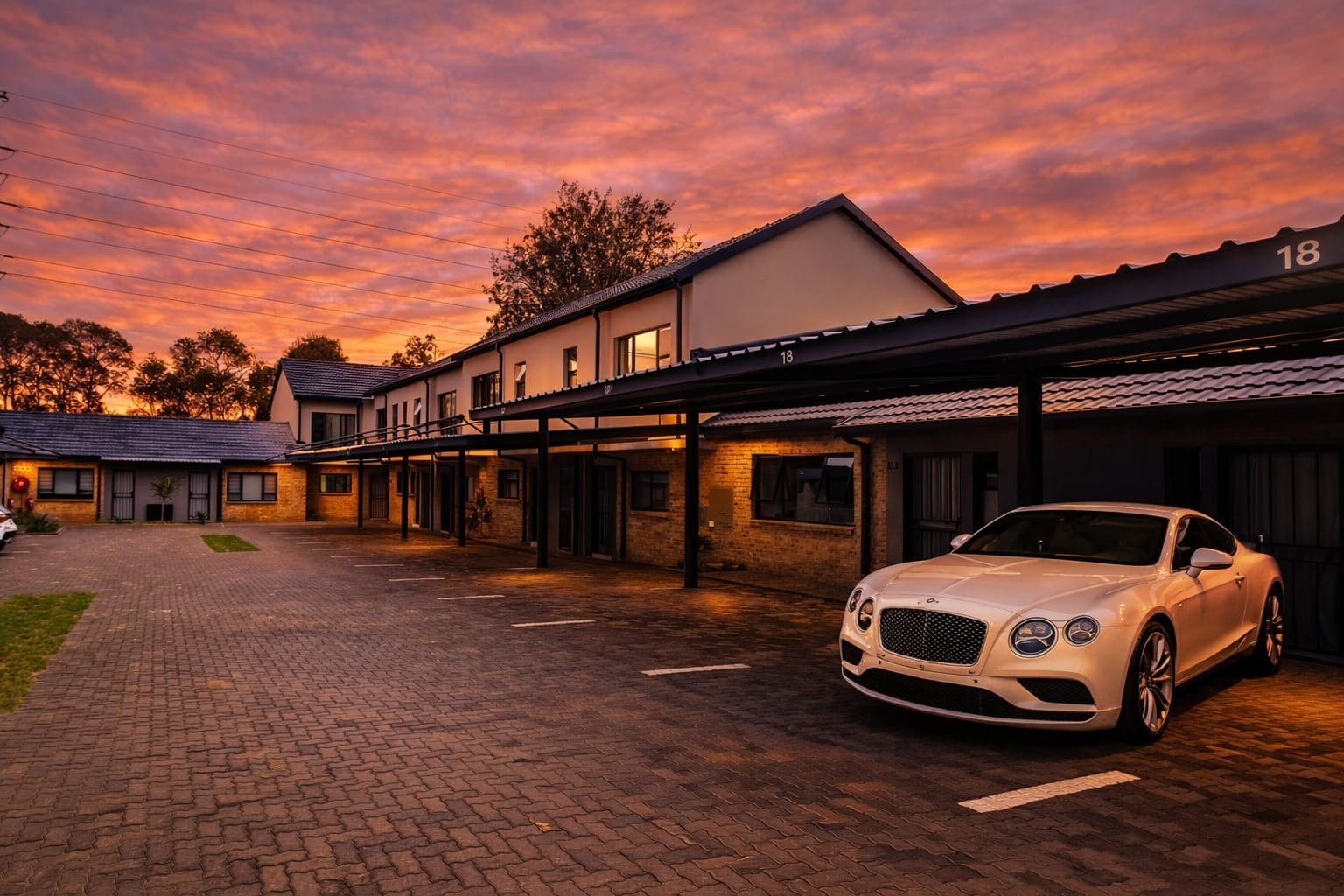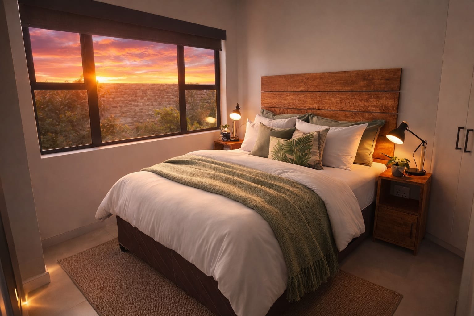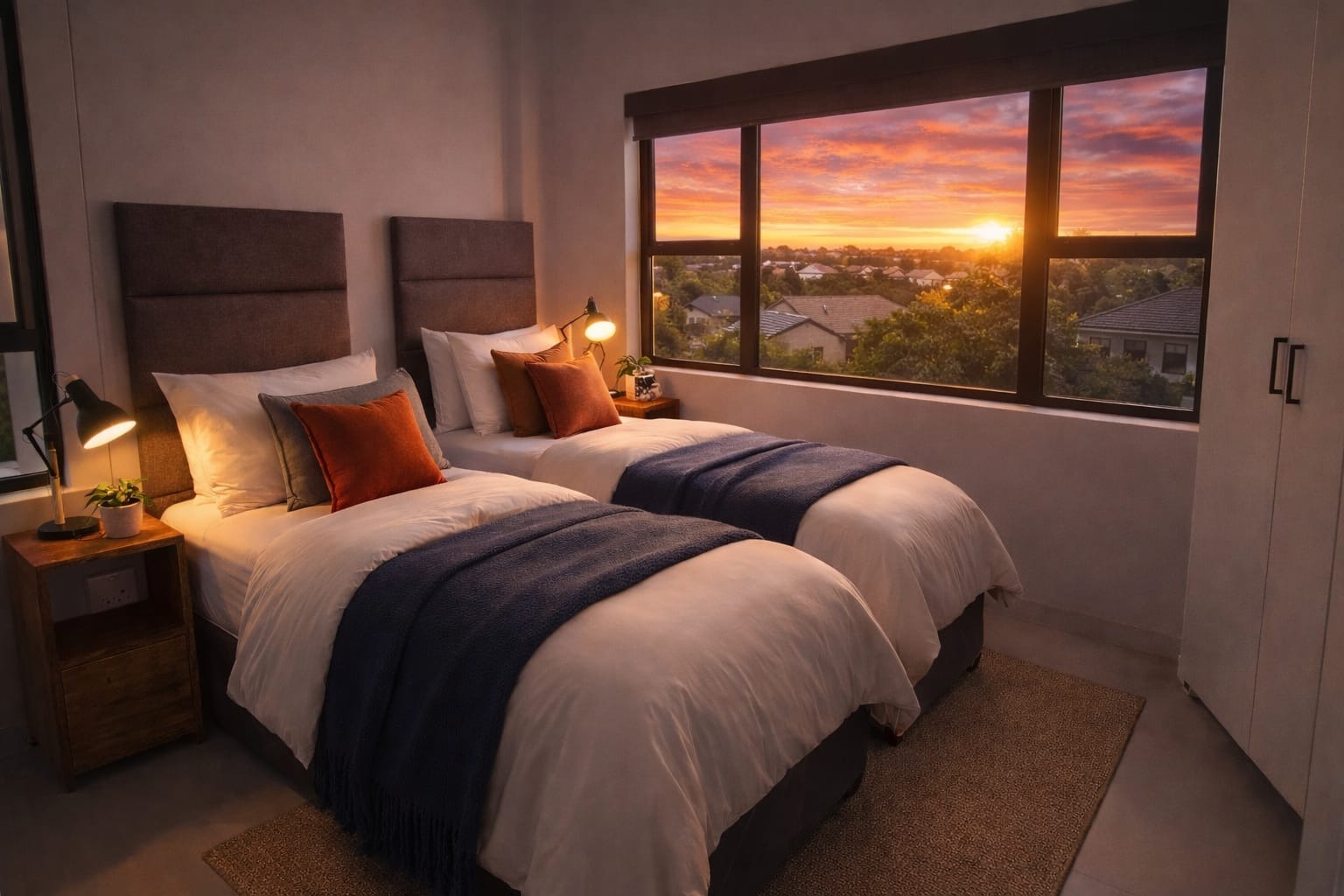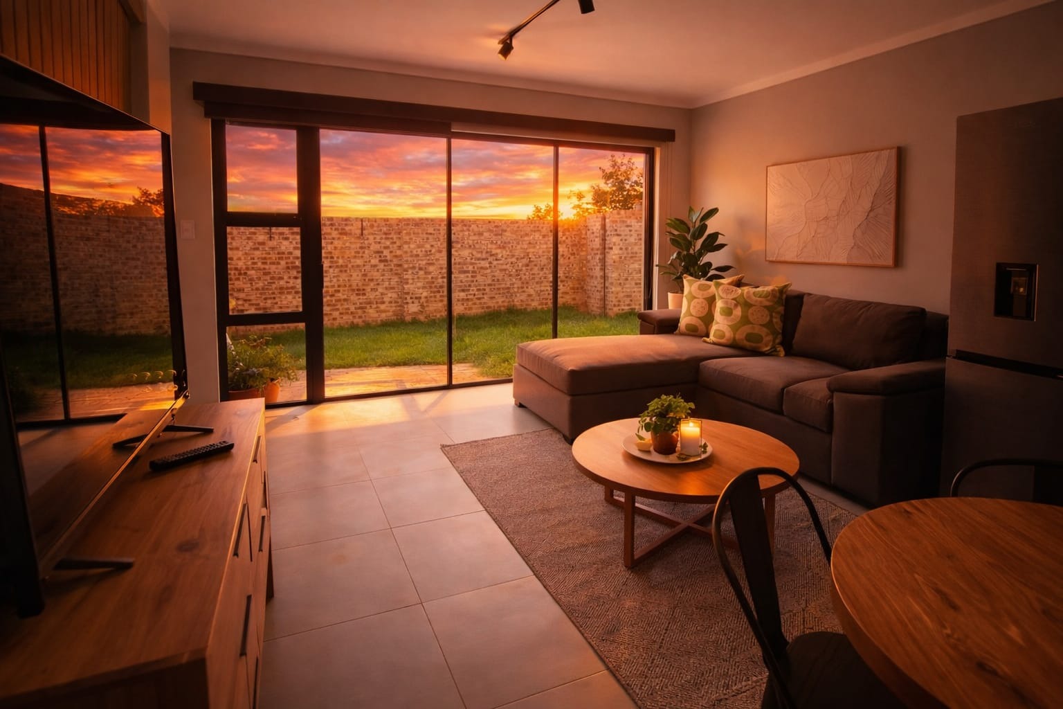 Welcome to '4 Oaks', a modern residential complex in the sought-after Lynnwood suburb of Pretoria. The property immediately impresses with its contemporary architectural style, featuring a blend of brick and plaster finishes, illuminated signage, and attractive landscaping at the secure, gated entrance. This well-maintained environment sets a sophisticated tone for residents. Step inside this 85 sqm unit to discover an intelligently designed open-plan living space, seamlessly integrating a modern kitchen, dining area, and lounge. The interior boasts a clean aesthetic with neutral tones and durable tiled flooring throughout, ensuring a stylish and low-maintenance lifestyle. The kitchen is equipped with a pantry, while large sliding doors connect the lounge to a private garden, inviting natural light and facilitating effortless indoor-outdoor living. This home offers two comfortable bedrooms, each featuring its own en-suite bathroom for ultimate privacy and convenience. The bedrooms are thoughtfully designed for relaxation, complete with warm ambient lighting and rustic wooden headboards, and benefit from large windows that frame picturesque sunset views. Outdoor living is enhanced by a private garden space, complete with an irrigation system and a built-in braai, perfect for entertaining or quiet enjoyment. The property includes two dedicated parking bays, providing practical convenience. Residents can also appreciate the scenic views and stunning sunsets from various points within the complex. Security is a top priority within this gated community, which offers 24-hour security, an access gate, and electric fencing, ensuring peace of mind. The property is totally walled, adding to its secure nature. Modern sustainability features include a battery inverter, solar panels, fibre connectivity, and water tanks, promoting efficiency and resilience for contemporary living. Key Features: * Modern open-plan living with tiled flooring * Two en-suite bedrooms * Private garden with built-in braai * Two dedicated parking bays * Gated community with 24-hour security * Battery inverter and solar panels * Fibre connectivity and water tanks * Scenic views and beautiful sunsets