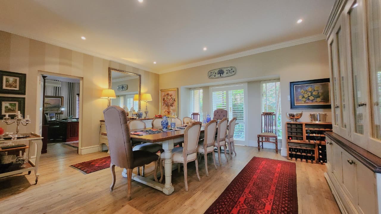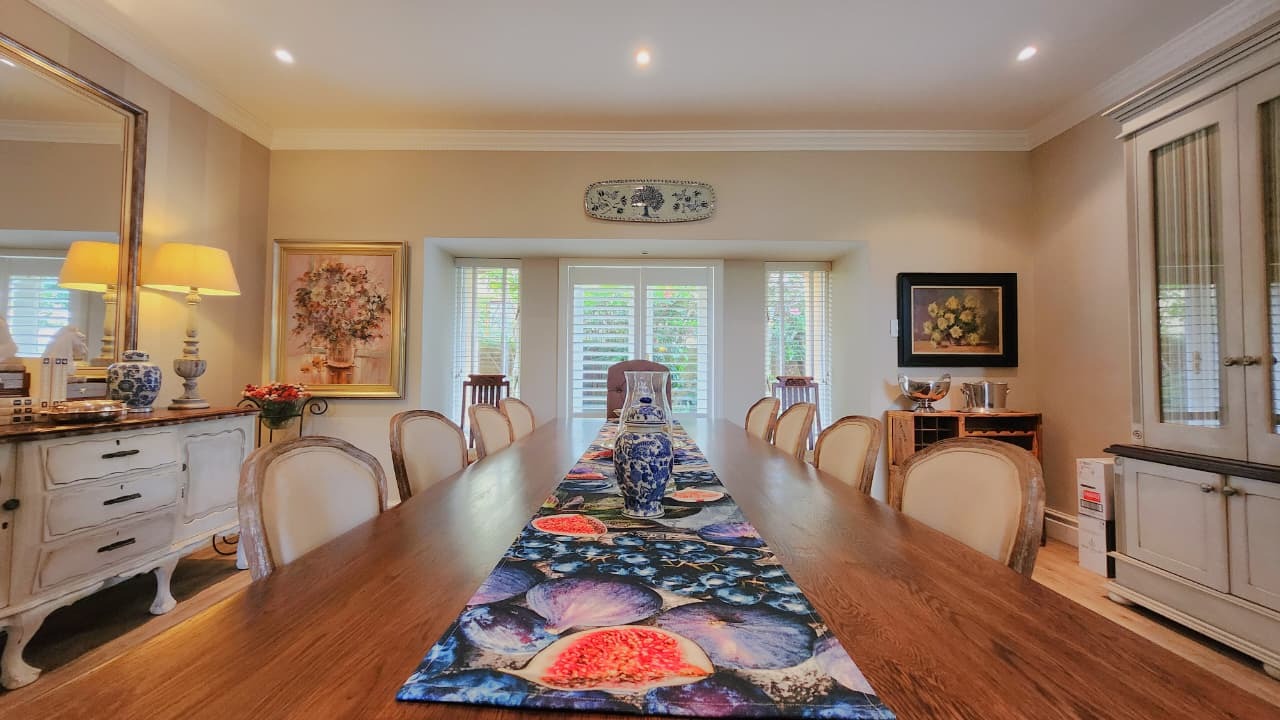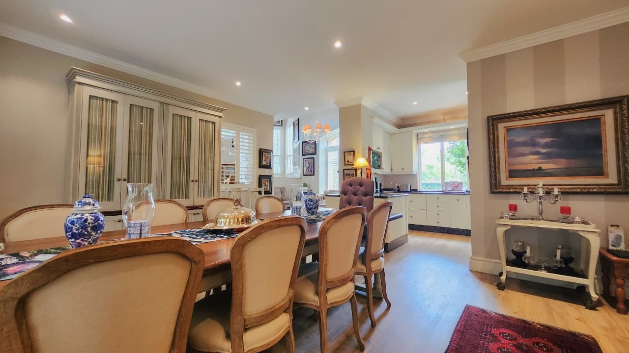 The large dining room adjoins a French farm-style kitchen, complete with ample cabinetry, quality finishes, and a separate scullery for added practicality.