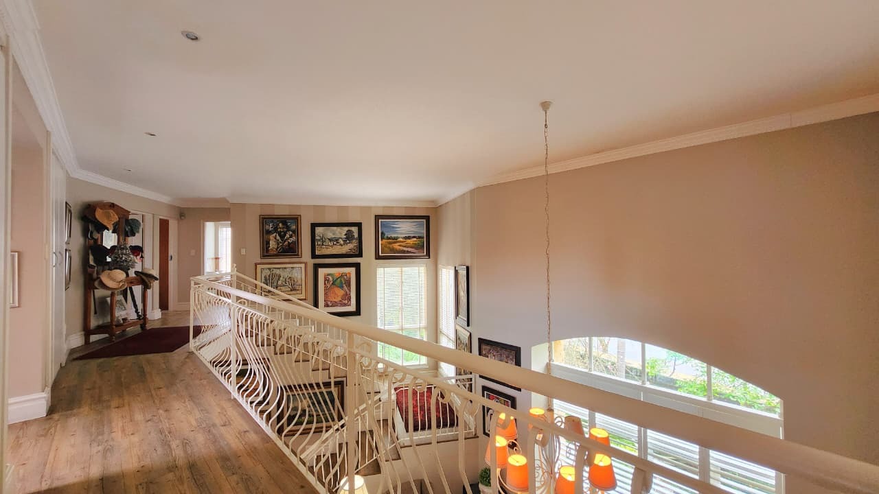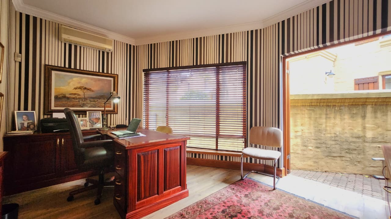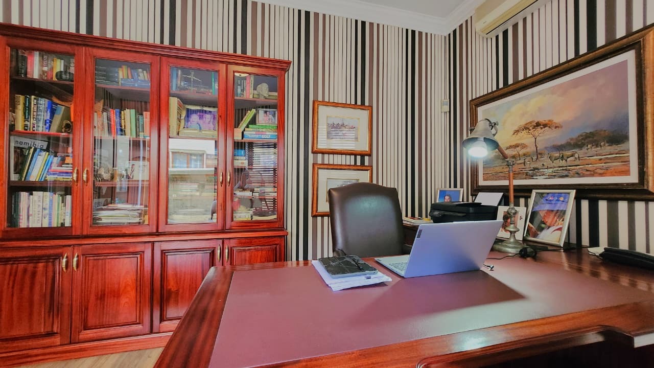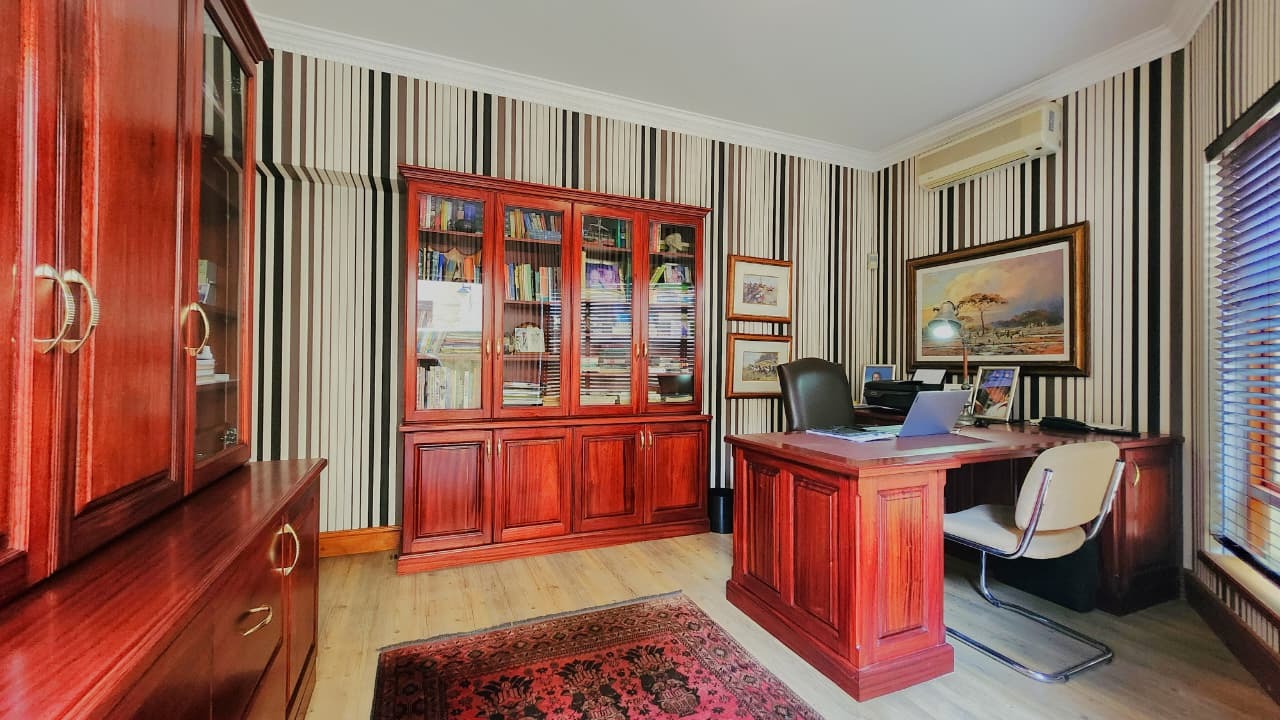 A beautiful staircase leads you to the upper level, where a second study opens onto a private balcony with scenic views. The ground-floor study, fitted with built-in wooden cupboards and a desk, provides the perfect space for a home office or library.
