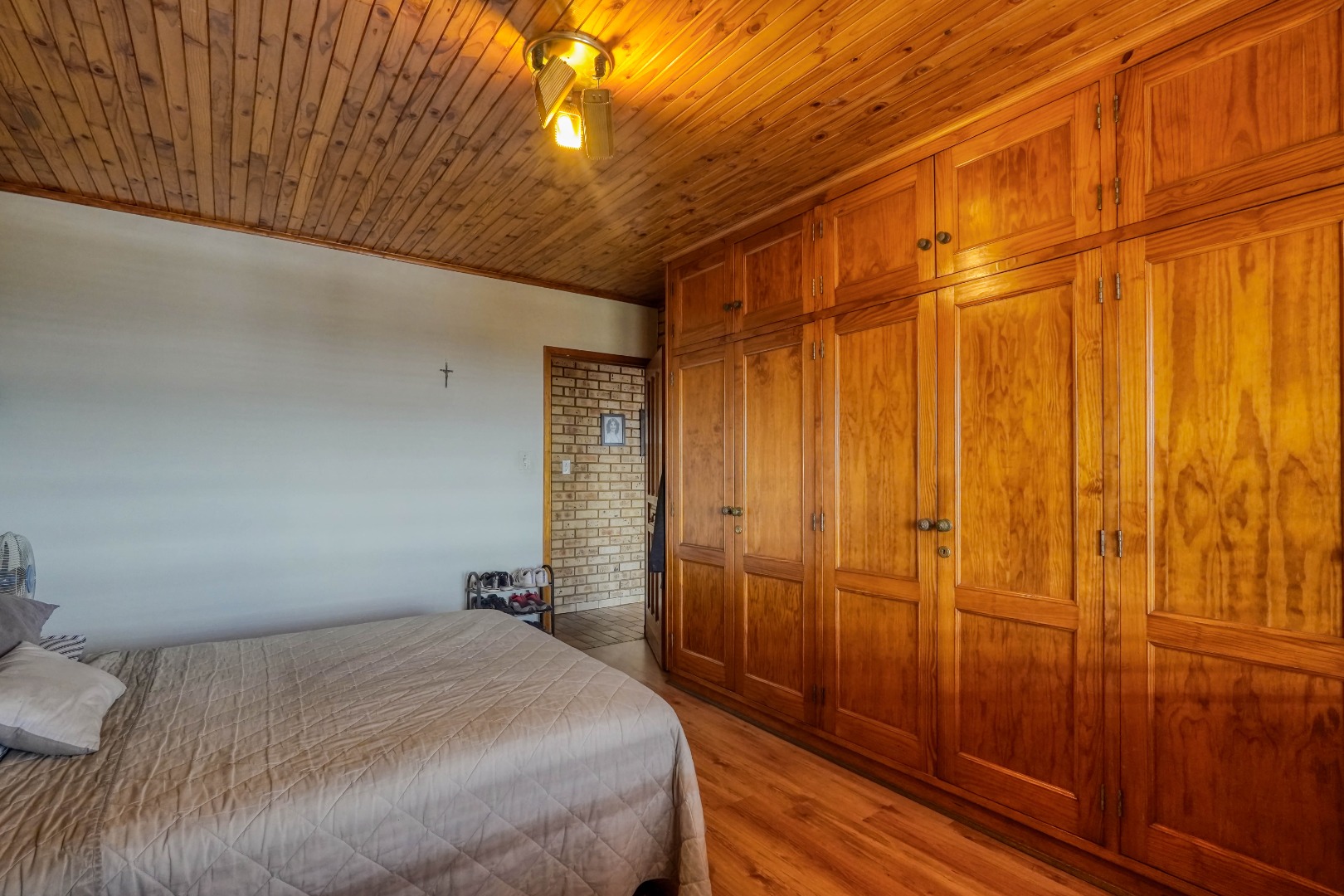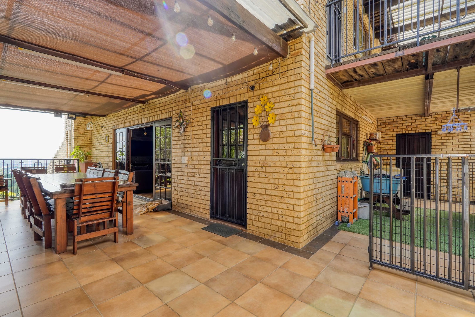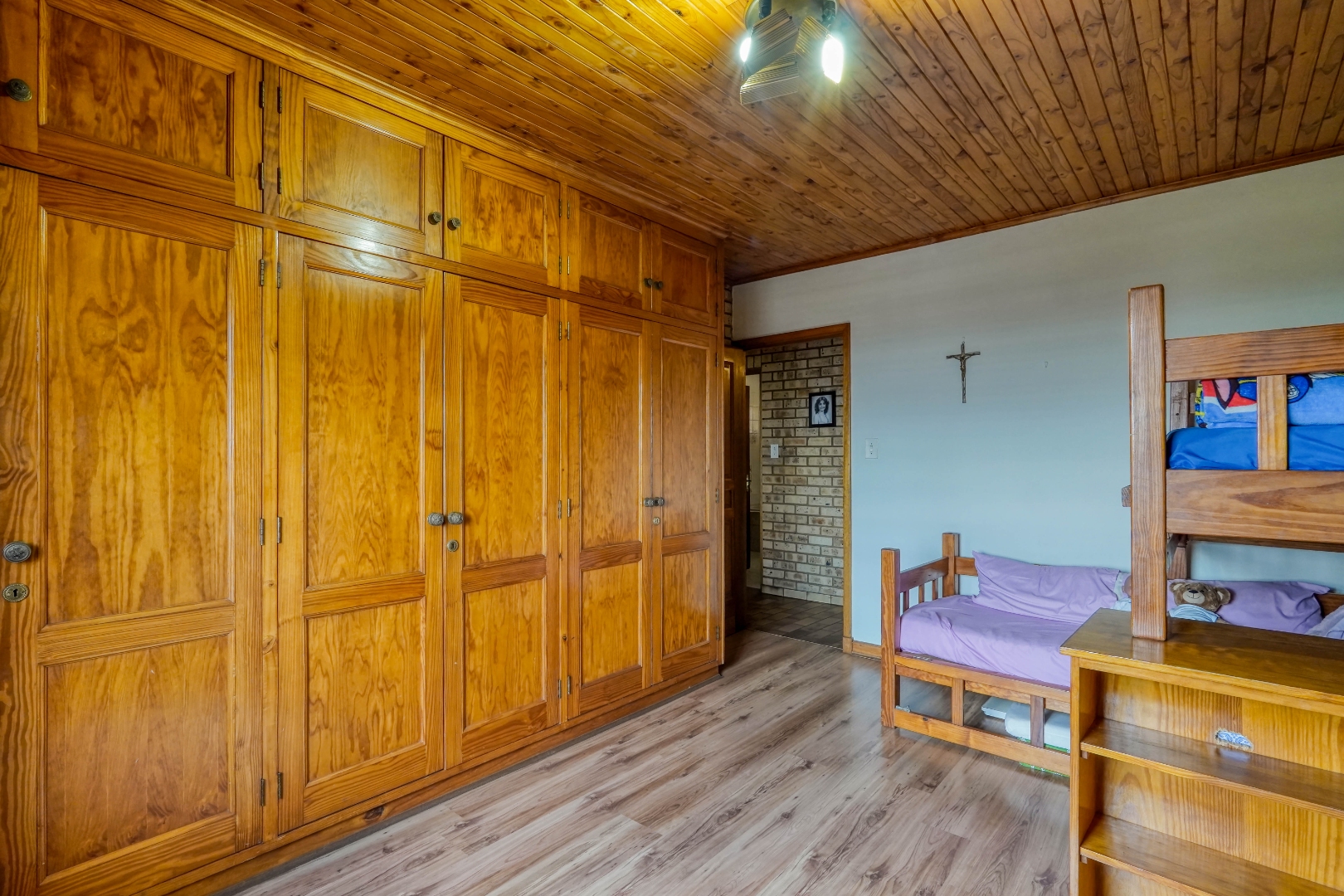 Moving up to the second level, the home shifts into its main living space. The kitchen is open plan and connects to the dining room and lounge, creating a central area for everyday living. A separate scullery and laundry area are positioned alongside for added practicality. From the living spaces, you step out onto a patio designed for entertaining, complete with a braai area.