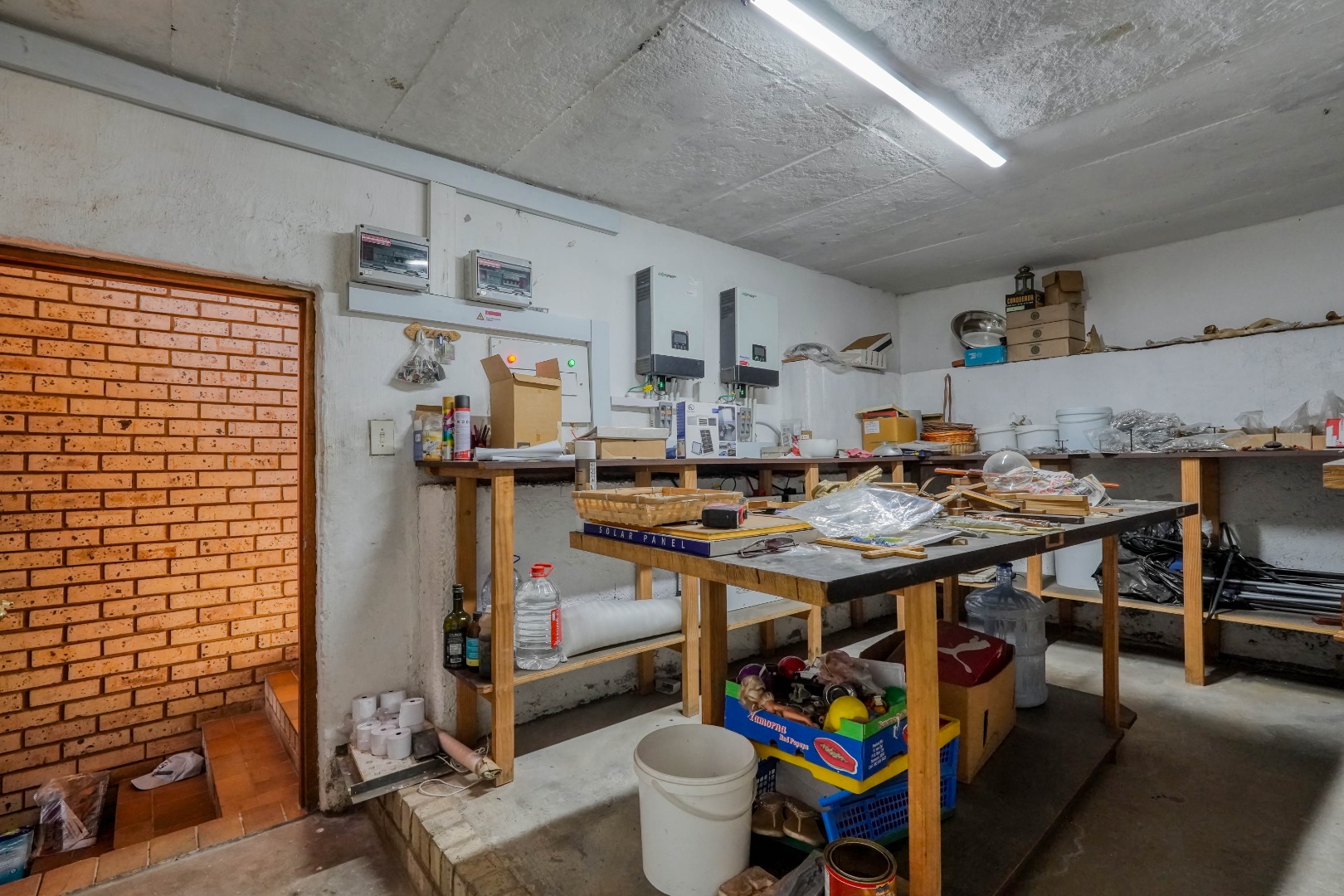 Additional features include solar panels with a battery and inverter, a water tank, multiple workshop areas within the garage space, two garages, and two carports.