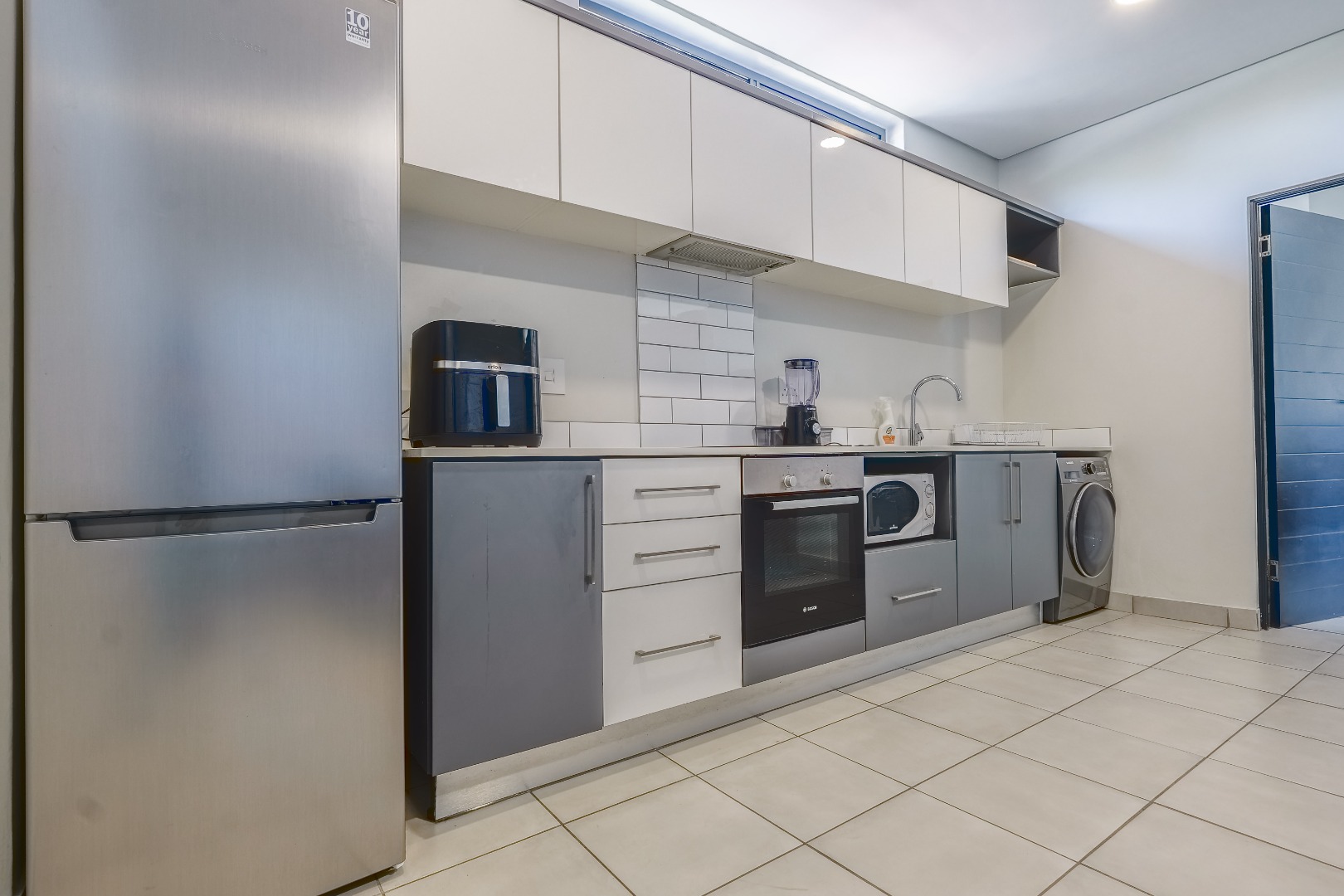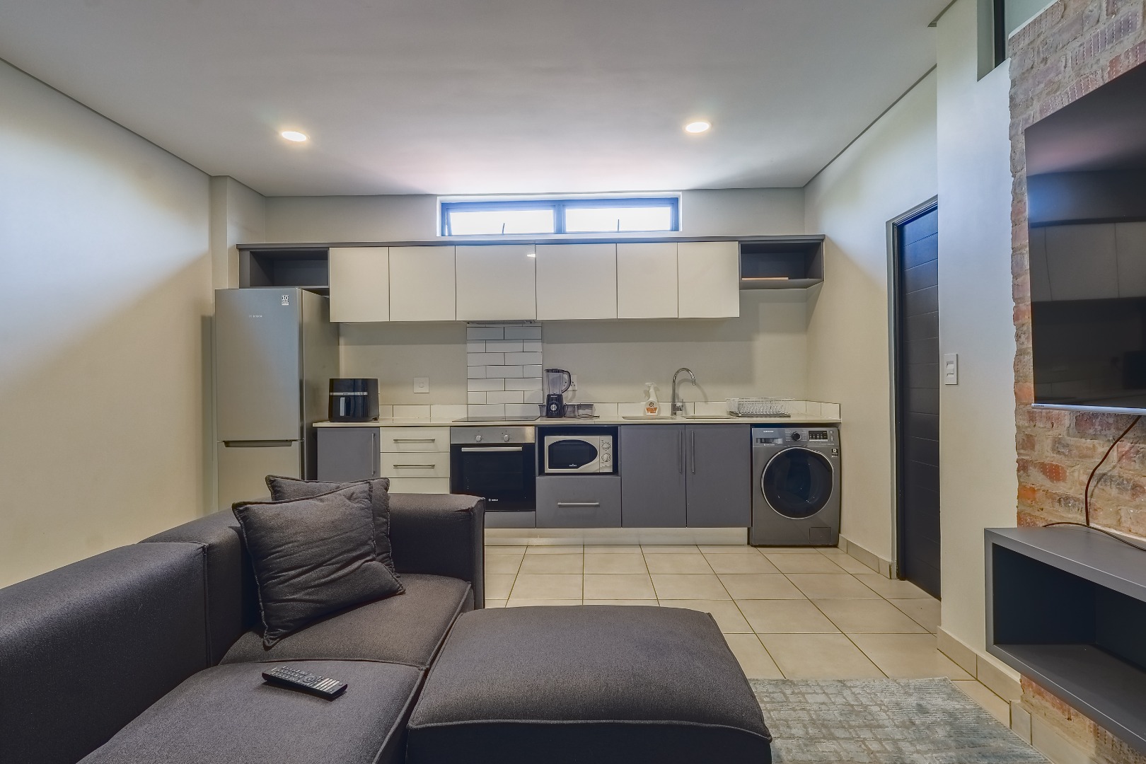 This modern 1-bedroom, 1-bathroom apartment offers sophisticated and convenient living in Menlo Park, Pretoria. The open-plan living area is designed for contemporary comfort, featuring a stylish exposed brick accent wall with space for a wall-mounted TV and a comfortable sectional sofa. The integrated kitchen boasts modern two-tone cabinetry, a subway tile backsplash, and essential appliances including a fridge, stove, oven, microwave, and washing and dryer machine. Tiled flooring throughout ensures a clean, low-maintenance environment. The well-appointed bedroom provides a private sanctuary with space for a study table. Natural light fills the room. The en-suite bathroom, accessible via a modern frosted sliding door, showcases sleek grey tiling, a floating vanity, and a contemporary glass-enclosed shower. Built-in wardrobes offer practical storage, contributing to the apartment's efficient design.