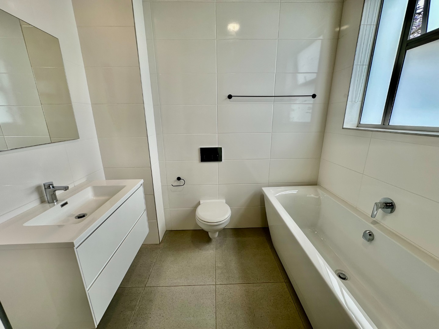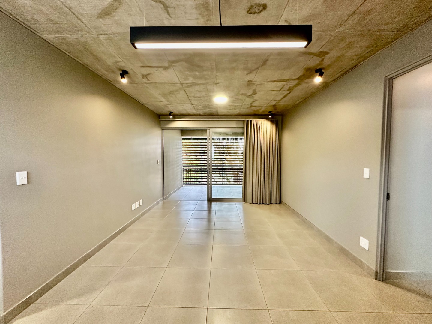 Spanning 104 sqm, the apartment boasts a contemporary open-plan design with an industrial-chic aesthetic, highlighted by exposed concrete ceilings and modern lighting. The heart of the home is a sleek kitchen, featuring light wood-look lower cabinets, high-gloss white upper cabinets, a white subway tile backsplash, and light-toned countertops. It comes equipped with a built-in oven, gas hob, extractor fan, and a double stainless steel sink, providing both functionality and style. The bright living area, with its neutral tiled floors and walls, seamlessly extends to a private balcony through large sliding glass doors, perfect for enjoying the scenic views and fresh air. A dedicated study nook offers a convenient workspace.