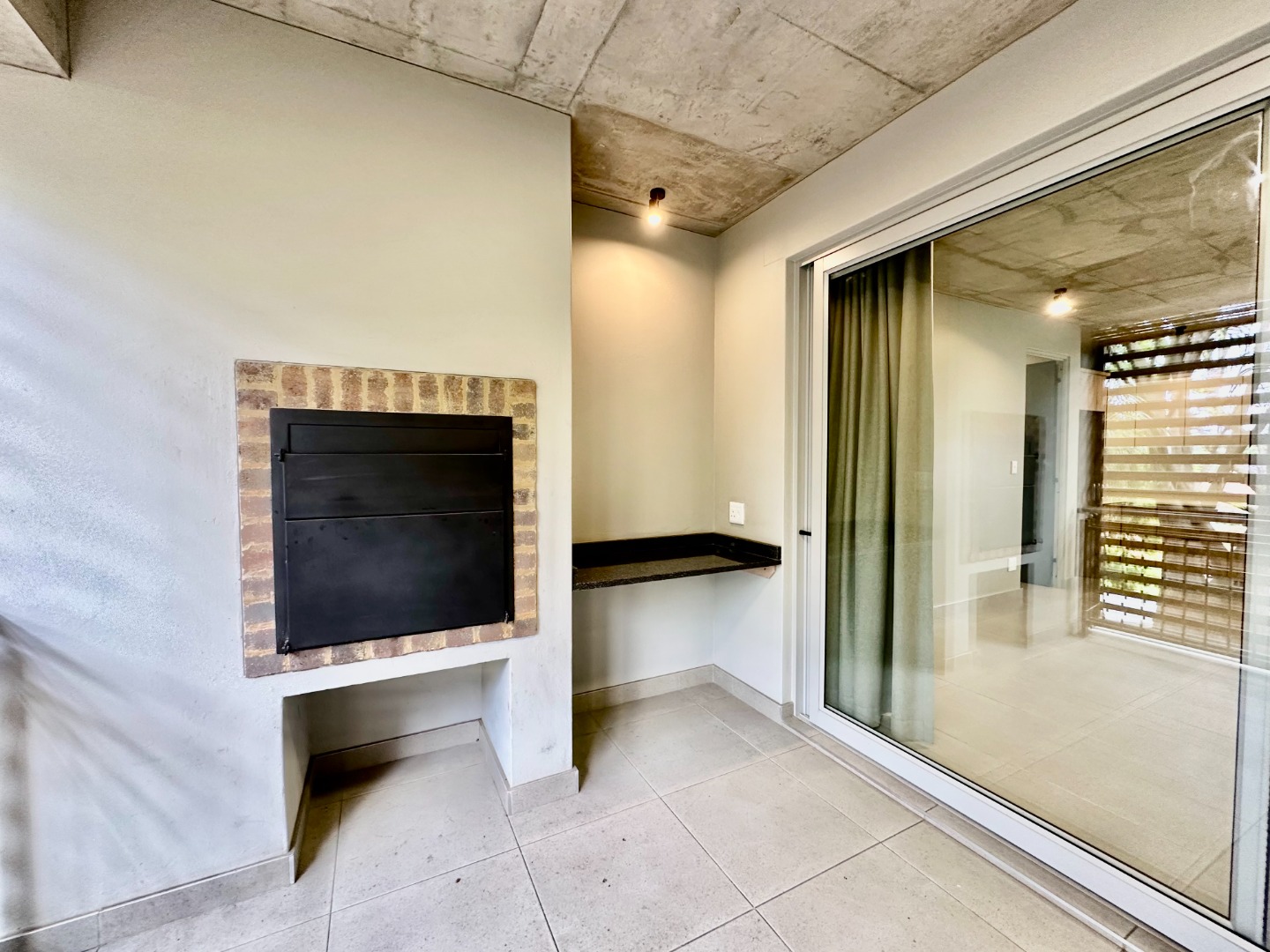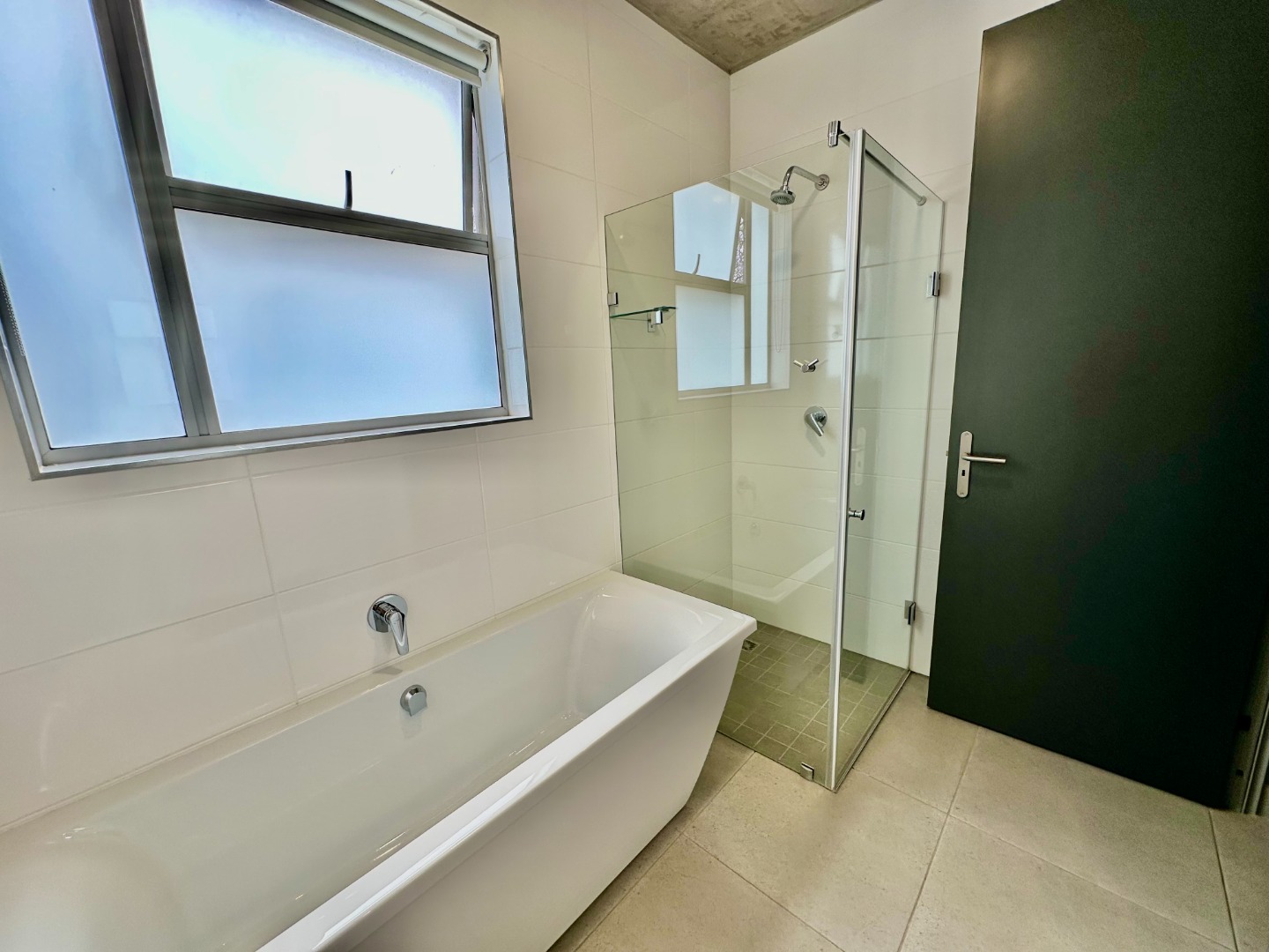 Both bedrooms are generously sized and feature their own modern en-suite bathrooms, ensuring privacy and comfort. One bathroom includes a contemporary glass partition and rainfall shower head. The property also benefits from two dedicated parking spaces and a built-in braai for outdoor entertaining.