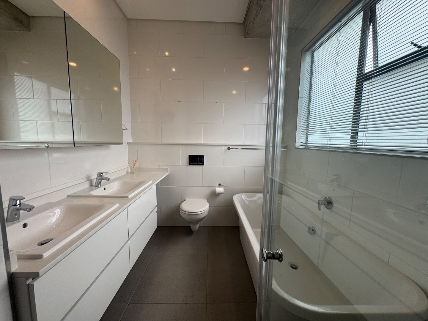 Both bedrooms feature extensive built-in wardrobes, offering ample storage, and benefit from abundant natural light. The two bathrooms are designed with modern aesthetics, including a dual-sink vanity, a wall-mounted toilet, and a combination of a bathtub and a separate glass-enclosed shower, ensuring comfort and convenience.