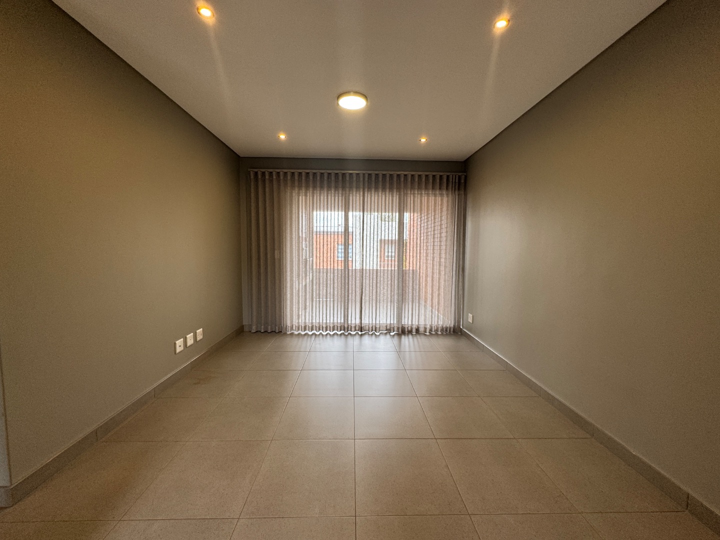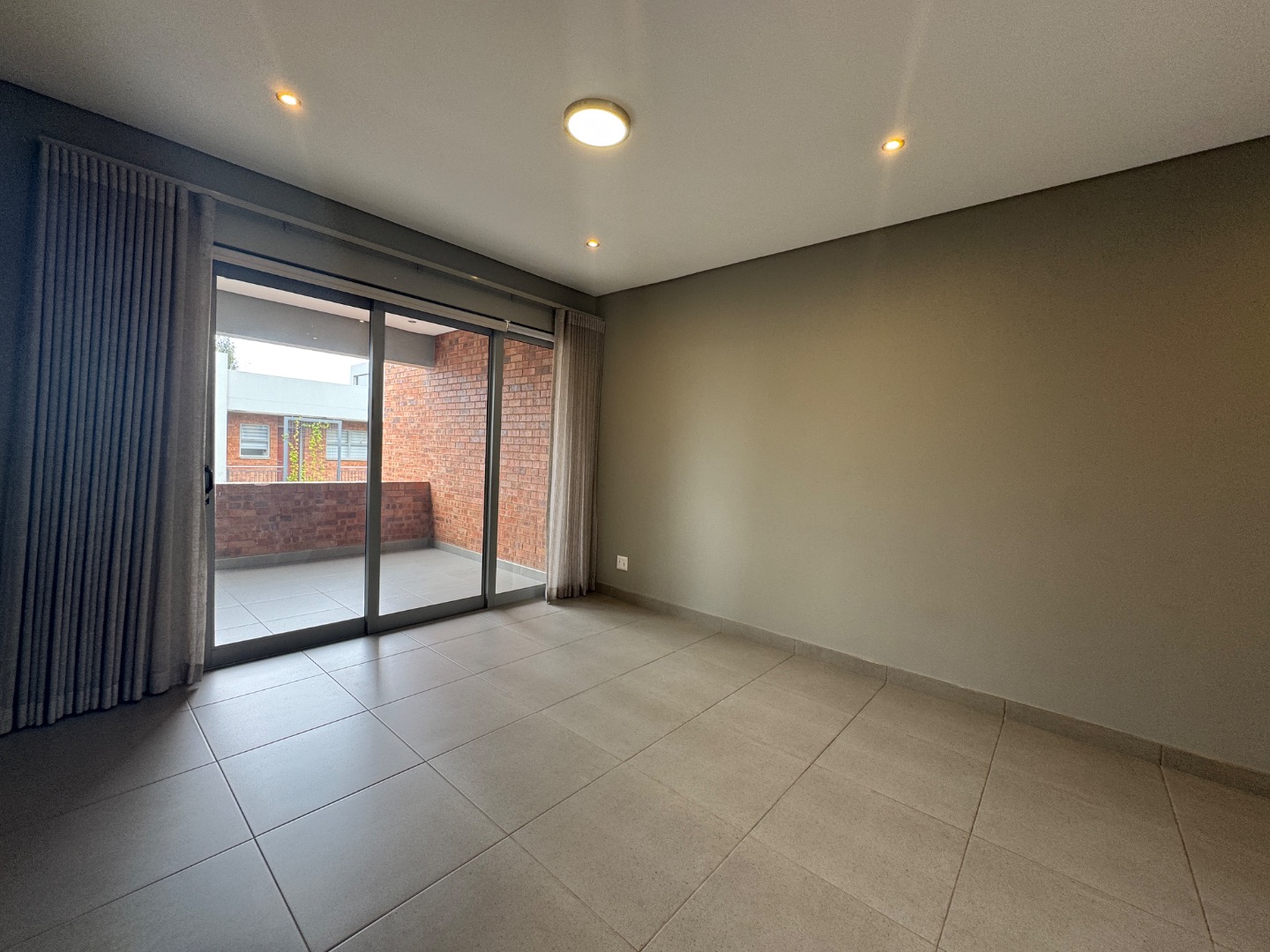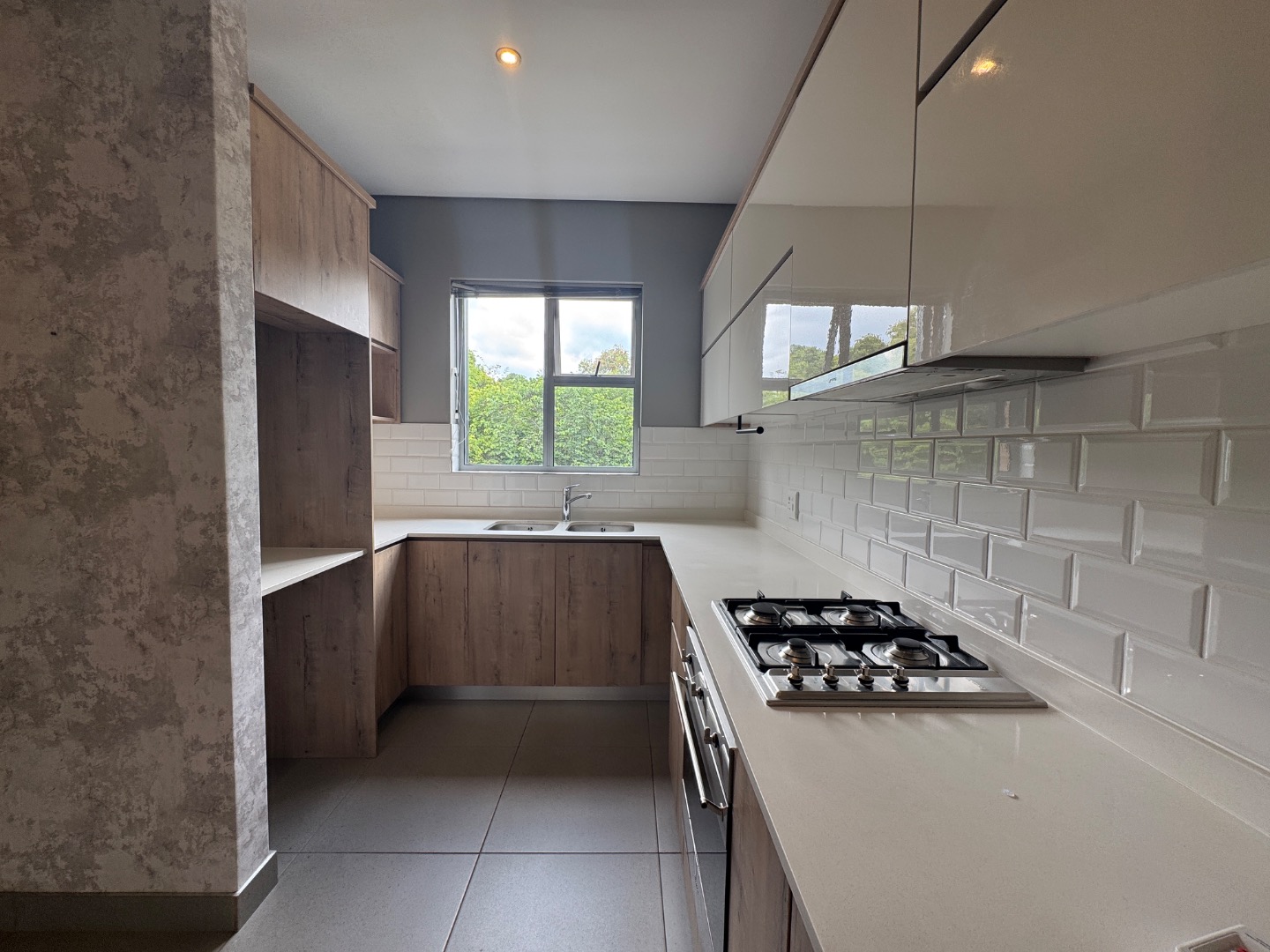 The open-plan living area seamlessly integrates a lounge, dining space, and a modern kitchen. The kitchen is well-appointed with contemporary wood-look and cream cabinetry, a sleek subway tile backsplash, an integrated oven, and a gas hob. Large sliding doors extend the living space to a private balcony or patio, complete with a built-in braai, ideal for entertaining or relaxing. Throughout the apartment, you'll find neutral tiled flooring and recessed ceiling lighting, creating a bright and inviting atmosphere.