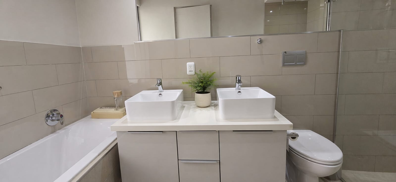 The residence includes two comfortable bedrooms, with both benefiting from an en-suite bathroom, alongside an additional guest toilet. Residents will appreciate the robust security measures, including 24-hour security, an access gate, and a security post, ensuring peace of mind. Connectivity is assured with fibre and satellite readiness. Two dedicated underground parking spaces are also provided.