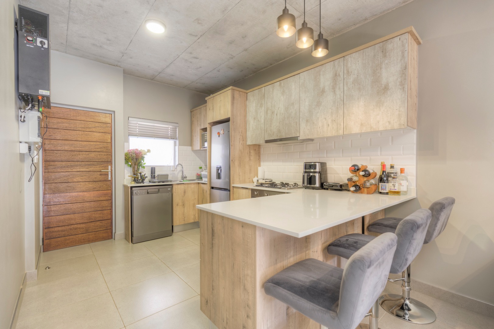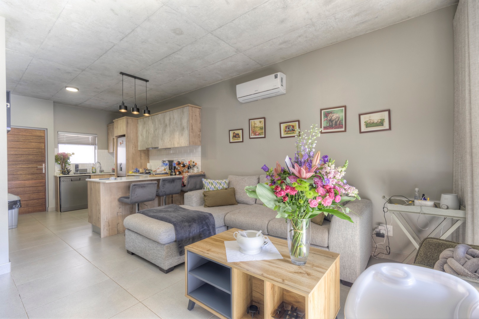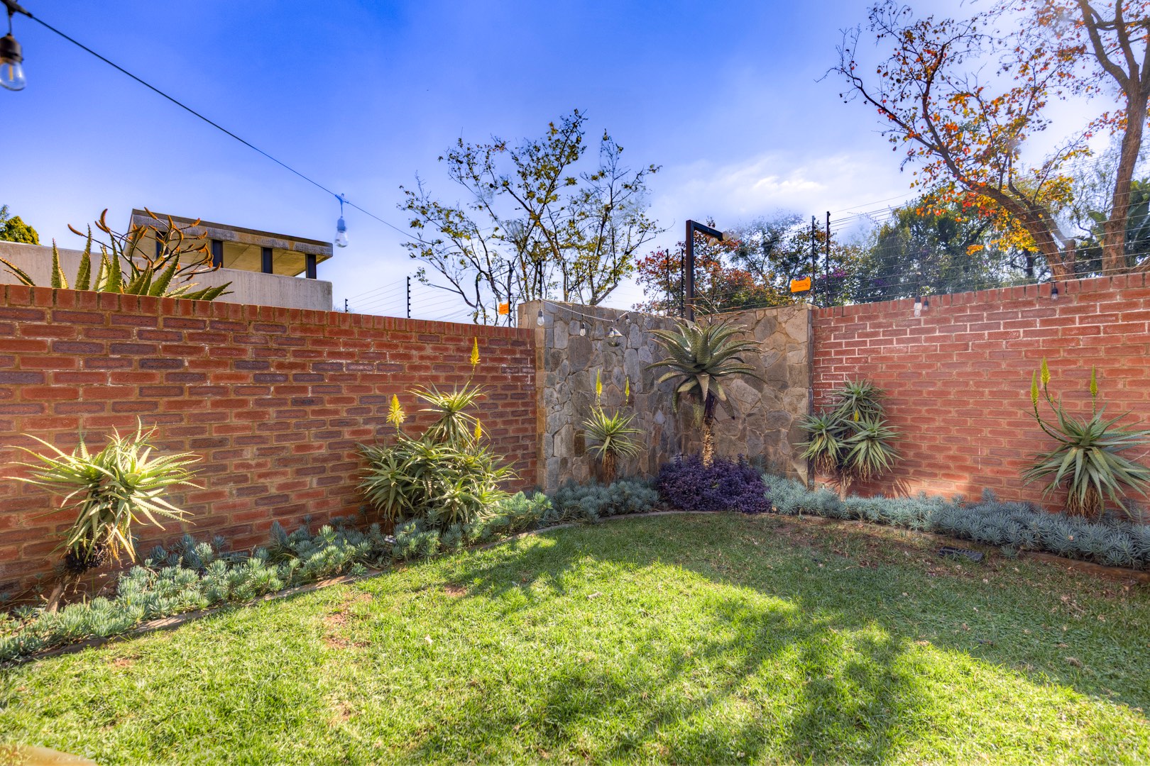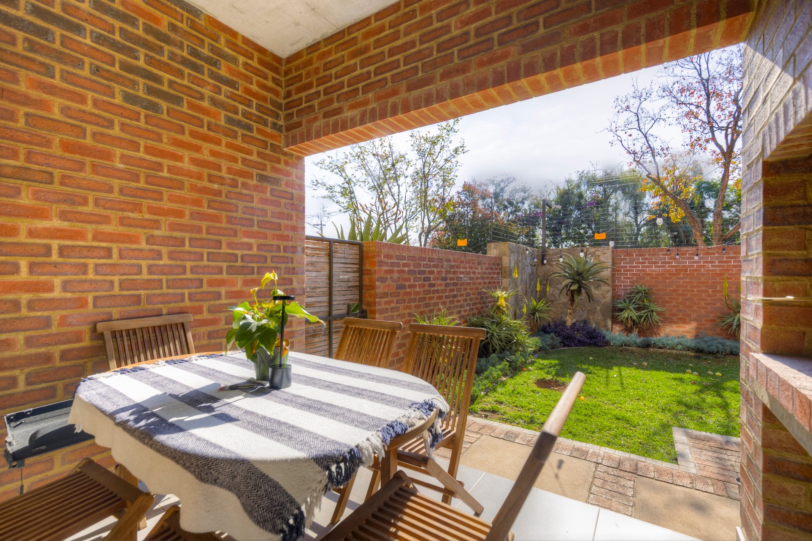 Through the sliding doors you'll find a covered patio featuring a built-in braai. This space overlooks a beautifully landscaped private garden, offering a perfect setting for relaxed outdoor living.