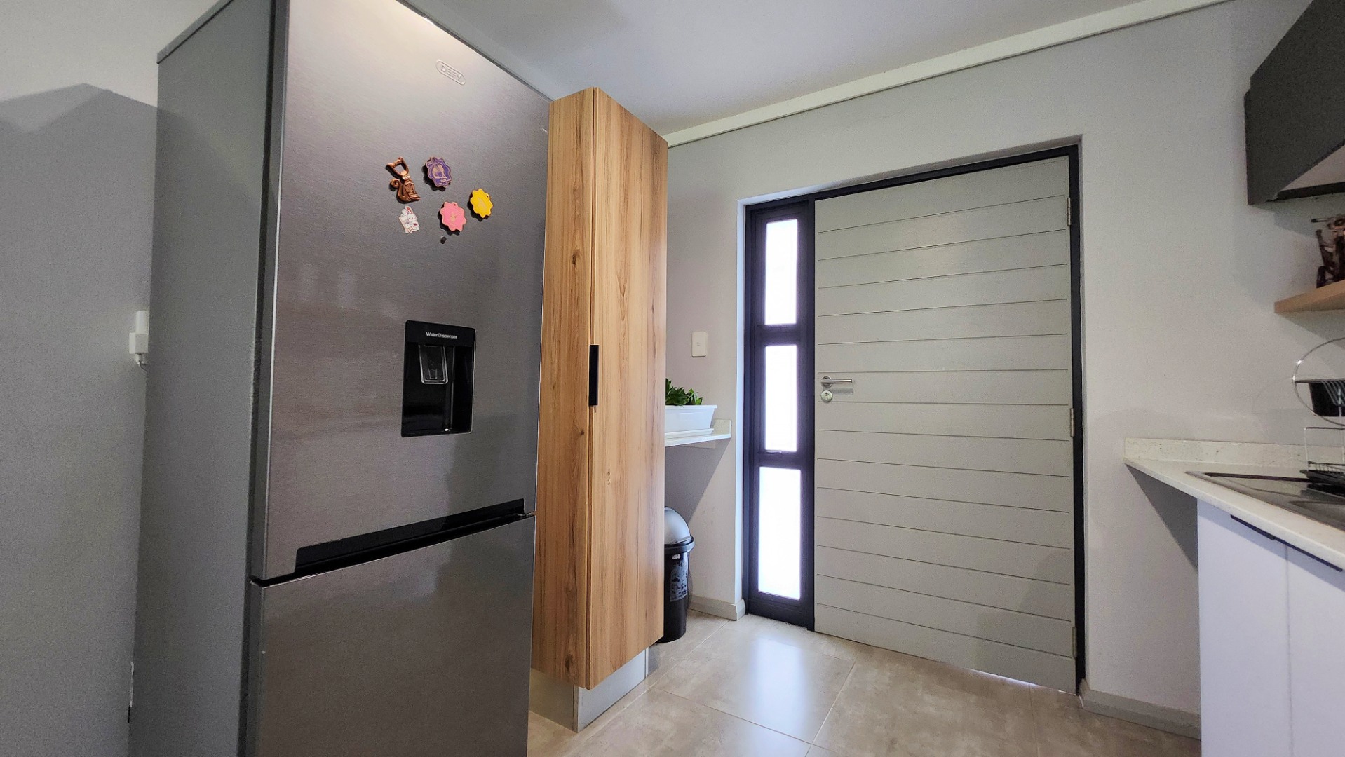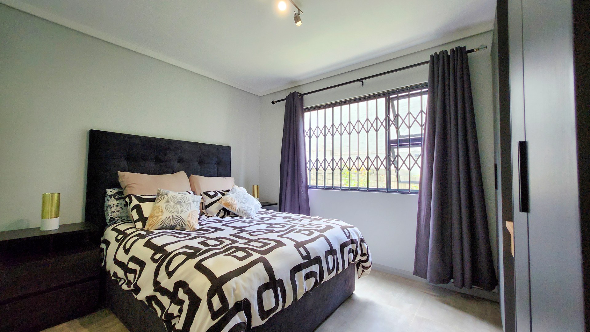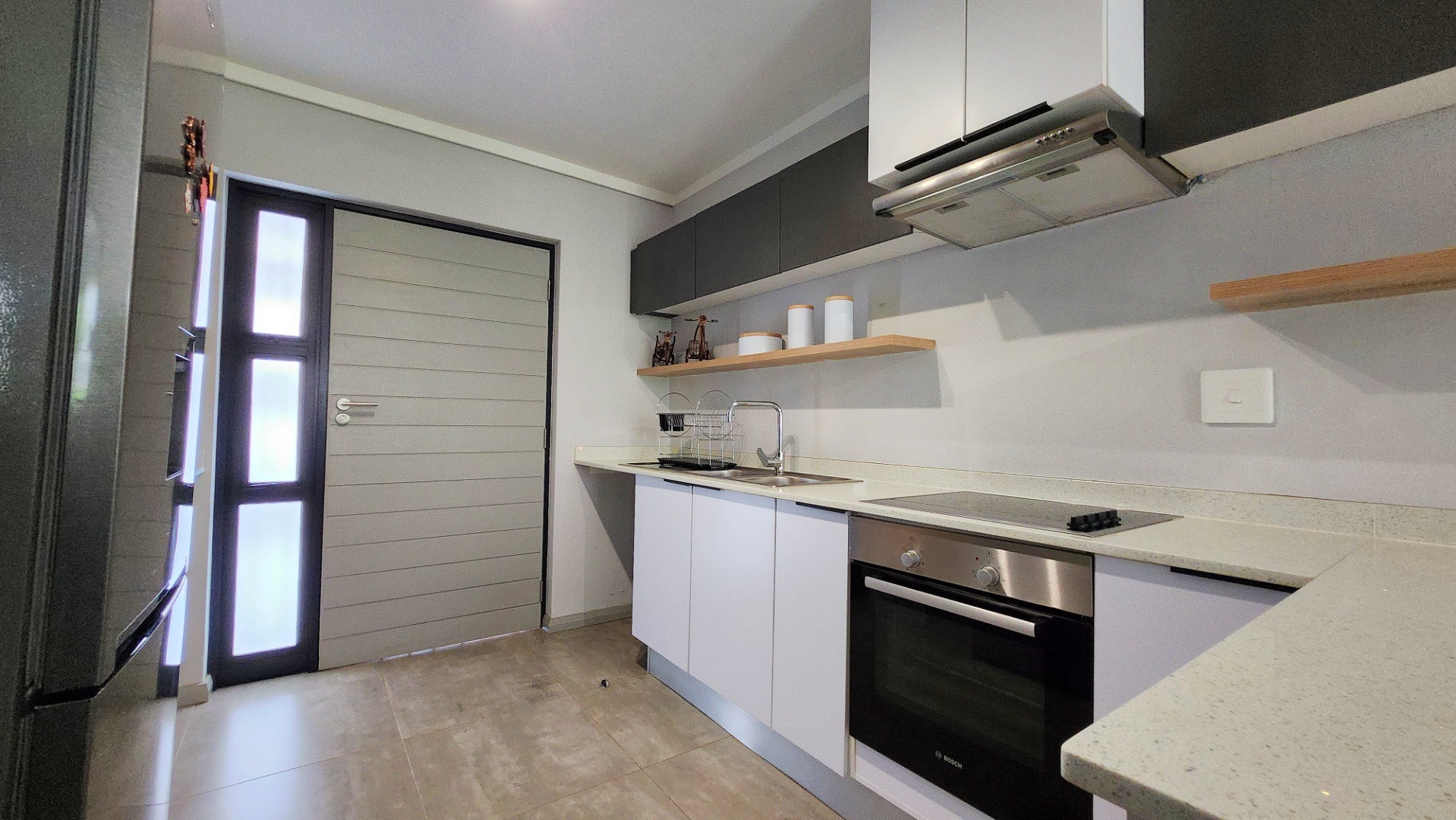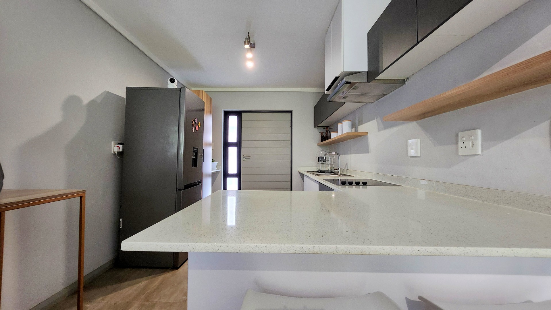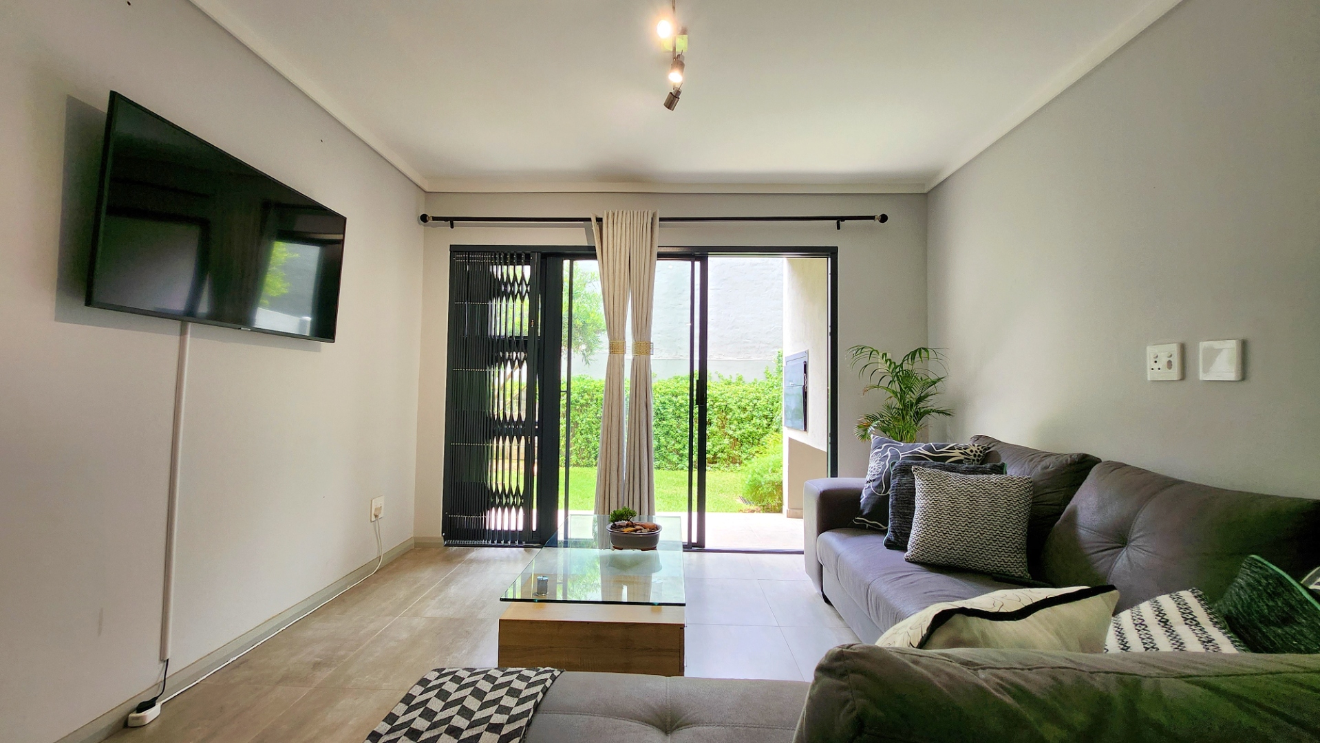The apartment features a bright open-plan living area that flows effortlessly onto a covered patio with a built-in braai, creating the perfect space for weekend gatherings and outdoor dining.