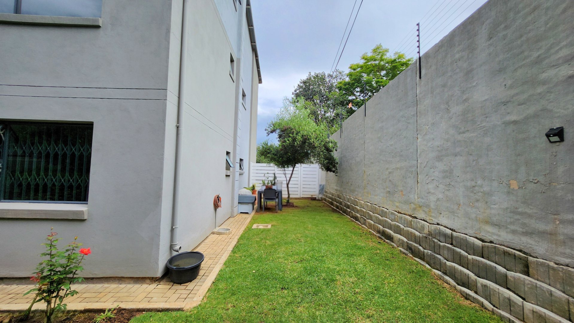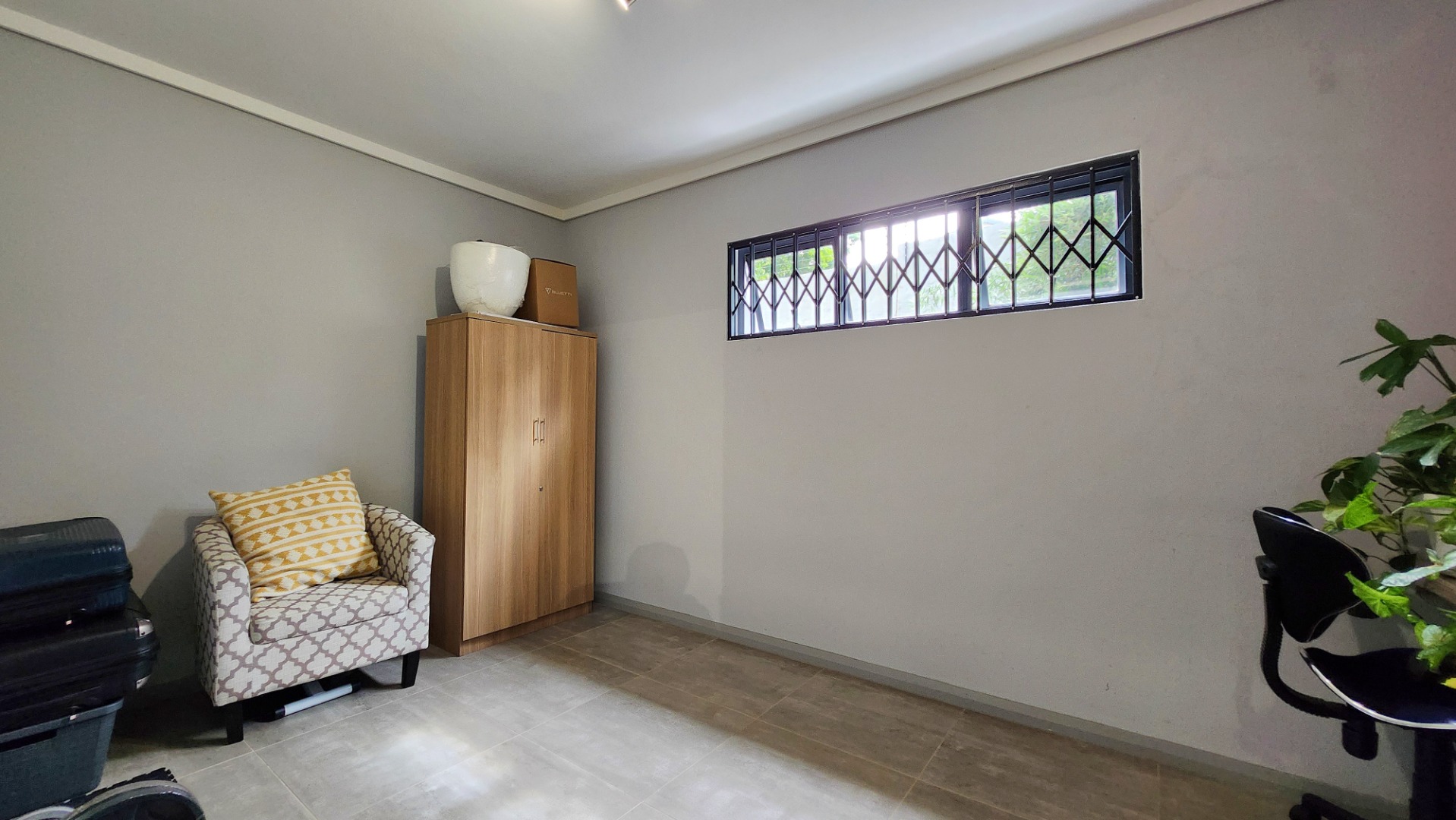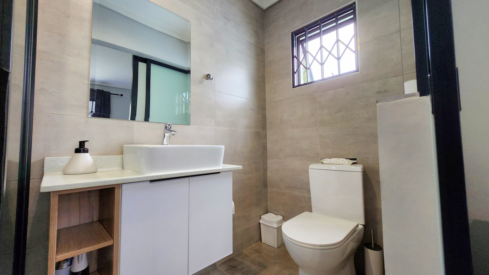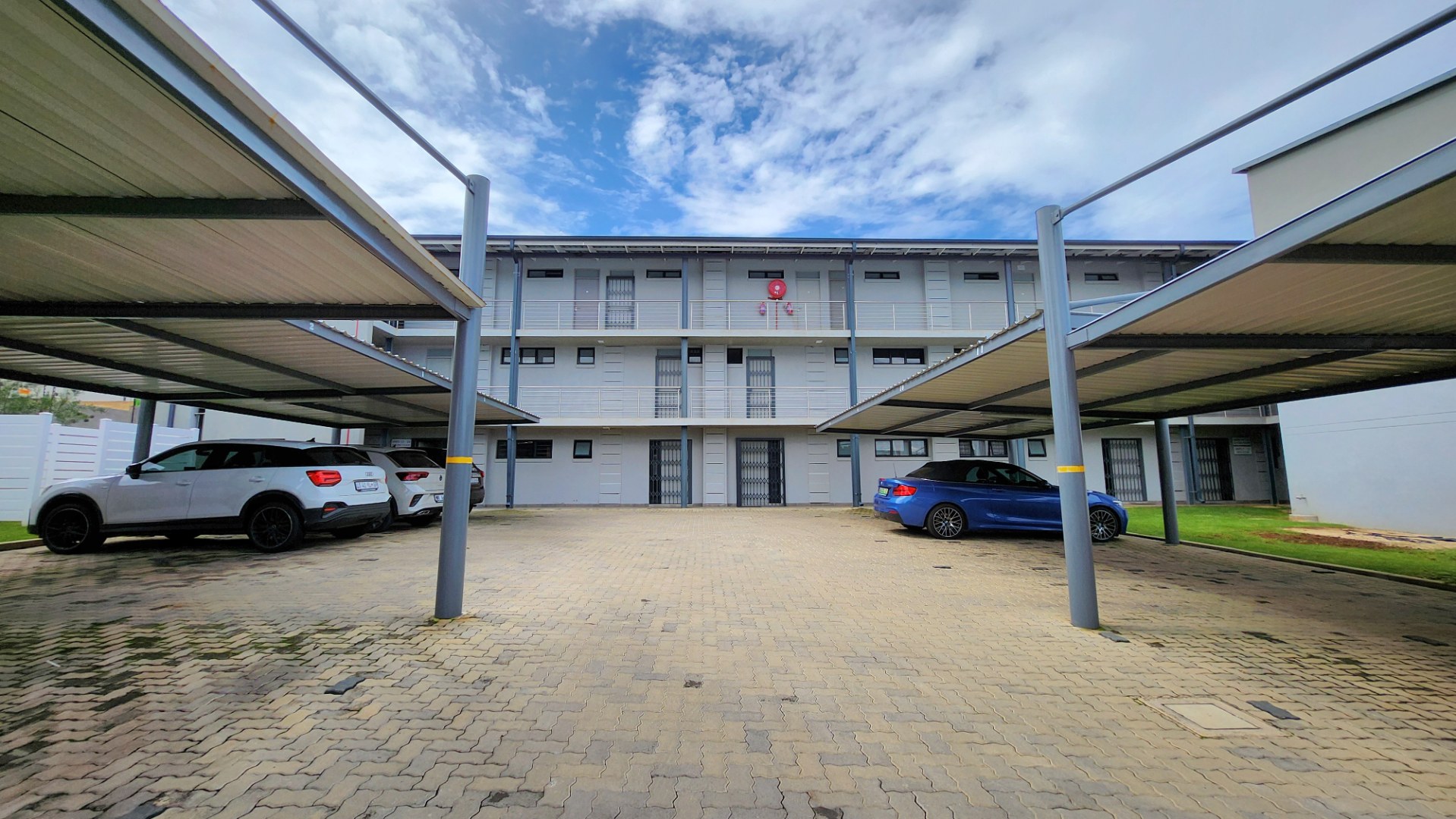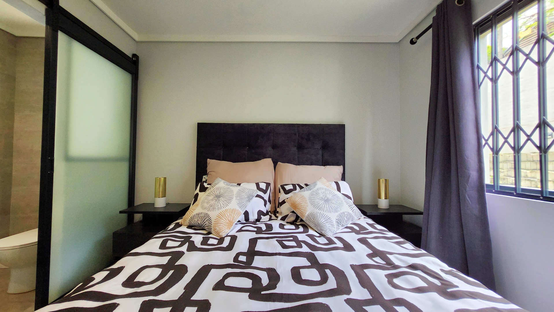 The apartment features a bright open-plan living area that flows effortlessly onto a covered patio with a built-in braai, creating the perfect space for weekend gatherings and outdoor dining.