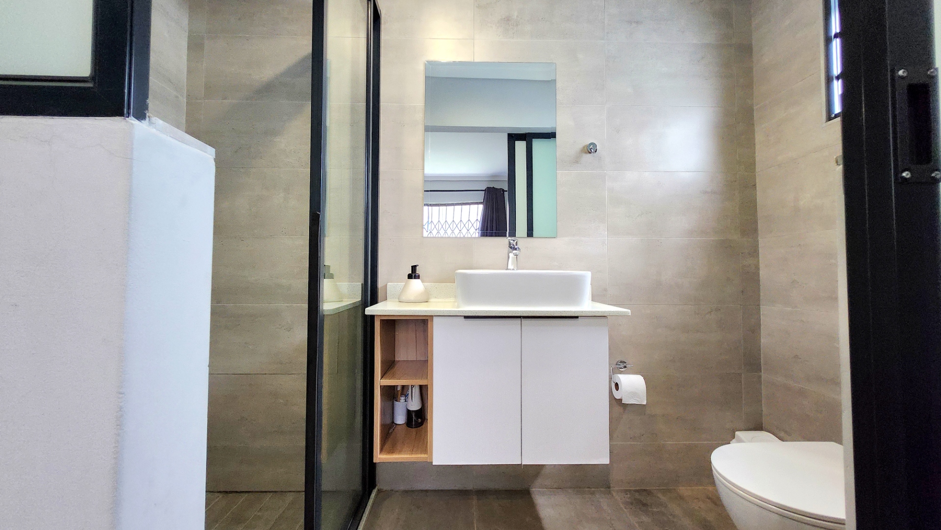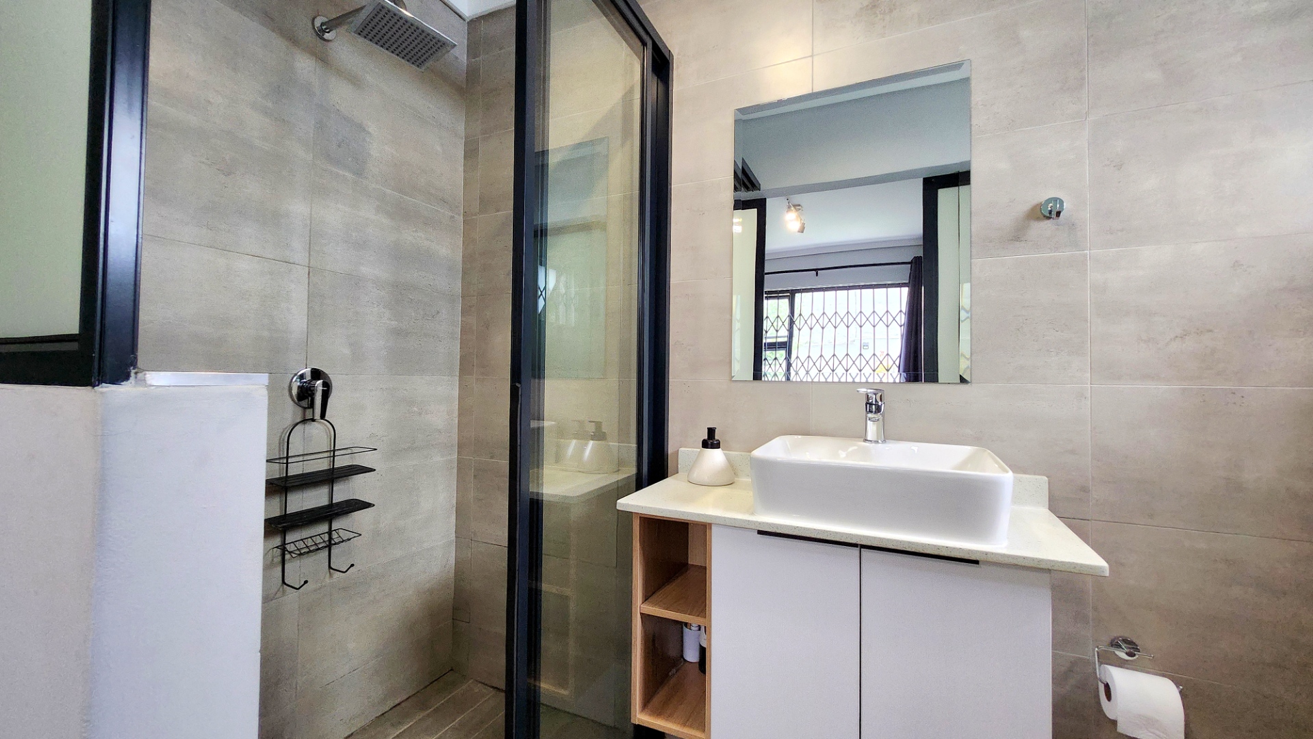 Both bedrooms are generously sized, with the main bedroom featuring a private en-suite bathroom with a shower, while the second bathroom offers a shower and bathtub combination, ideal for guests or family living.