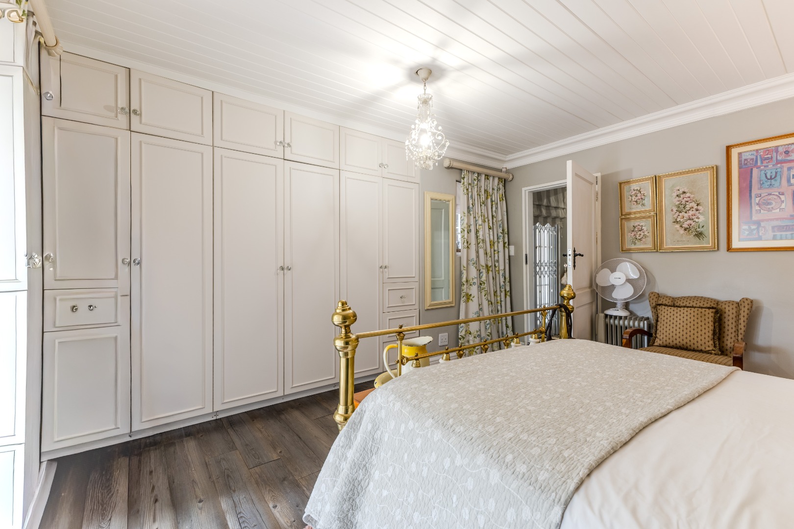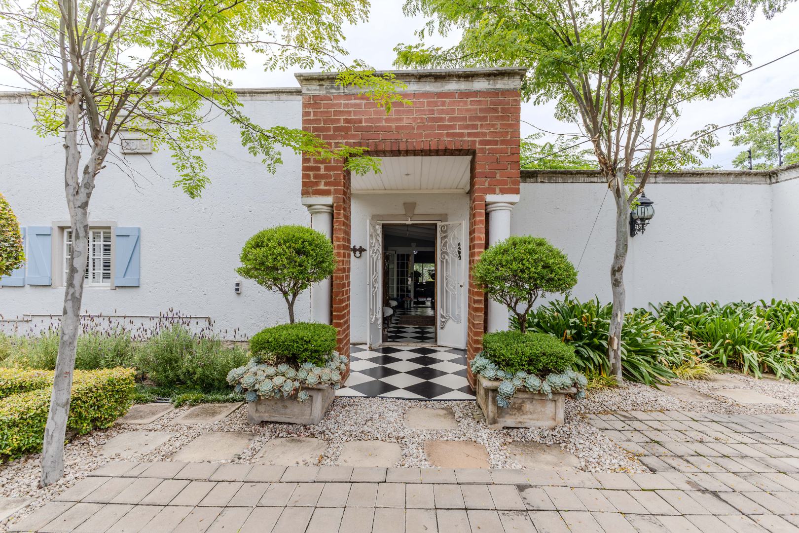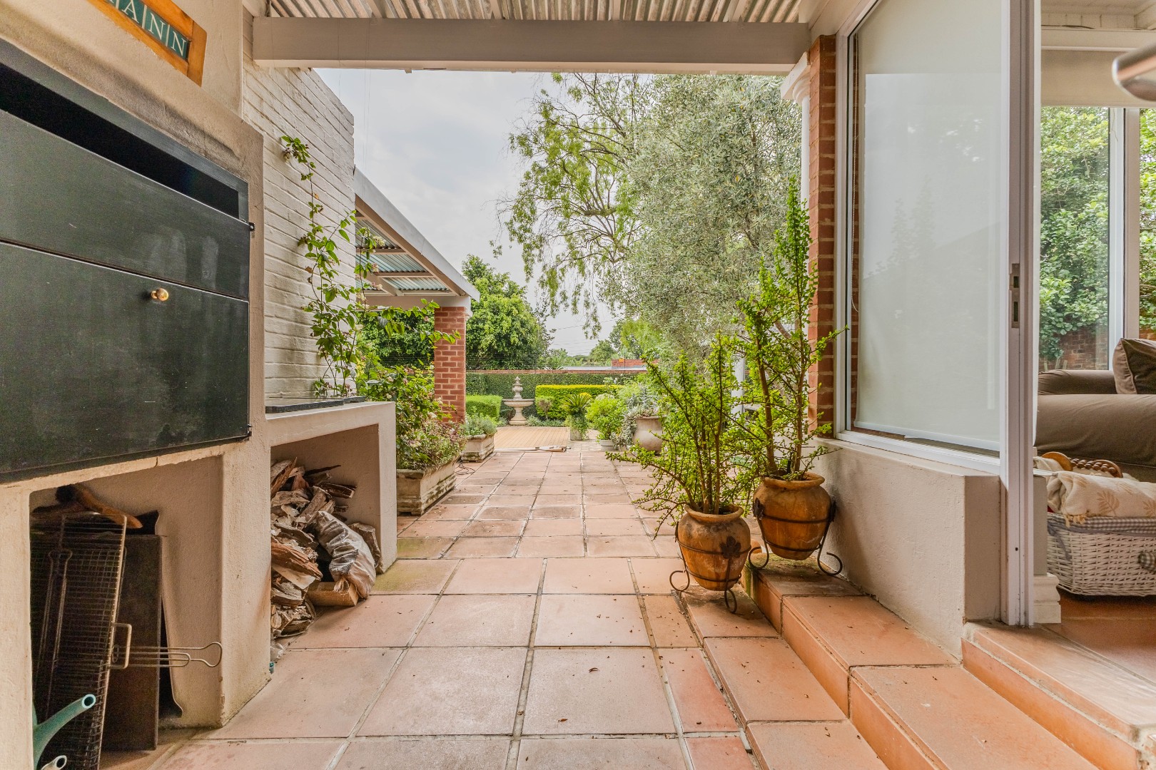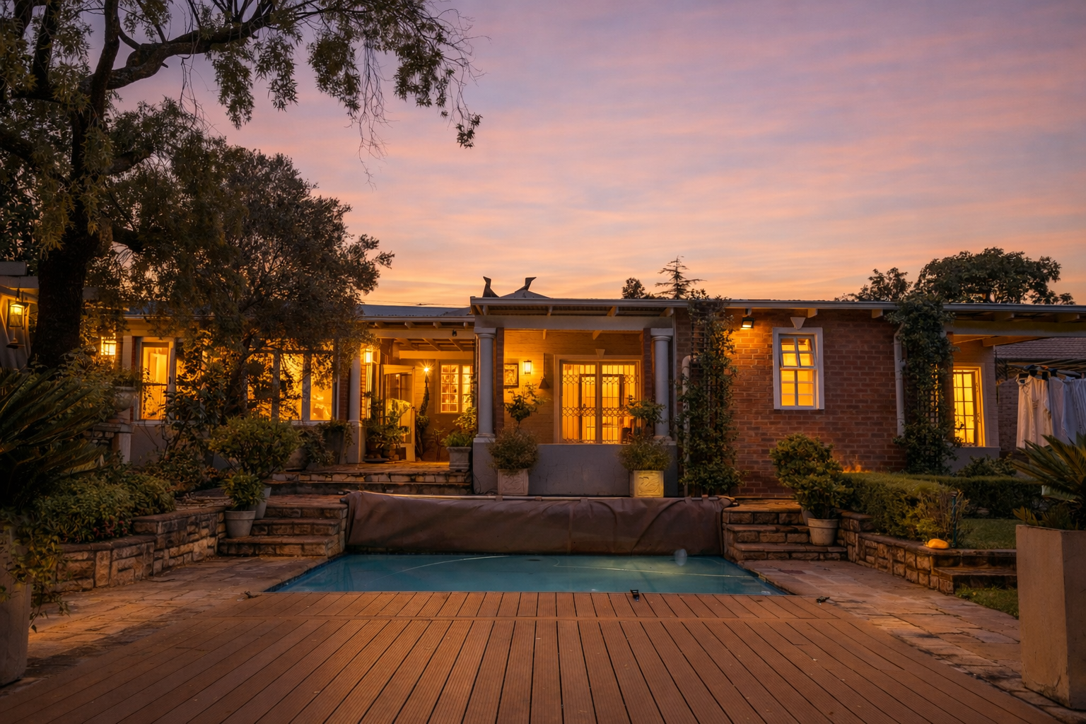 Nestled in a tranquil cul-de-sac within the sought-after Menlo Park suburb of Pretoria, this charming residence offers a blend of classic elegance and modern comfort. The property immediately captivates with its European-inspired facade, featuring white stucco, distinctive light blue shutters, and an elegant red brick entrance portico.