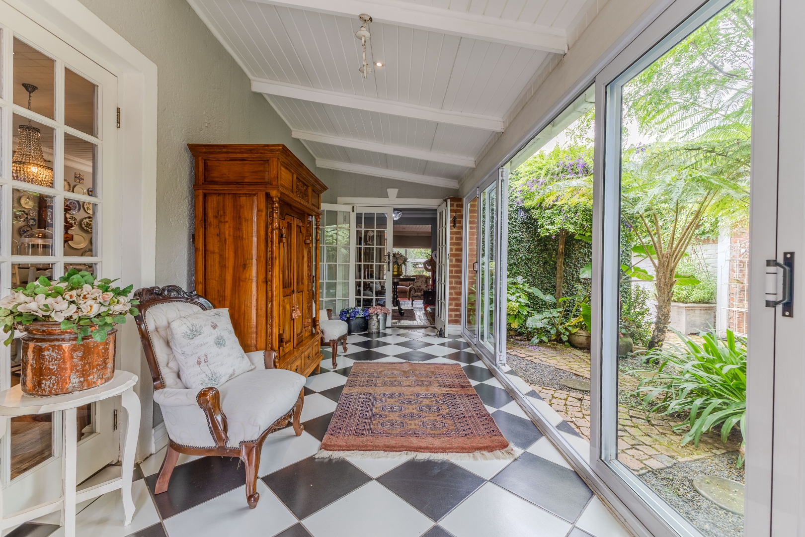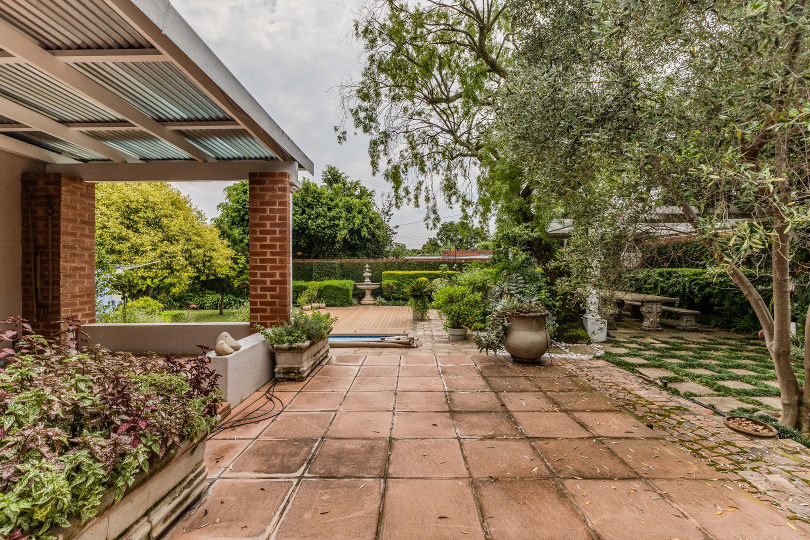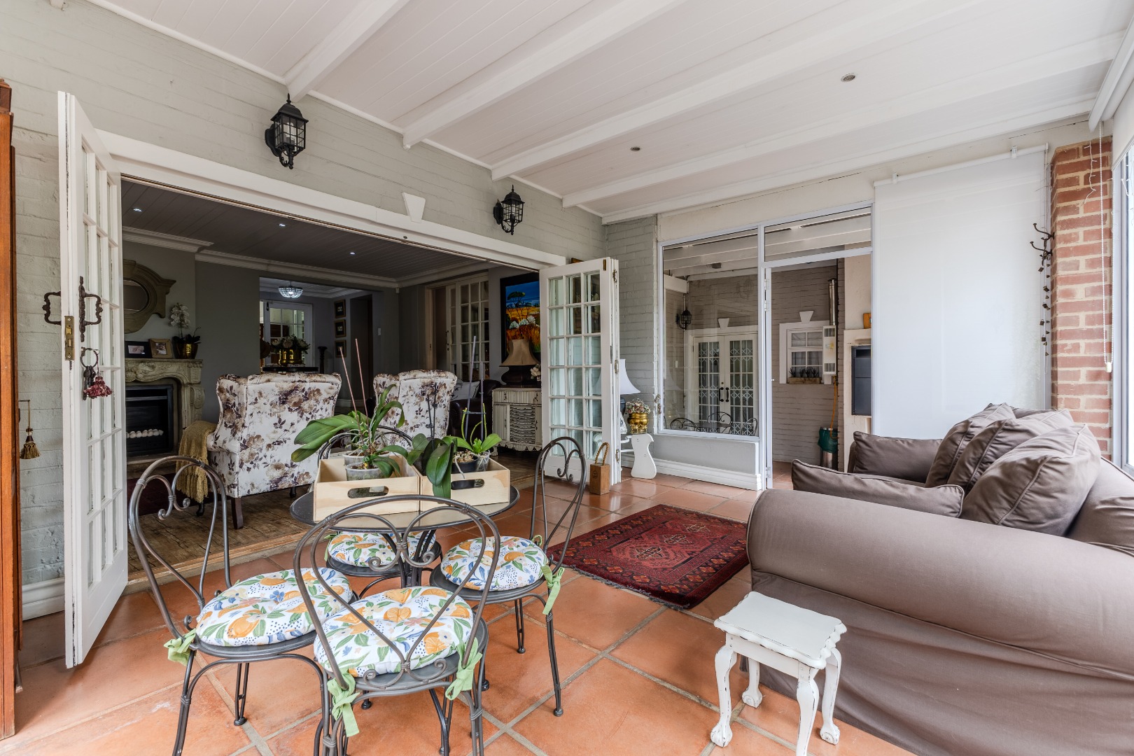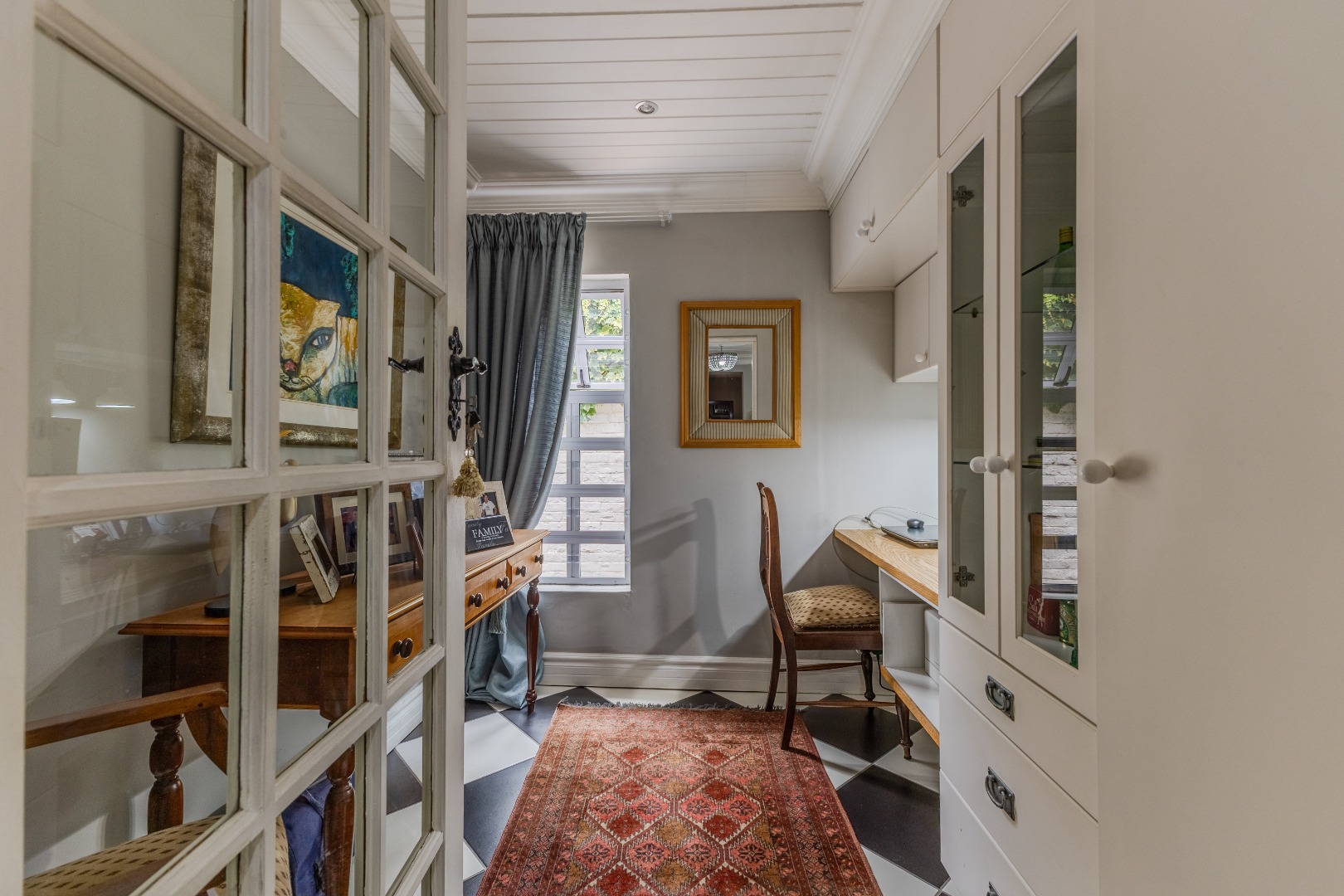 Nestled in a tranquil cul-de-sac within the sought-after Menlo Park suburb of Pretoria, this charming residence offers a blend of classic elegance and modern comfort. The property immediately captivates with its European-inspired facade, featuring white stucco, distinctive light blue shutters, and an elegant red brick entrance portico.