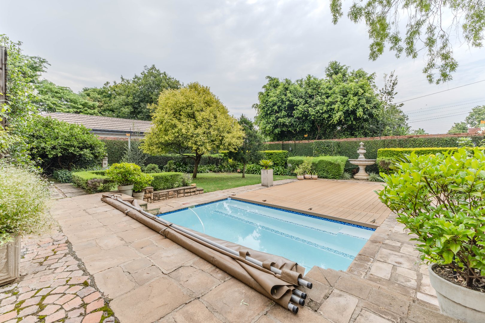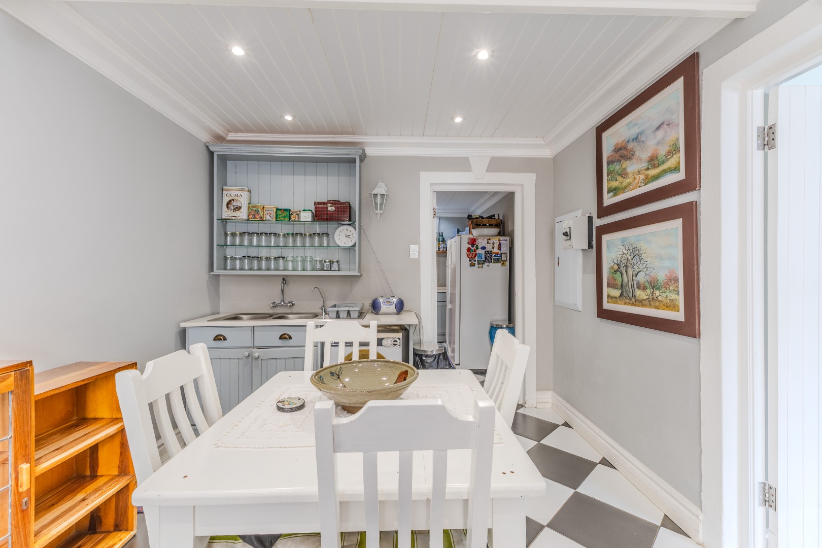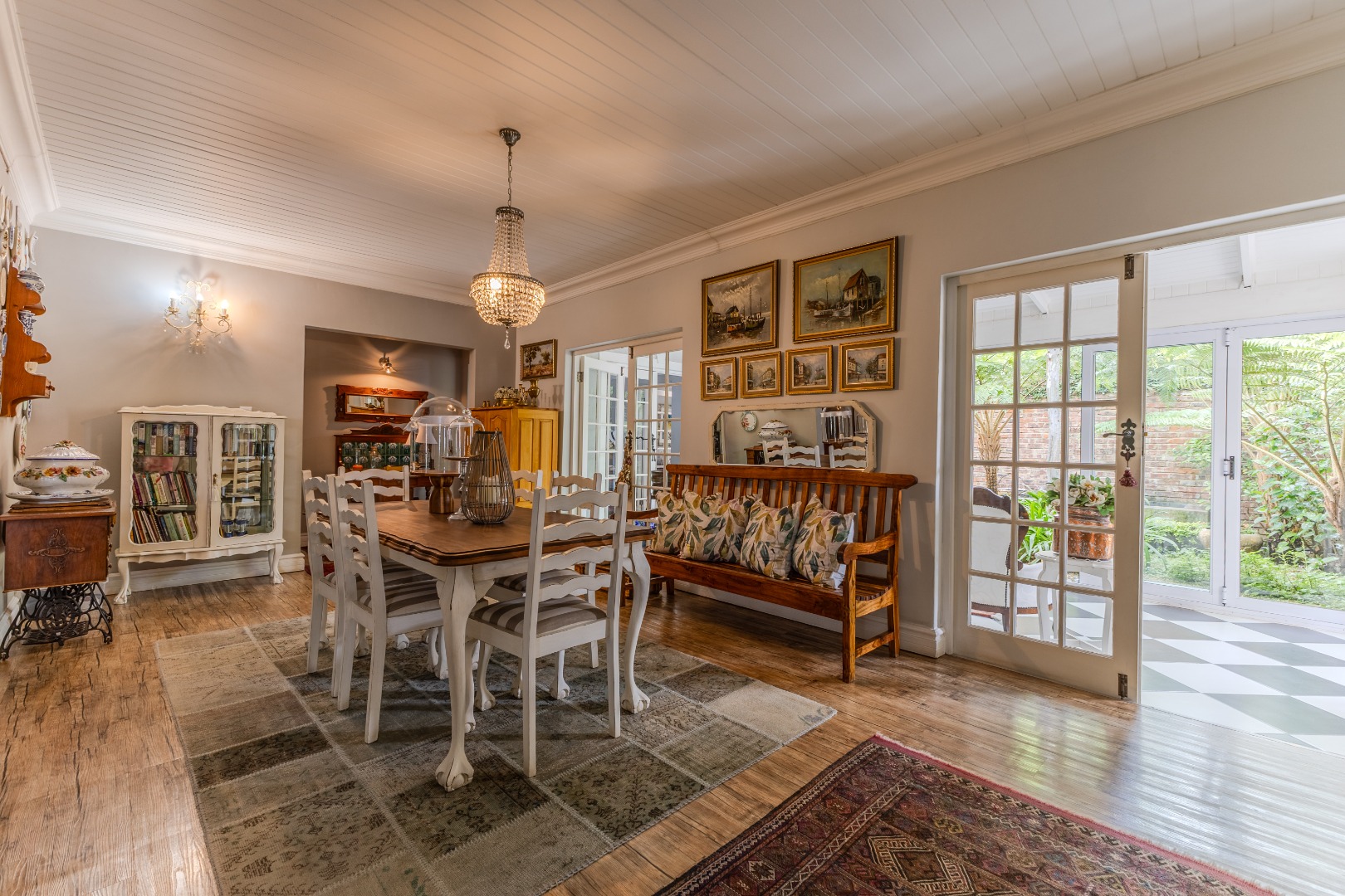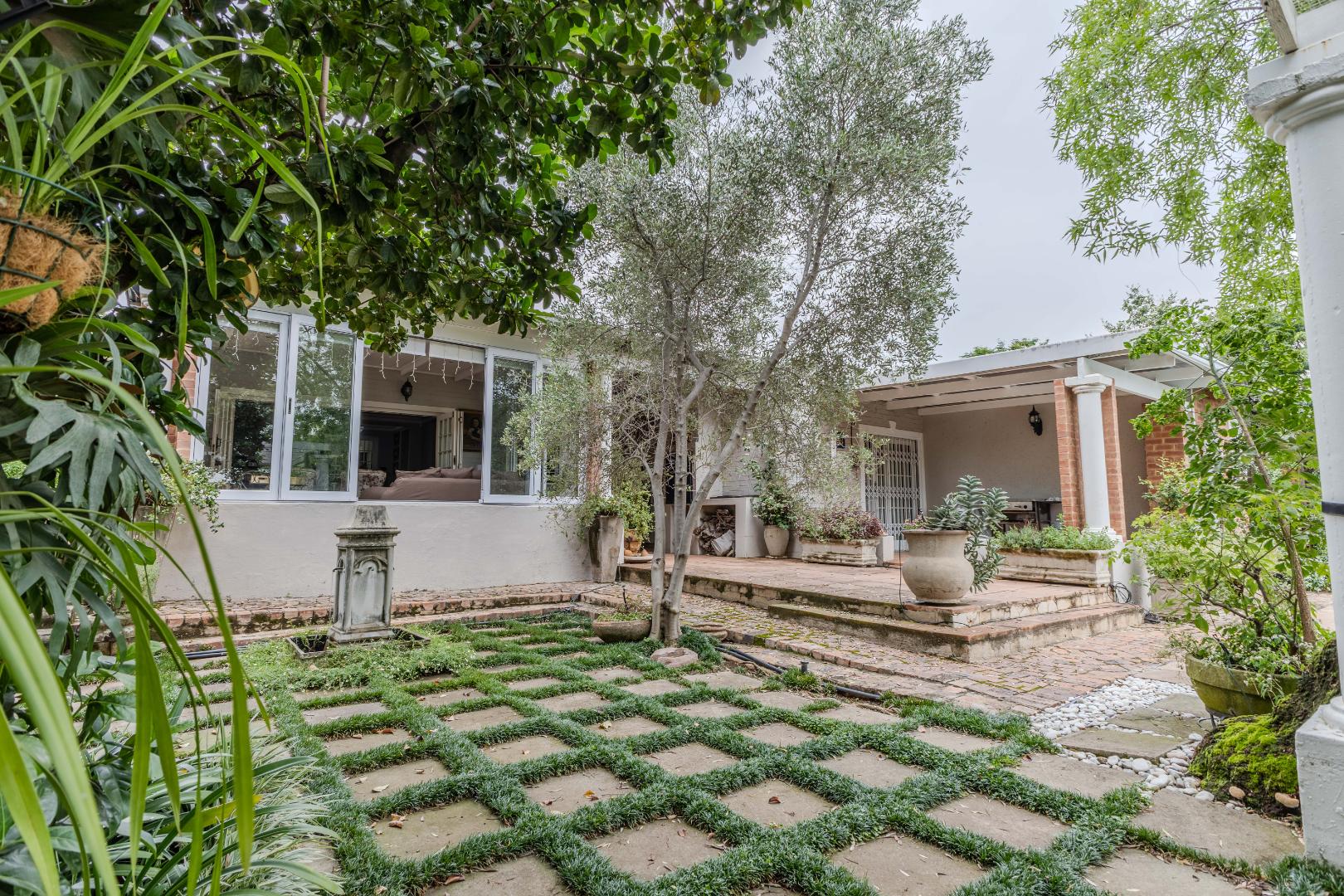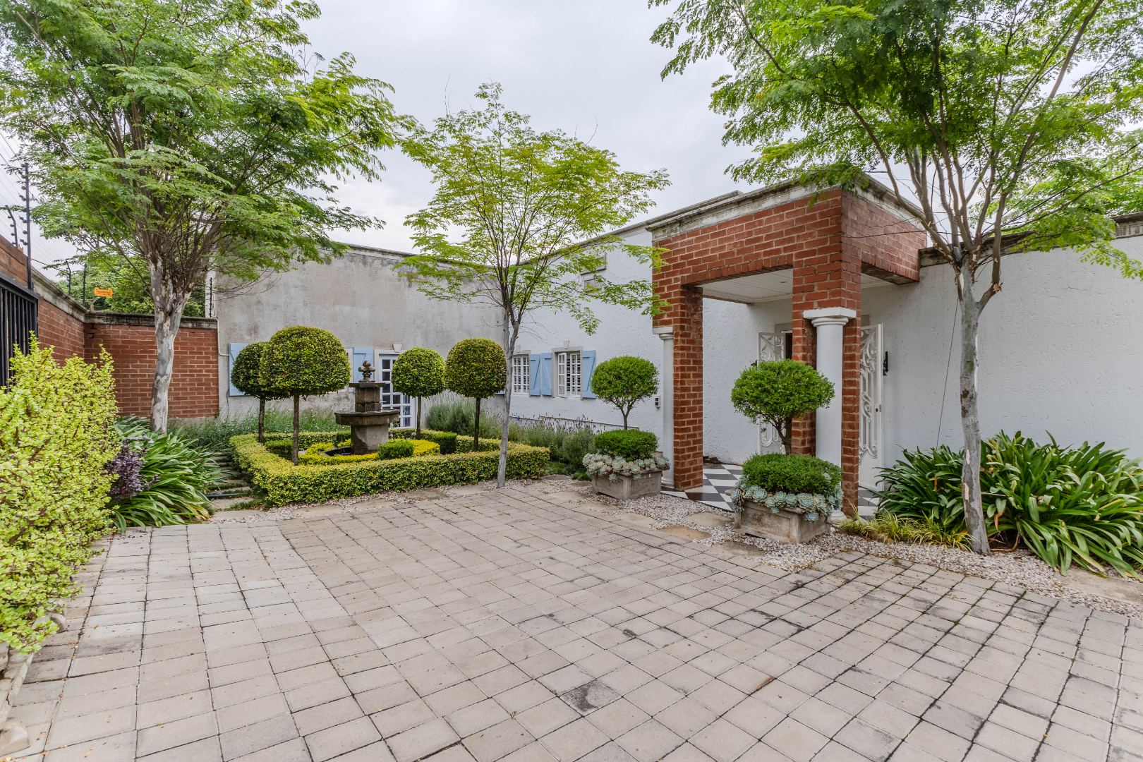 Nestled in a tranquil cul-de-sac within the sought-after Menlo Park suburb of Pretoria, this charming residence offers a blend of classic elegance and modern comfort. The property immediately captivates with its European-inspired facade, featuring white stucco, distinctive light blue shutters, and an elegant red brick entrance portico.