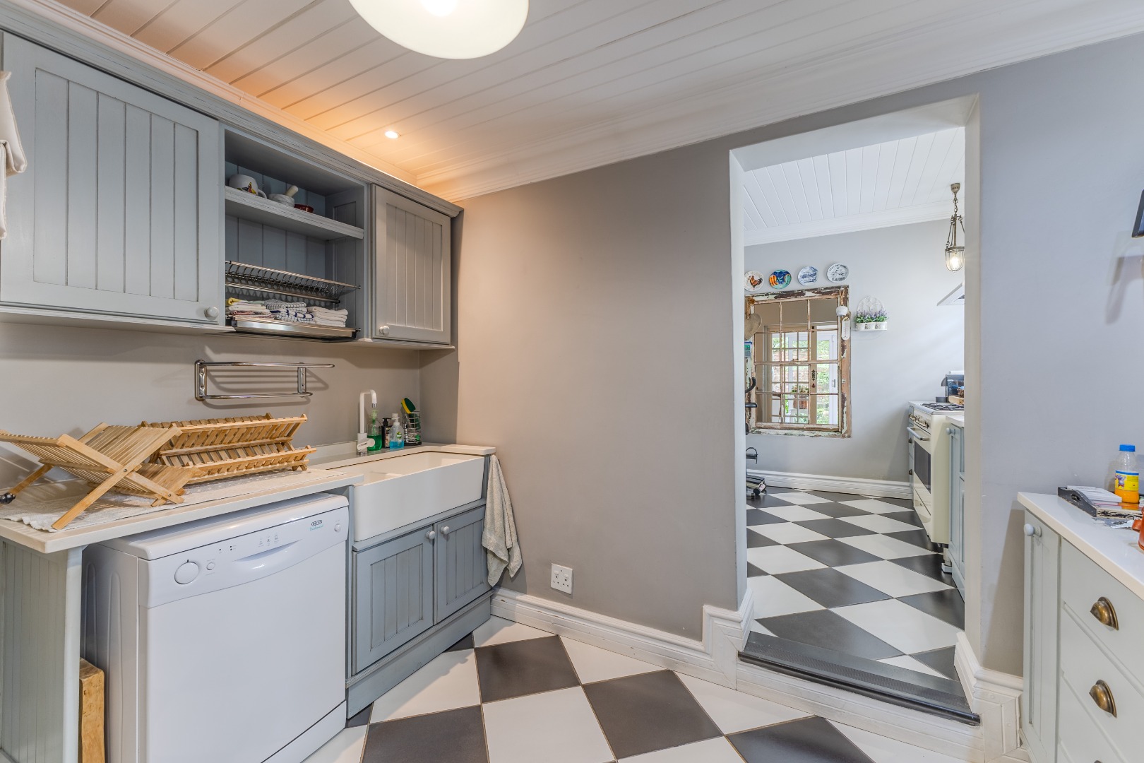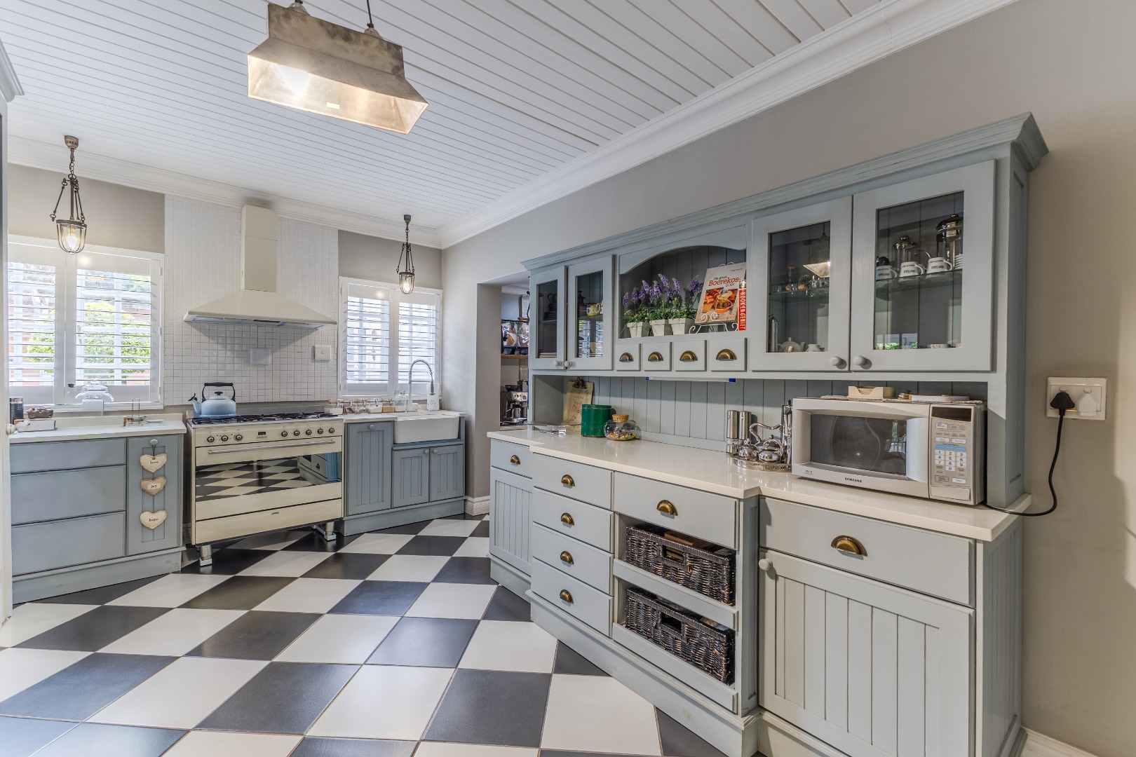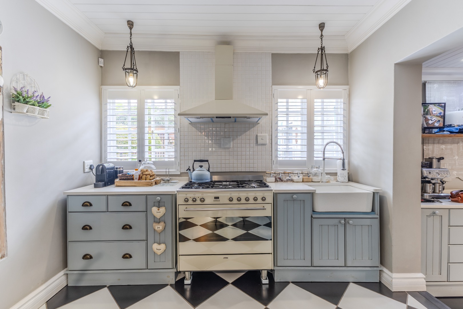 The well-appointed kitchen is a highlight, showcasing stylish light blue-grey cabinetry, a classic black and white checkered floor, and a farmhouse sink, all bathed in natural light. The residence comprises three comfortable bedrooms and four bathrooms, three of which are en-suite, ensuring privacy and convenience for all occupants.
