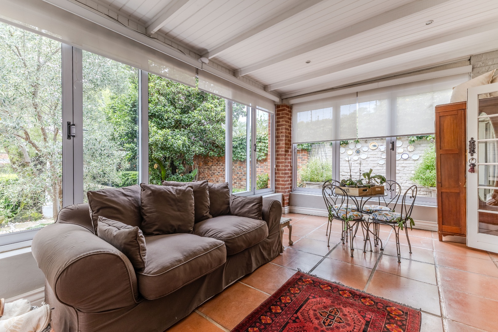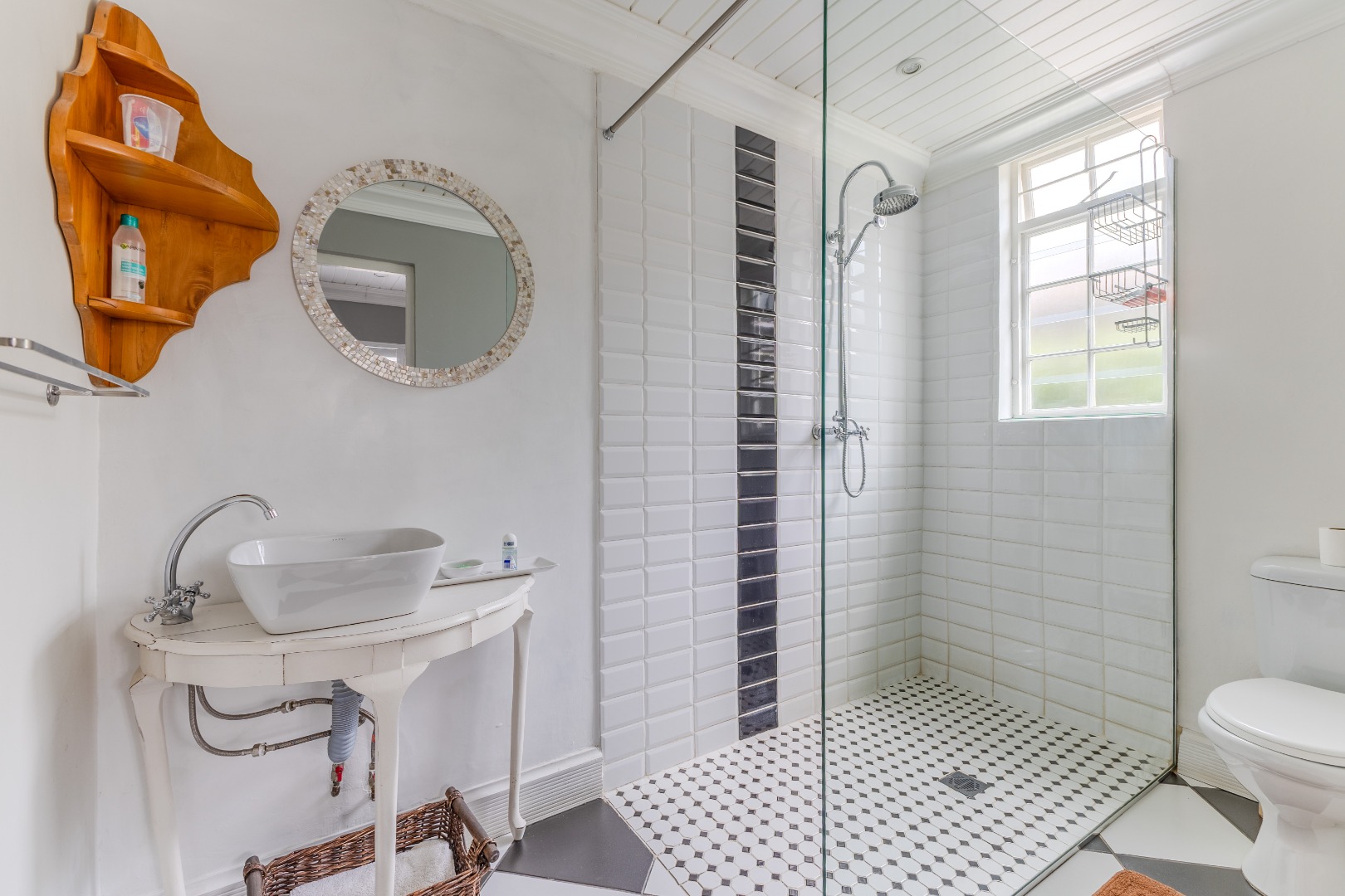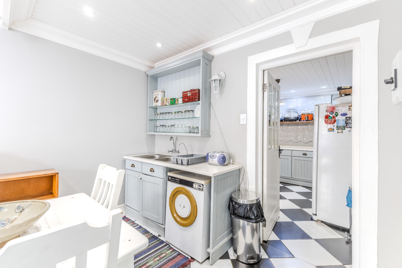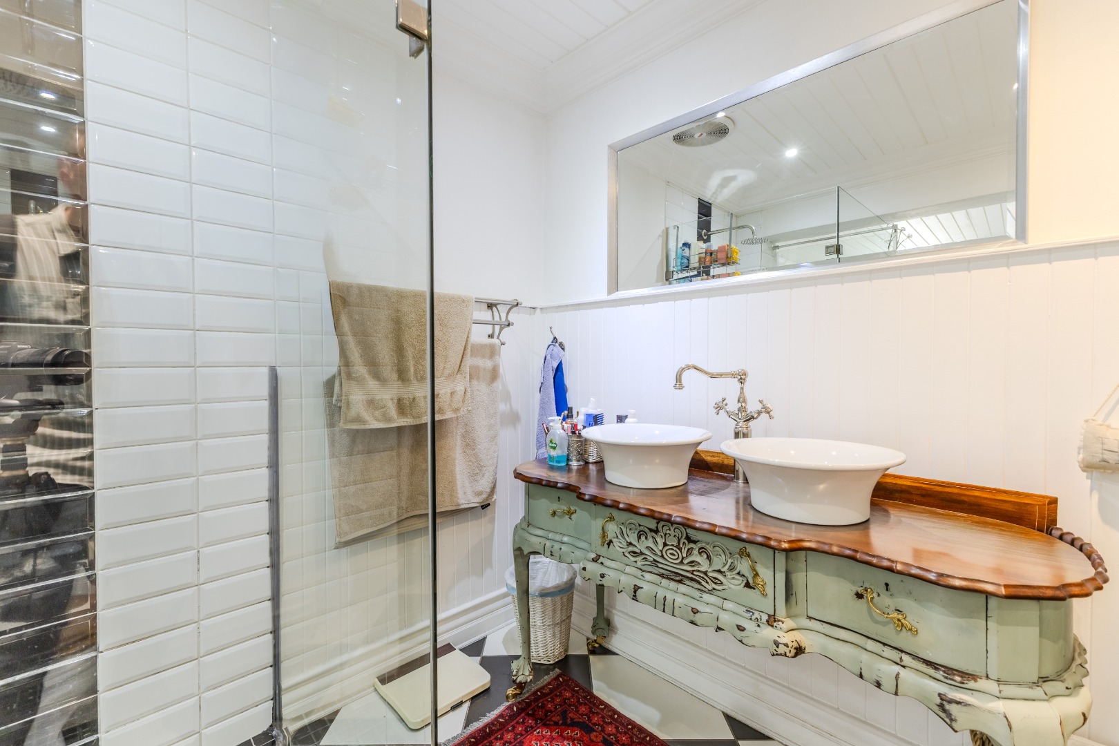 The well-appointed kitchen is a highlight, showcasing stylish light blue-grey cabinetry, a classic black and white checkered floor, and a farmhouse sink, all bathed in natural light. The residence comprises three comfortable bedrooms and four bathrooms, three of which are en-suite, ensuring privacy and convenience for all occupants.