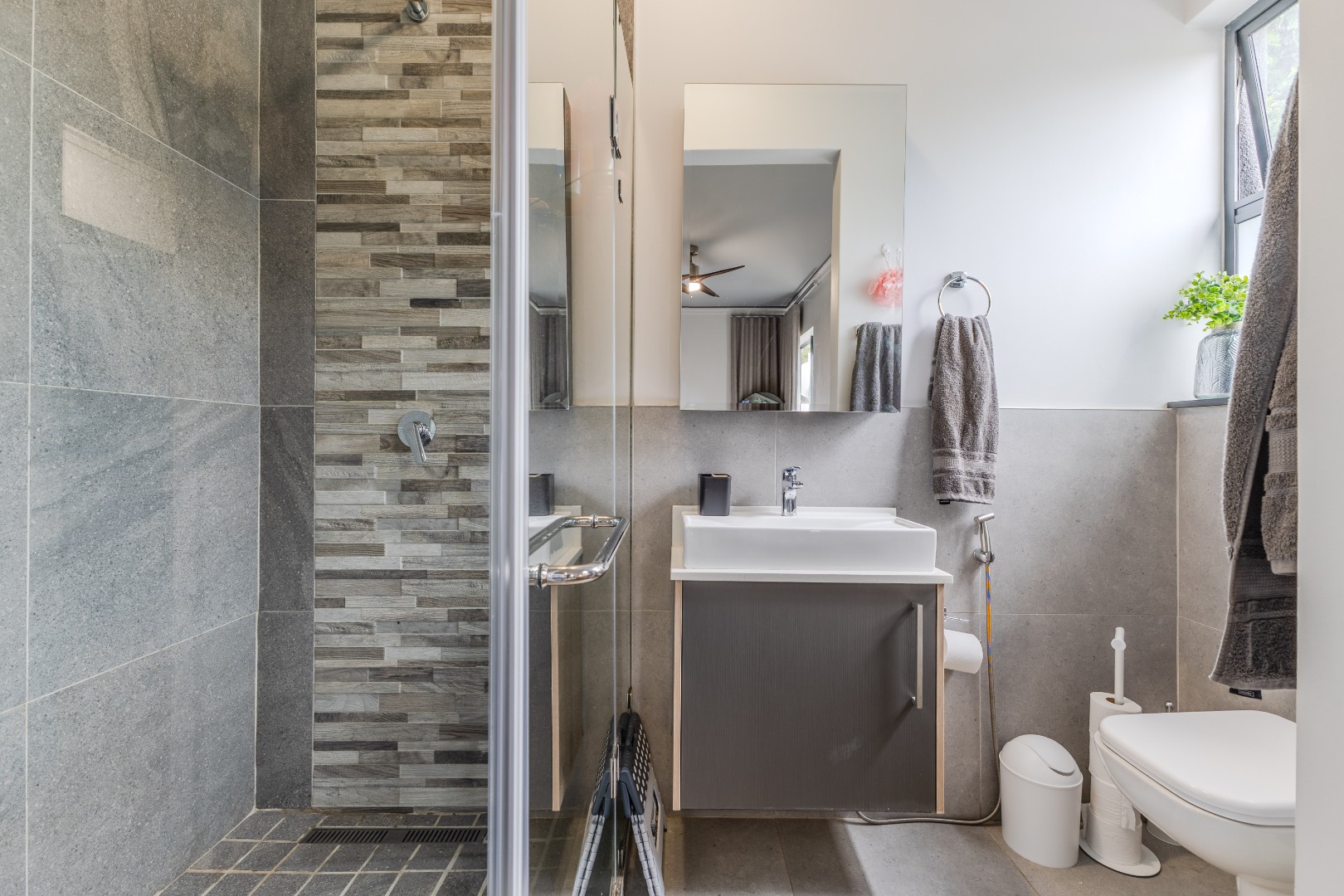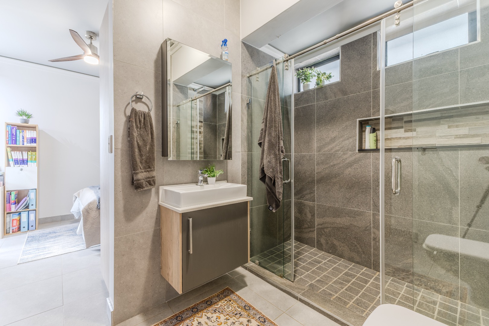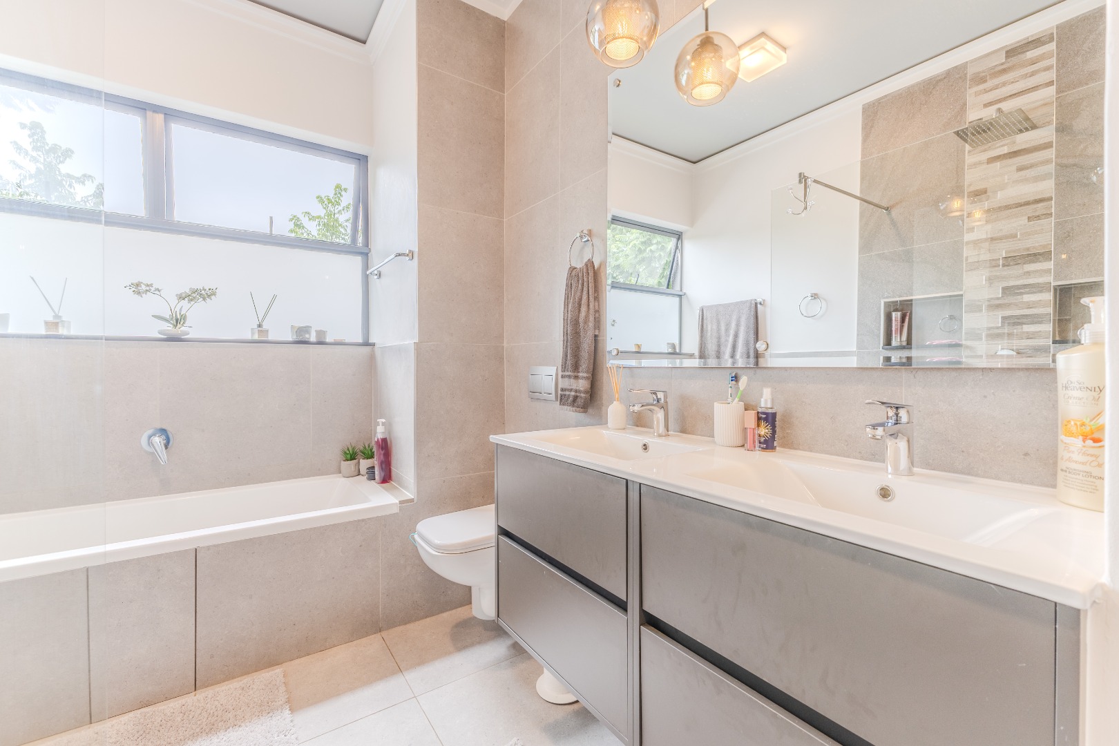 This residence features three spacious bedrooms, each designed for comfort and privacy. All three bedrooms benefit from their own modern en-suite bathrooms, providing convenience and a touch of luxury. The contemporary aesthetic extends throughout the home, including a stylish open staircase with a metal railing.