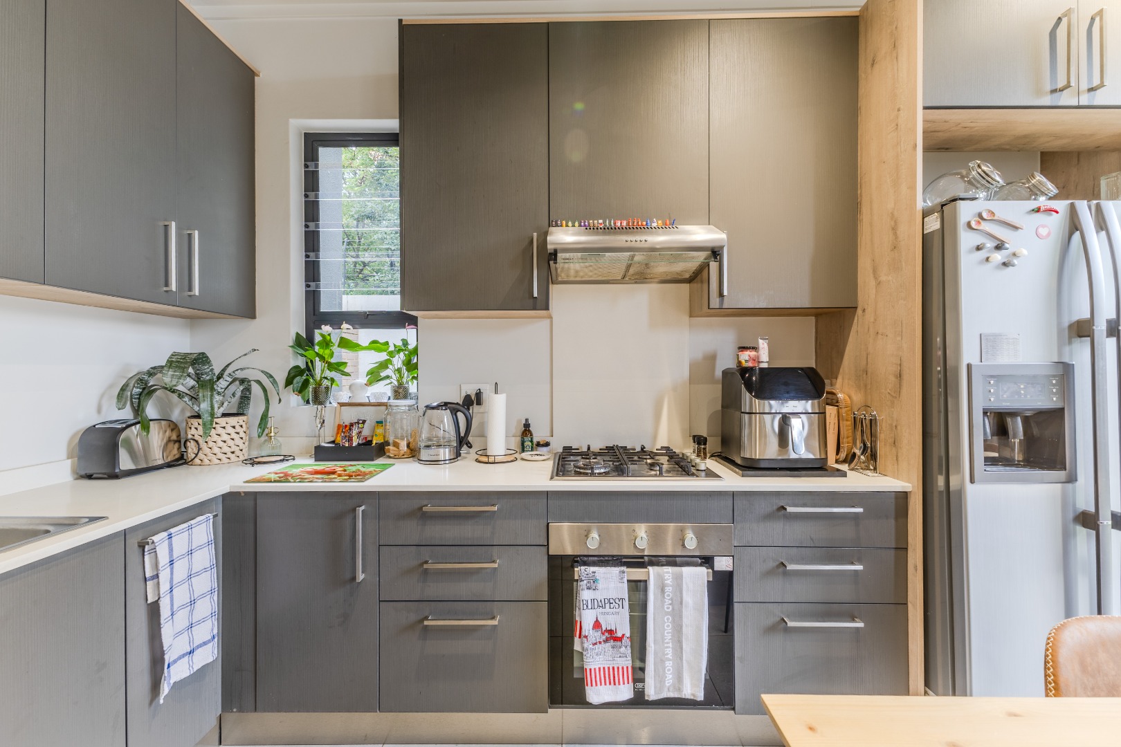 Step inside to an inviting open-plan layout that seamlessly connects the living spaces with a sleek, modern kitchen. The kitchen is equipped with dark cabinetry, stainless steel appliances, an integrated gas hob, and ample counter space, all illuminated by stylish track lighting. Large glass doors provide abundant natural light and offer direct access to a private garden, enhancing the indoor-outdoor flow.