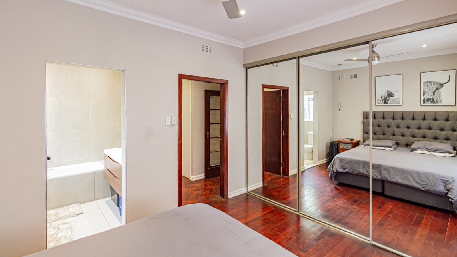The layout is anchored by elegant wooden floors, offering a warm and sophisticated atmosphere.