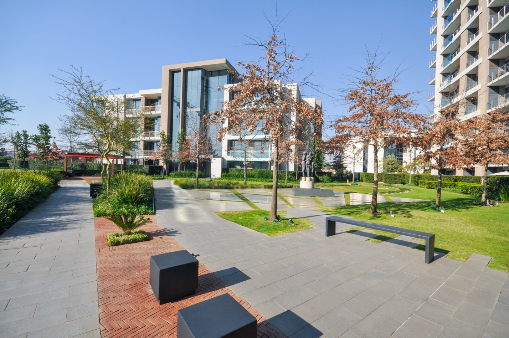 Discover sophisticated urban living in this modern 97 sqm apartment located in a sleek high-rise complex in Menlyn, Pretoria. The property boasts contemporary architecture with balconies and well-maintained landscaped gardens, offering an attractive kerb appeal in a vibrant metropolitan setting.