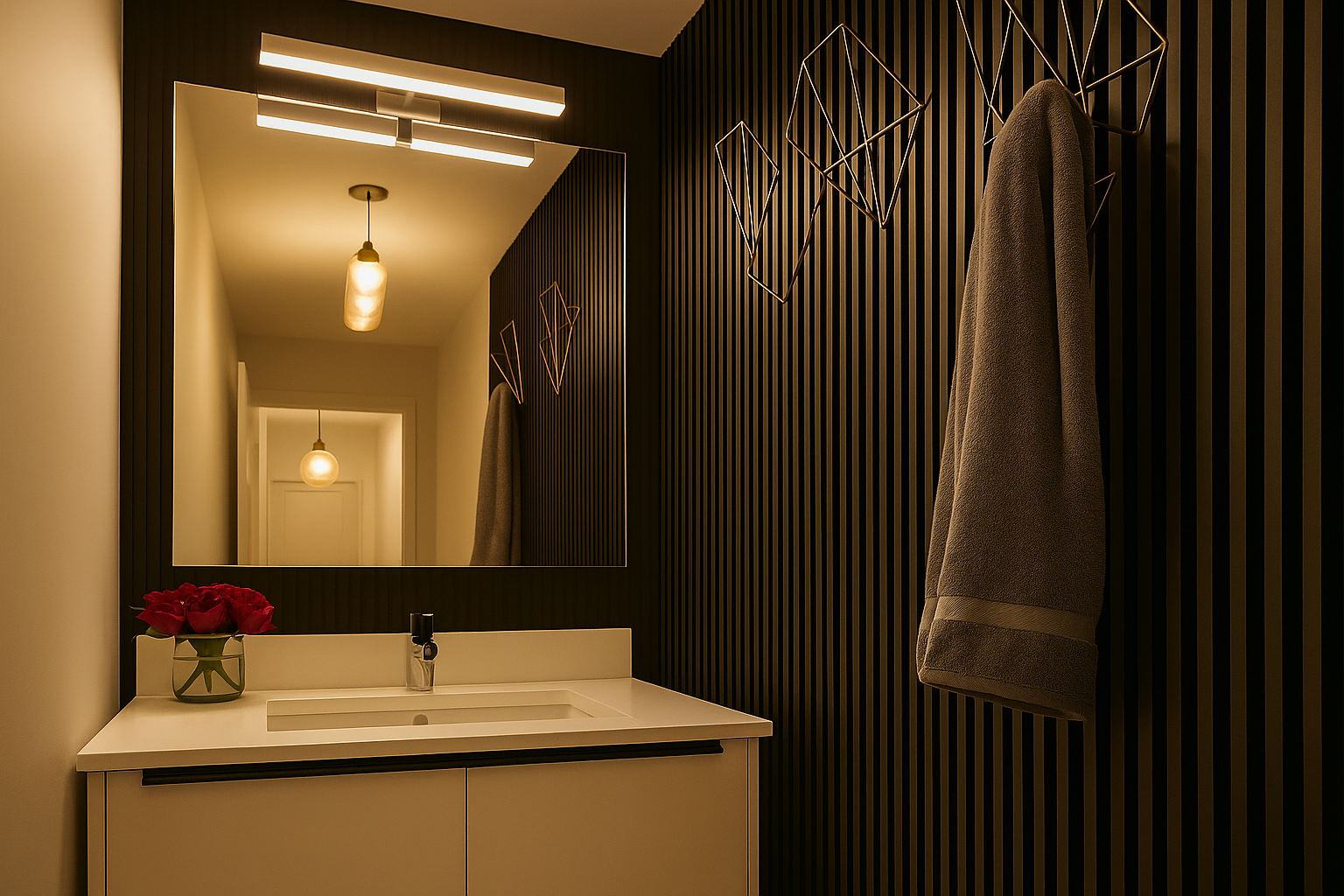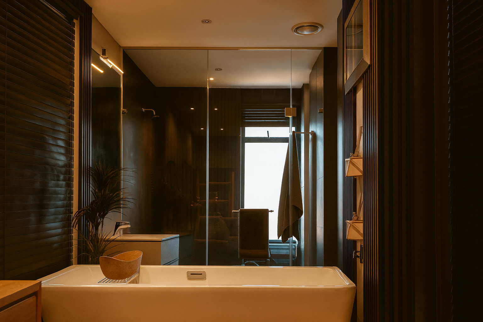 This apartment offers one spacious bedroom and 1.5 bathrooms, including a luxurious en-suite. The bedroom presents an unconventional yet serene space with a wooden four-poster bed and a freestanding white bathtub, creating a spa-like retreat. The modern bathroom features a glass-enclosed shower, sleek dark paneling, and a stylish vanity area with integrated lighting and a unique fluted accent wall, alongside a convenient guest toilet.